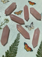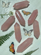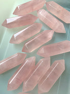 These polished Rose Quartz DT's are made from a luminous + gemmy pink high quality crystal. These chunky shaped, pink rose quartz double terminated points are made from high quality translucent Rose Quartz from Madagascar, about 2" long.