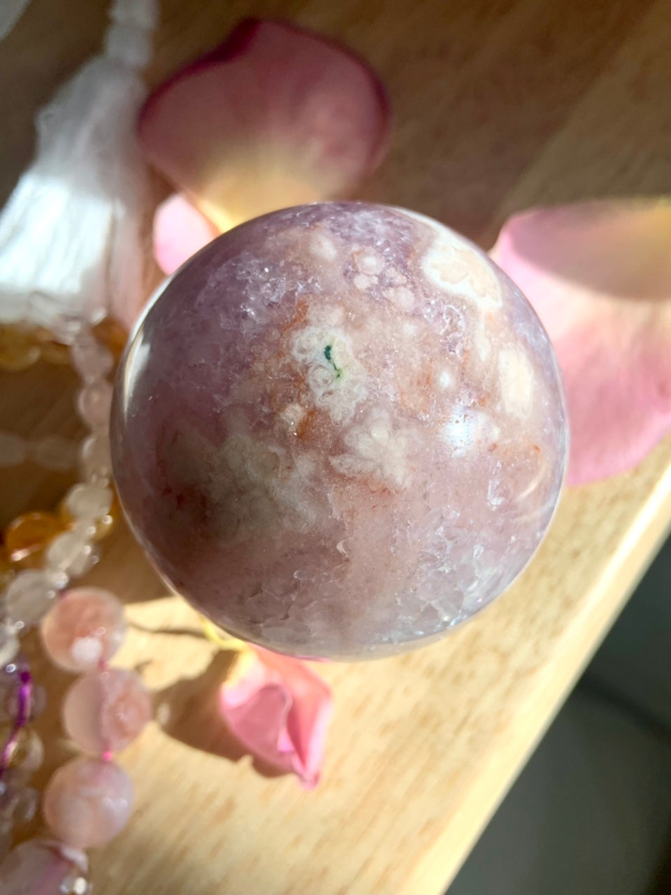 Sensuous + feminine, this gorgeous crystallized Amethyst Flower Agate Sphere has swirling creamy, coral + pink cherry blossoms + flowery orbs within a sparkly Amethyst Crystal matrix that captures the light in a such a voluptuous way.