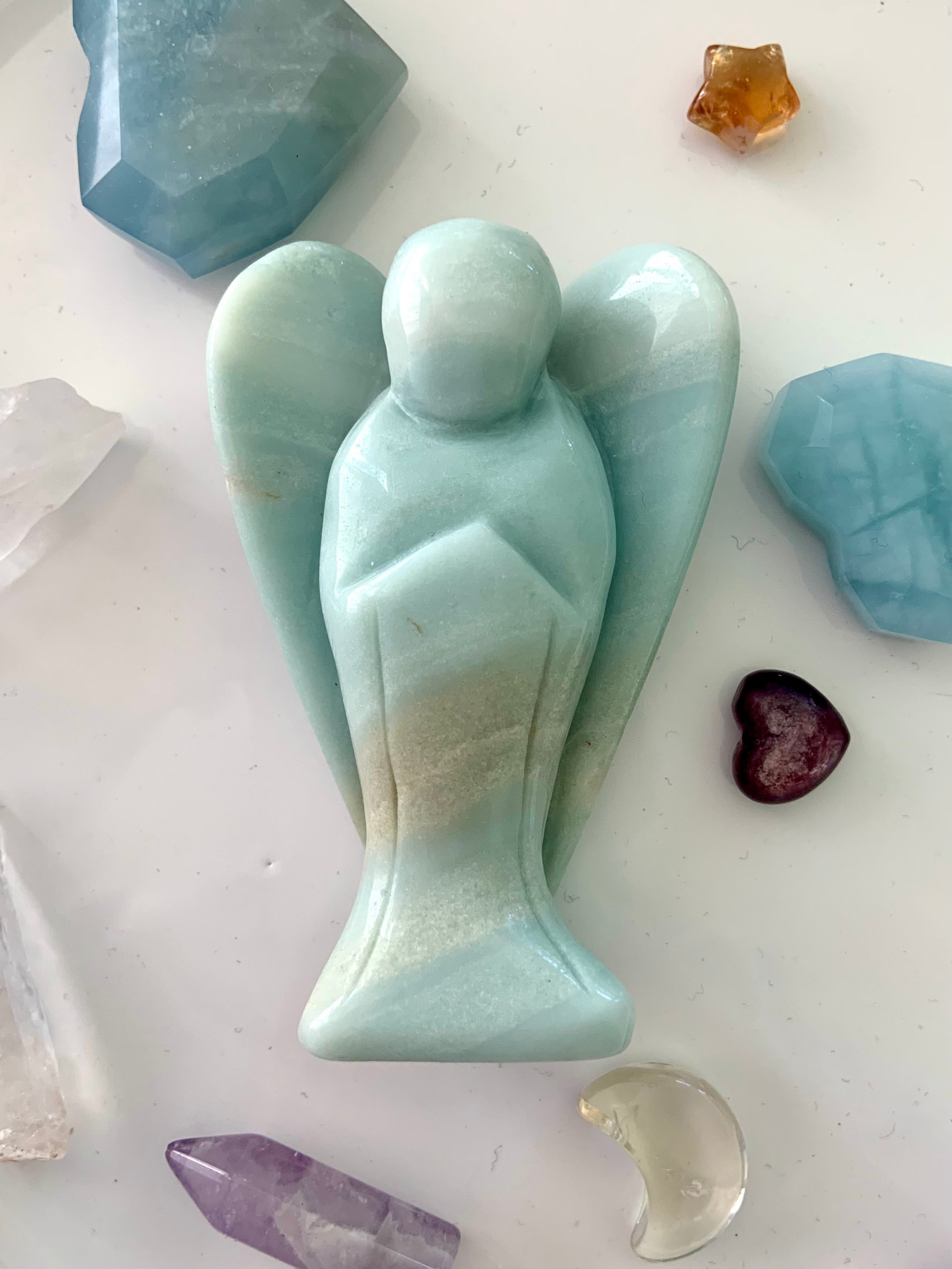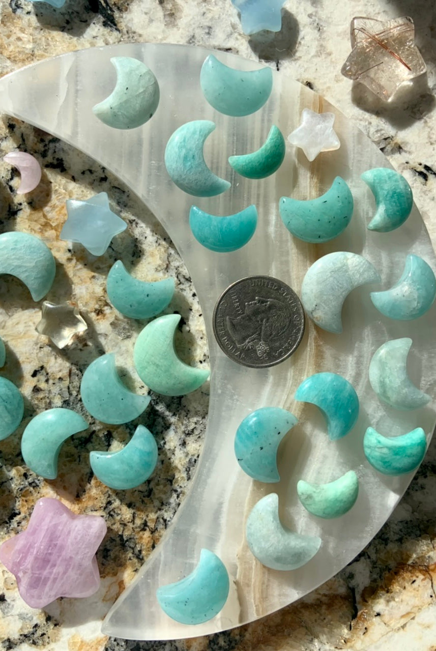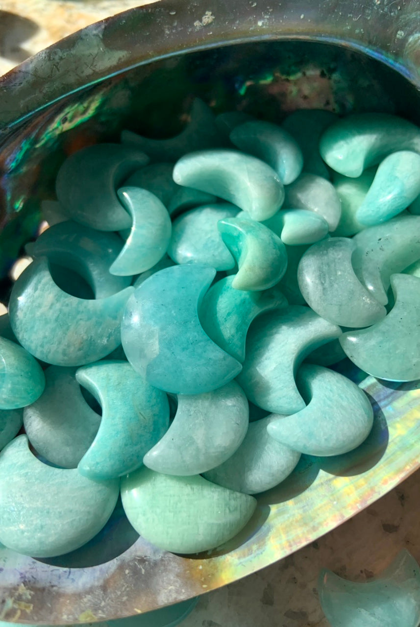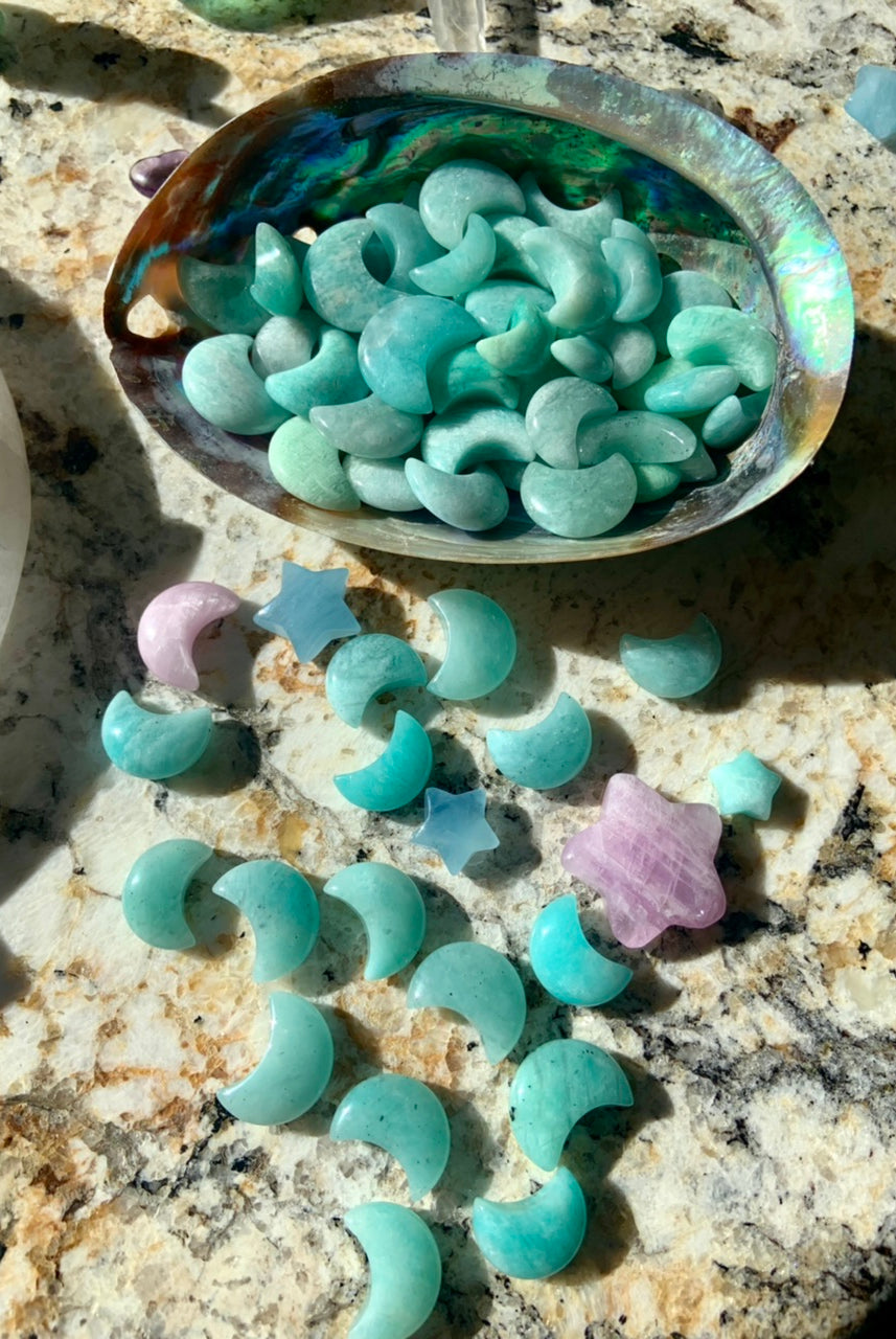 This collection includes Amazonite moons, stars, hearts, and our Heart Chakra Crystal Set, as well as high-quality Ice Amazonite bracelets. You’ll also find a rotating selection of one-of-a-kind spheres, dragons, angels, towers, and jewelry designed to support self-expression, confidence, and emotional clarity.