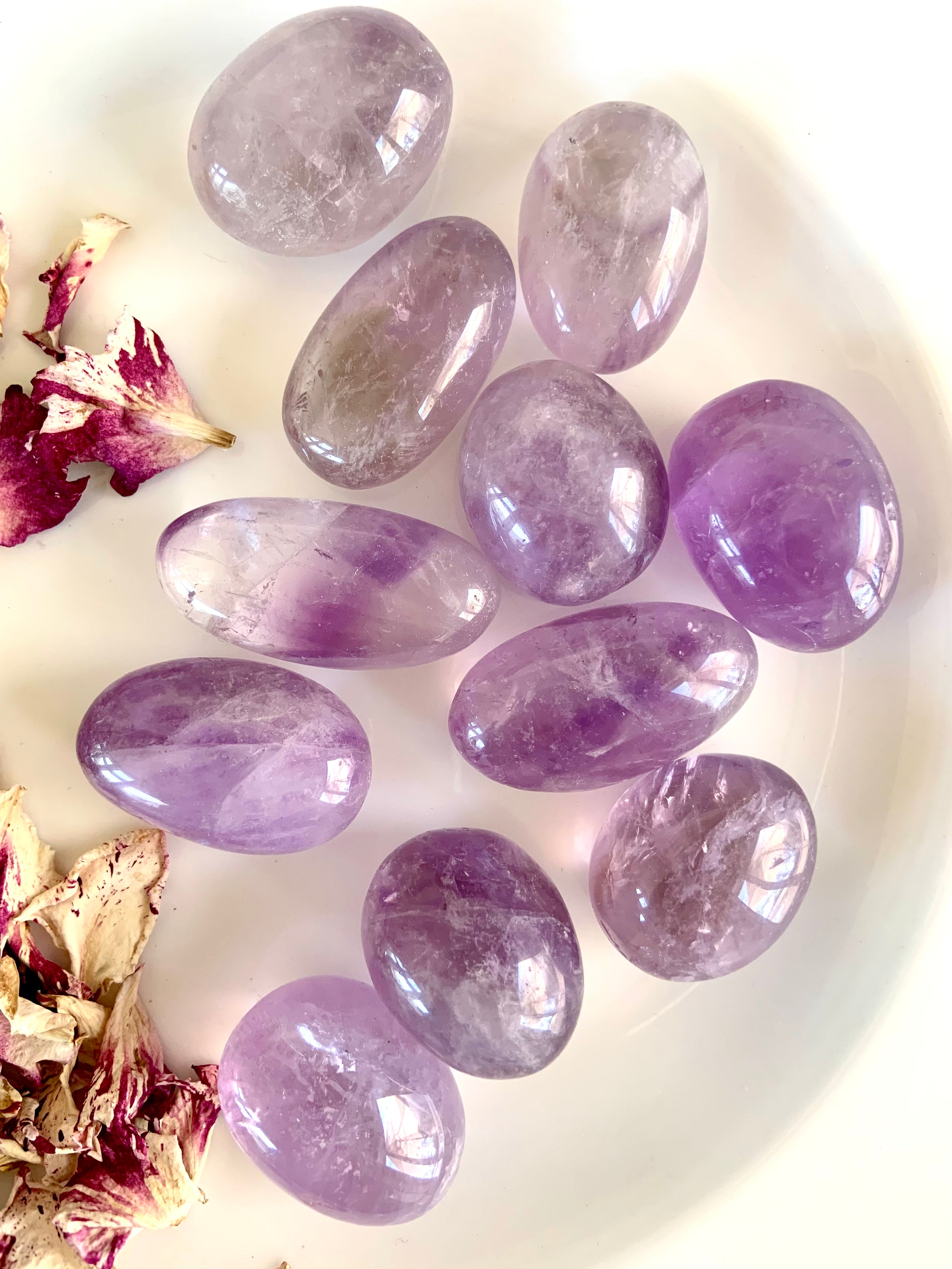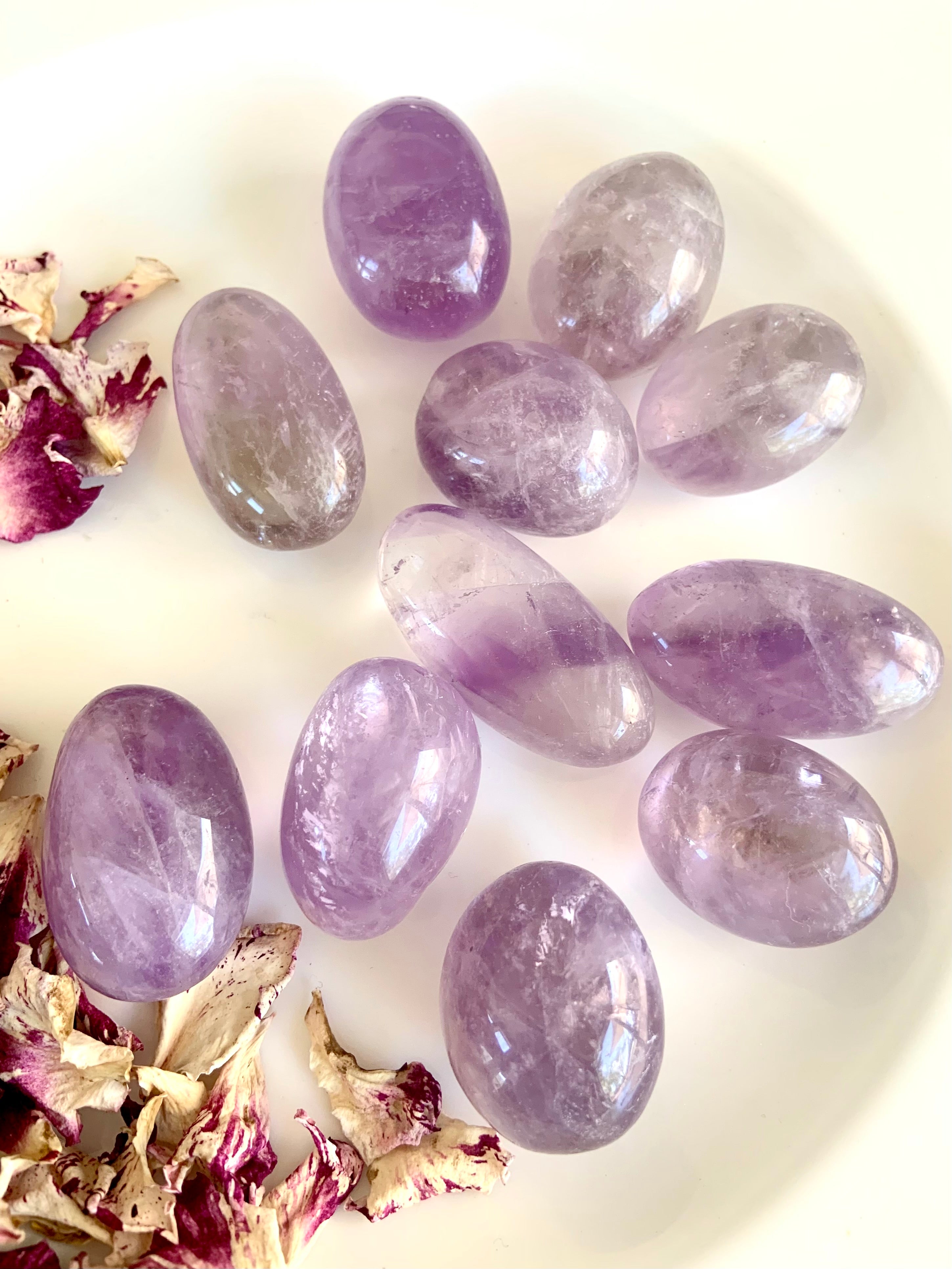 This batch of light purple amethyst crystal tumbles has a rounded irregular shape + each one is different. They're quite beautiful, but durable + easy to carry as a travel crystal.