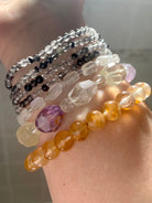 The pics with a mixed stack include the 4mm Black Tourmaline in Quartz, White Moonstone Rectangles + 9mm Golden Healer bracelets, which are also available in our shop.