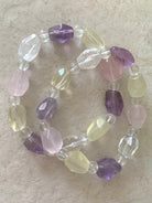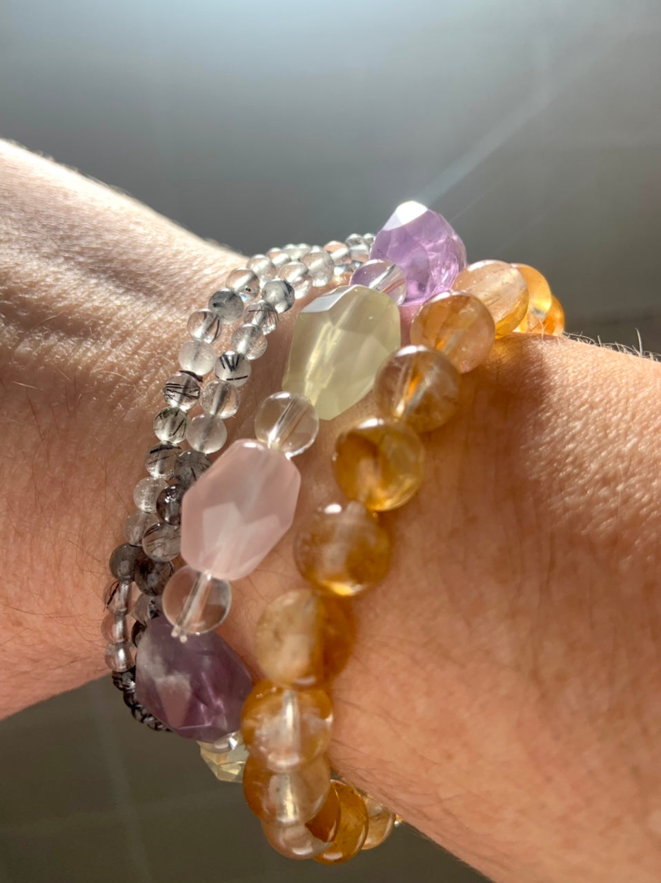 Wearing beautiful gemstone jewelry truly helps me feel like a Goddess. This bracelet is made with chunky freeform faceted Amethyst, Rose Quartz, Clear Quartz + Citrine beads with round Clear Quartz spacers.