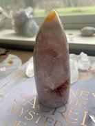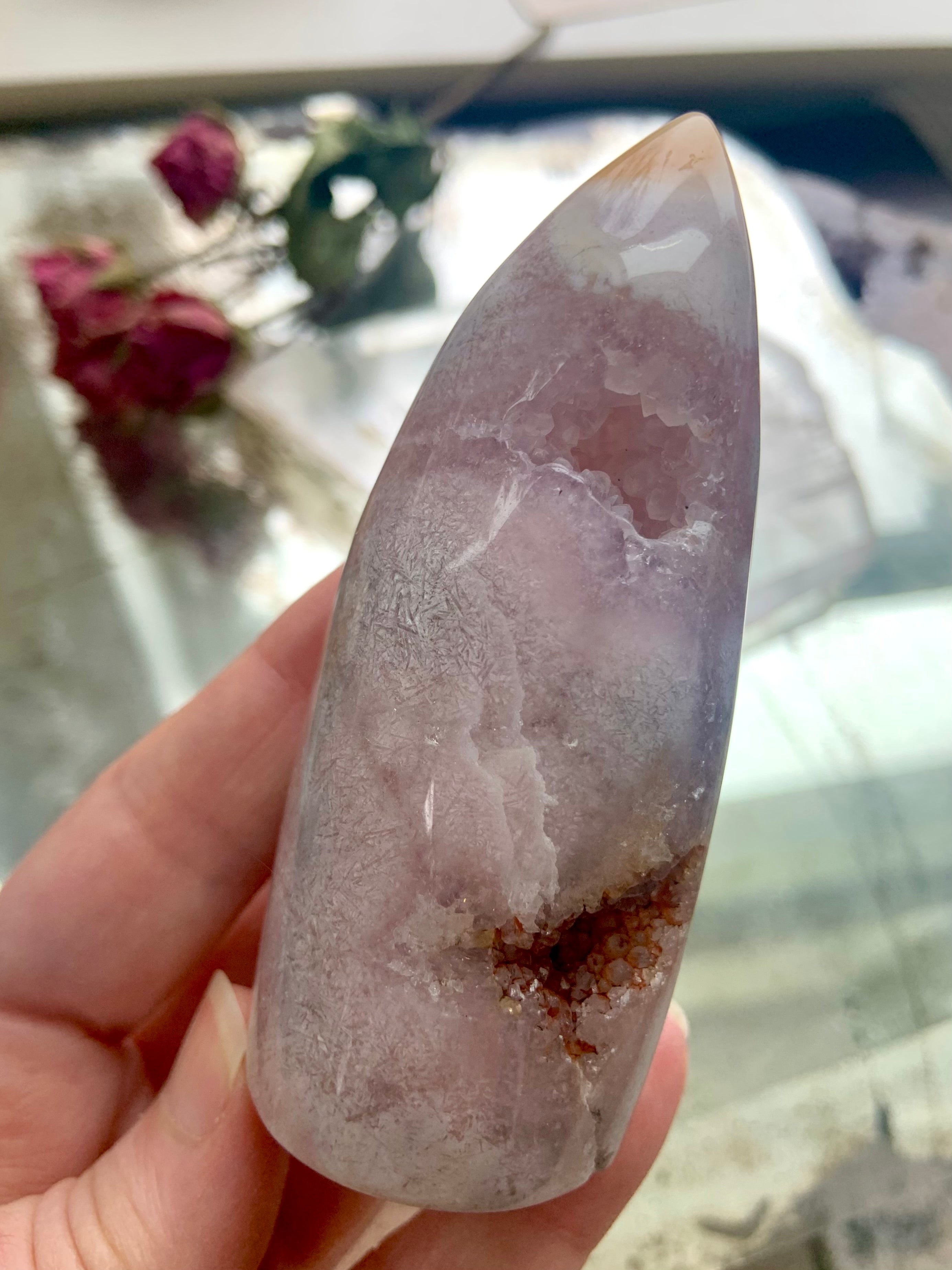 This smooth polished, rounded freeform tower looks different + beautiful on all sides with a slight lean depending on which side you have facing forward. It has some natural druzy caves + holes as well as natural lines in the stone which is a common in both pink amethyst + flower agate adding dimension + character to the natural crystal.