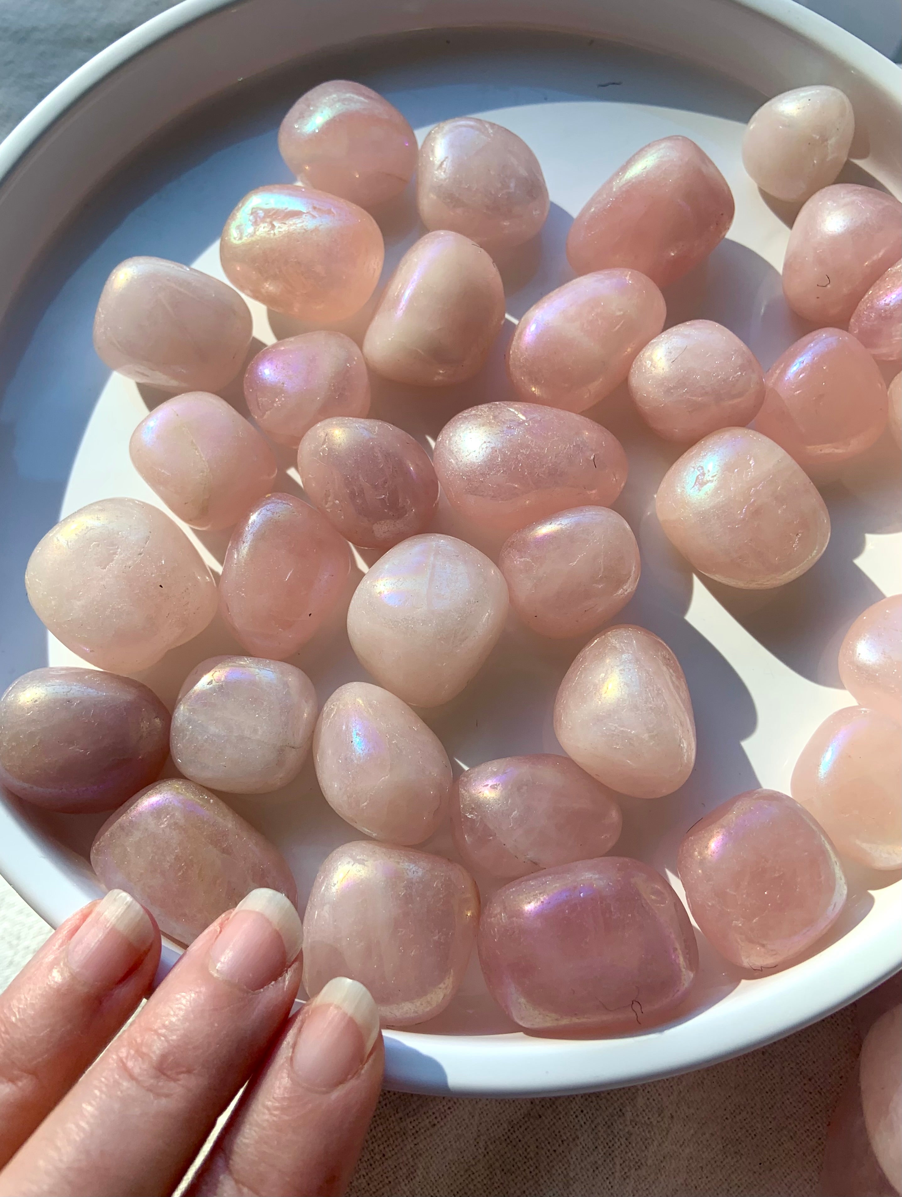 Each aura rose tumble is a sparkly pink ranging from clear to opaque, each uniquely beautiful in their own way. They vary in color hue/saturation, interior patterns + clarity/opacity + may have some imperfections as shown in the photos.