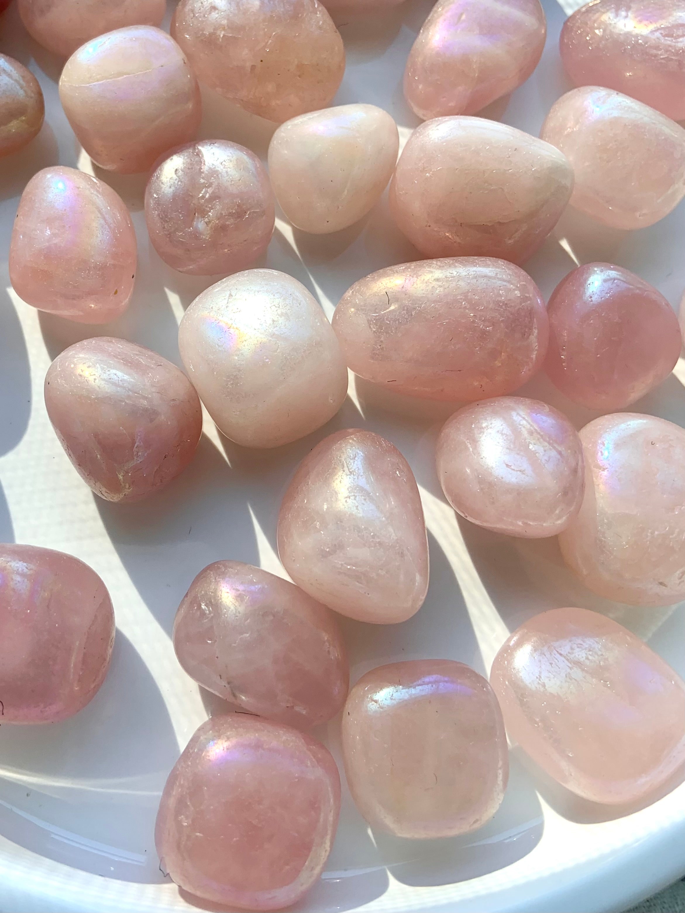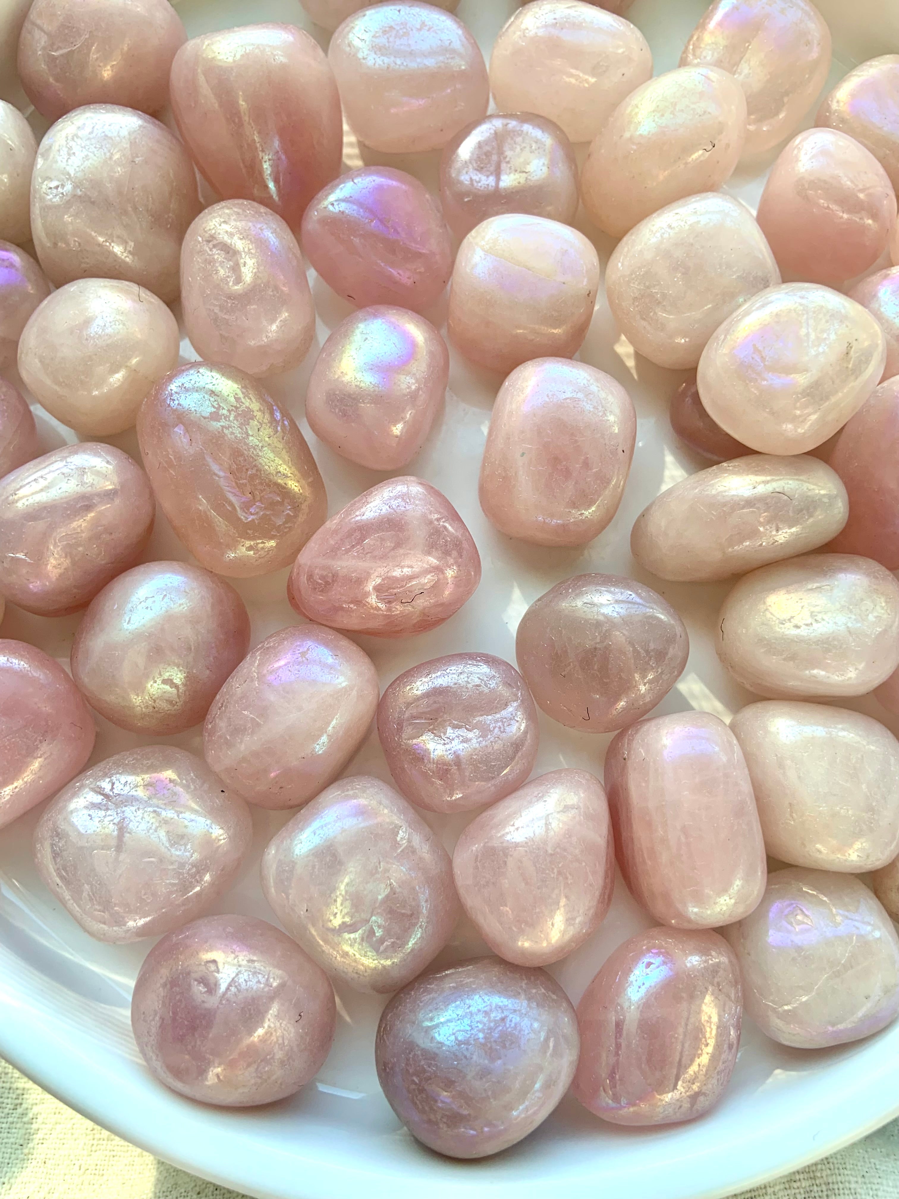 A sweet, angelic + loving energy radiates from these opalescent Aura Rose Quartz Tumbles. Angel Aura Rose Quartz is a stone of unconditional love + compassion. Use these pink crystal tumbles in your healing crystal grid layouts, carry as a pocket stone, or send one to a friend who could use a little love. Listing is for 1, 2 or 4 pink aura rose quartz crystal tumbled stones from the batch that you see in the pictures.