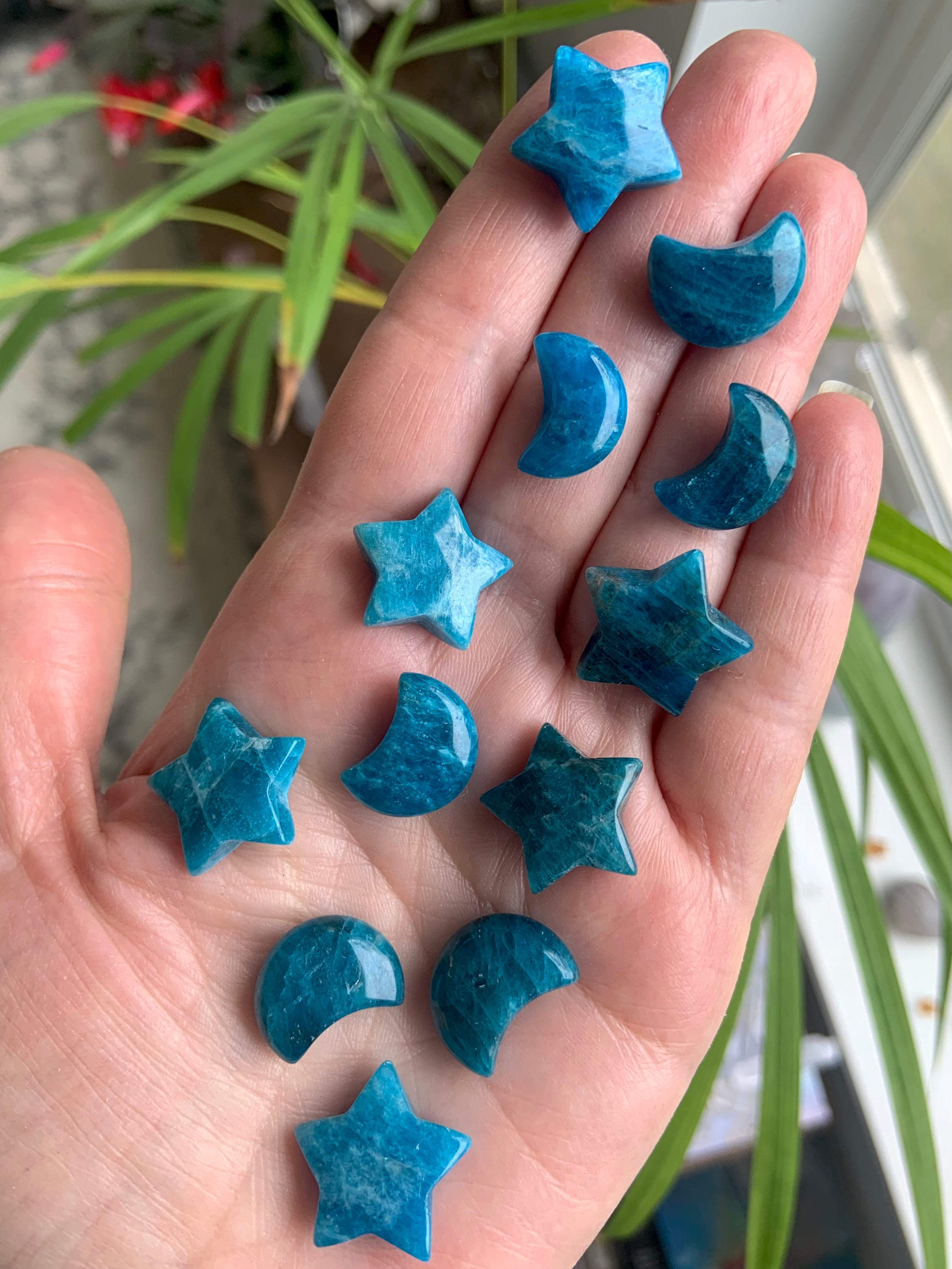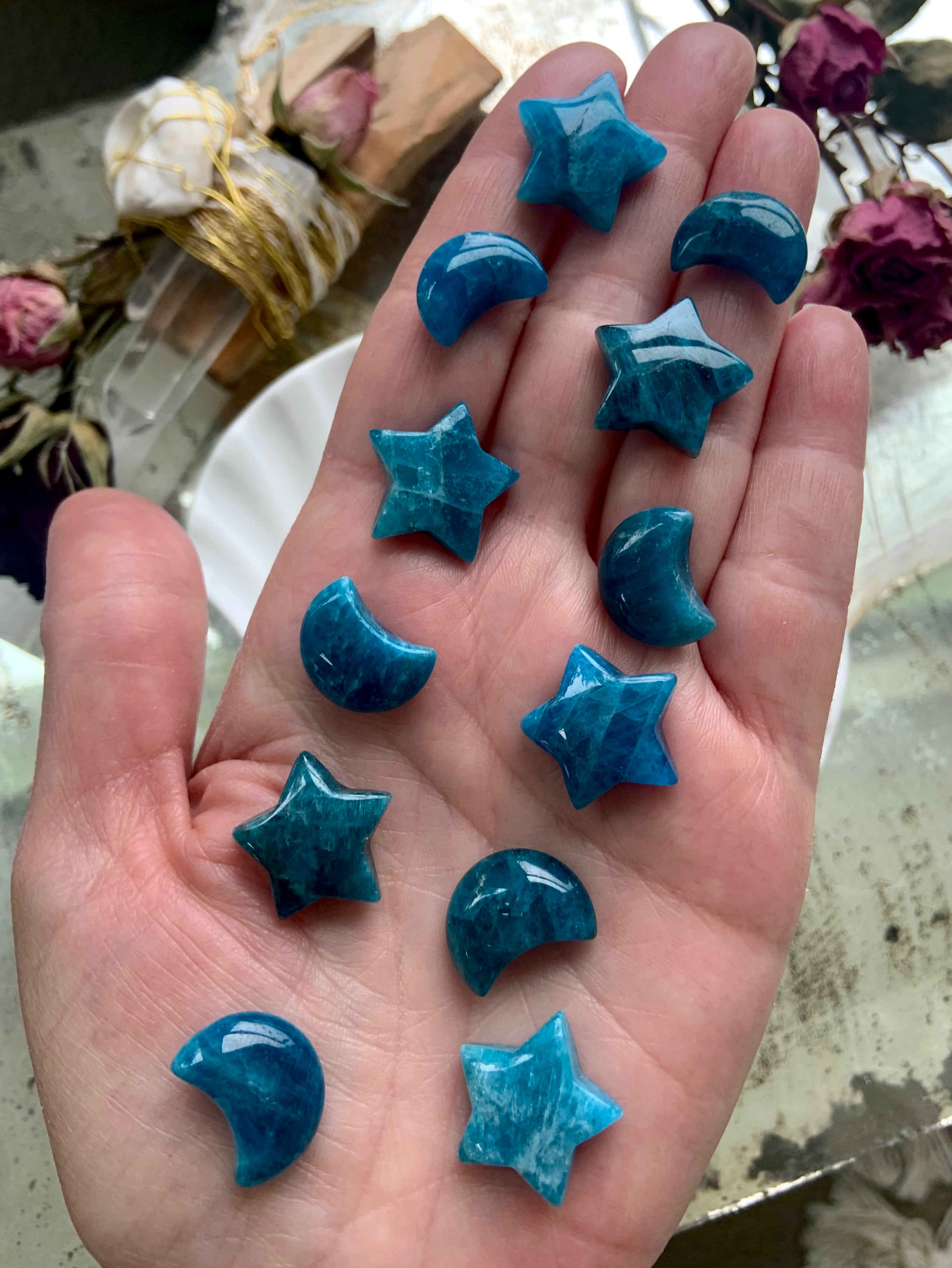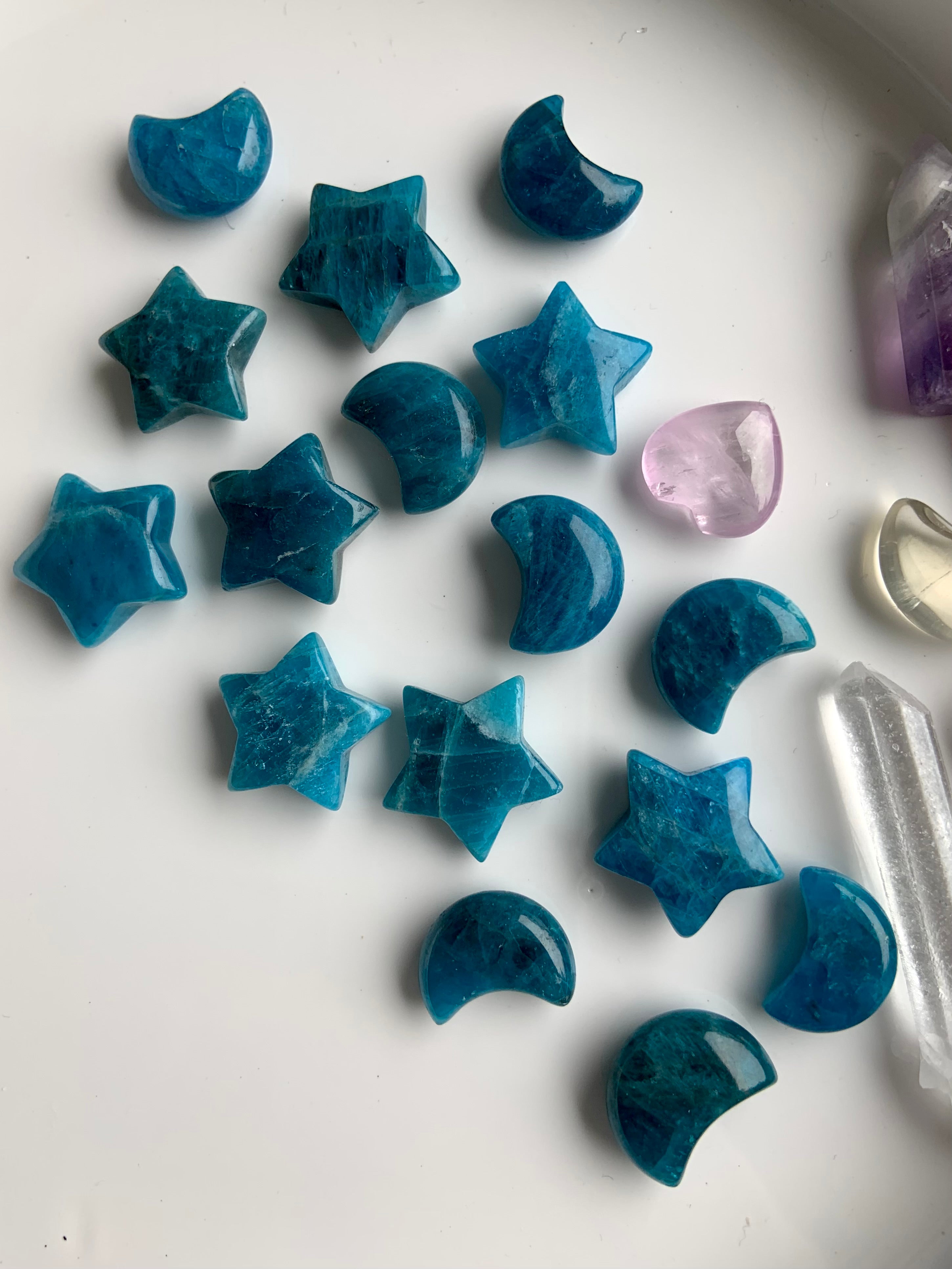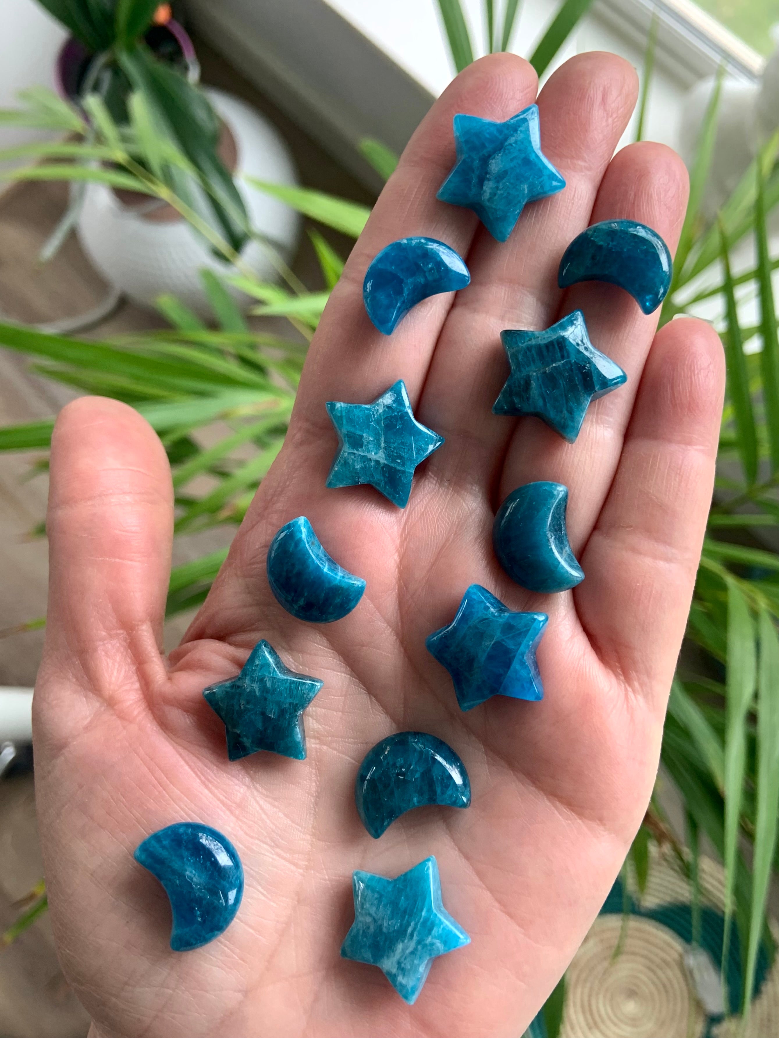 Our Blue Apatite collection features best-selling mini moons, stars, and hearts—alongside beaded bracelets, necklaces, and sacred treasures like our Mermaid Crystal Confetti. You'll also find a rotating selection of one-of-a-kind palmstones, polished freeforms, spheres, and towers, perfect for meditation, altar work, or energetic alignment.