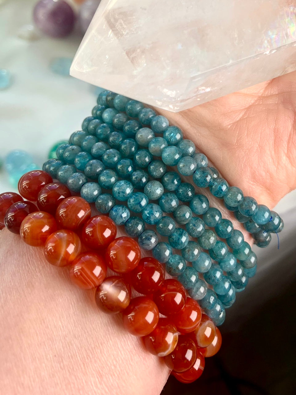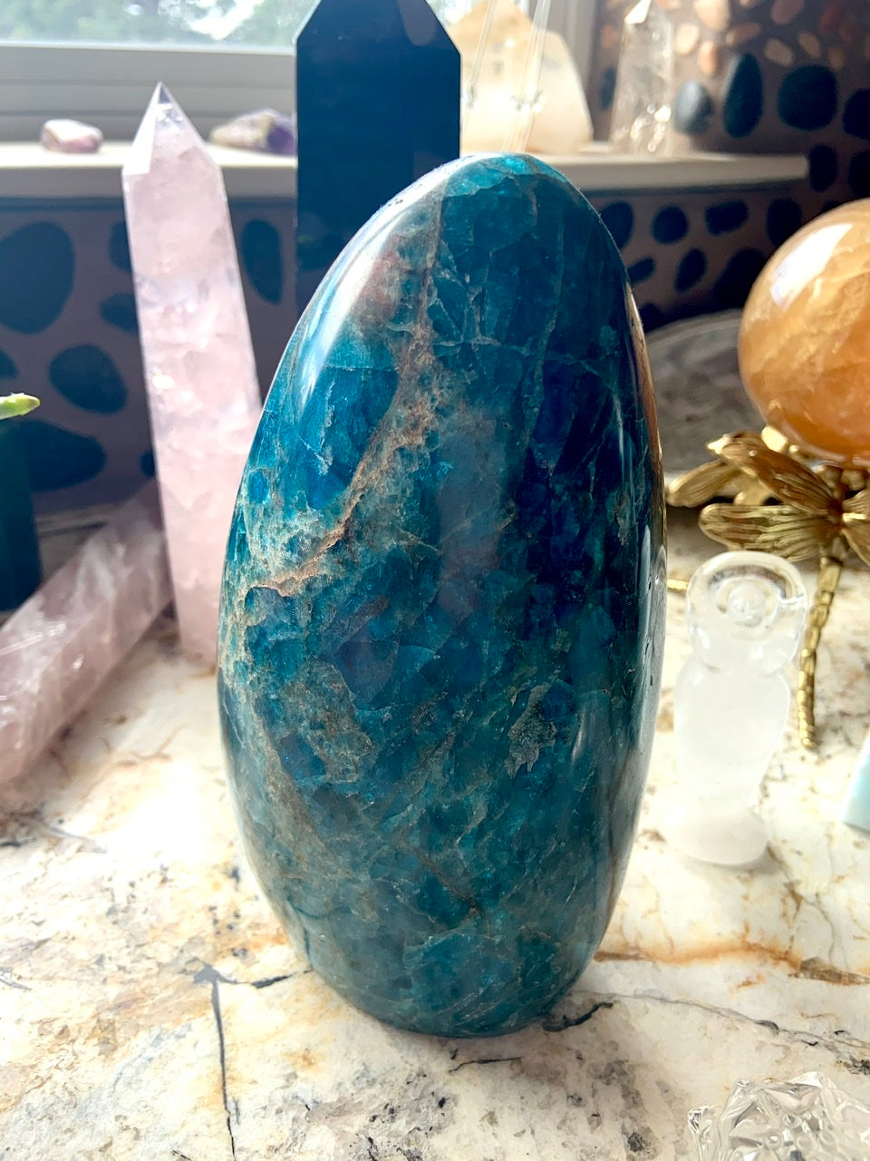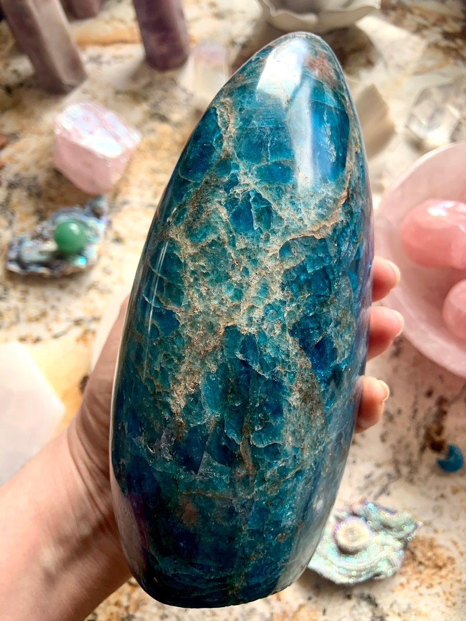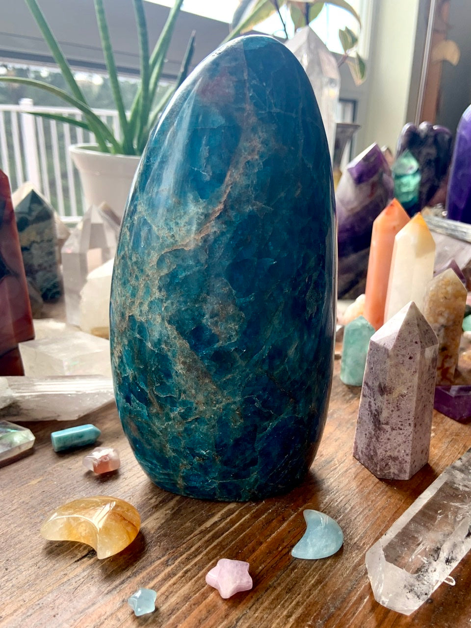 Our Blue Apatite collection features best-selling mini moons, stars, and hearts—alongside beaded bracelets, necklaces, and sacred treasures like our Mermaid Crystal Confetti. You'll also find a rotating selection of one-of-a-kind palmstones, polished freeforms, spheres, and towers, perfect for meditation, altar work, or energetic alignment.