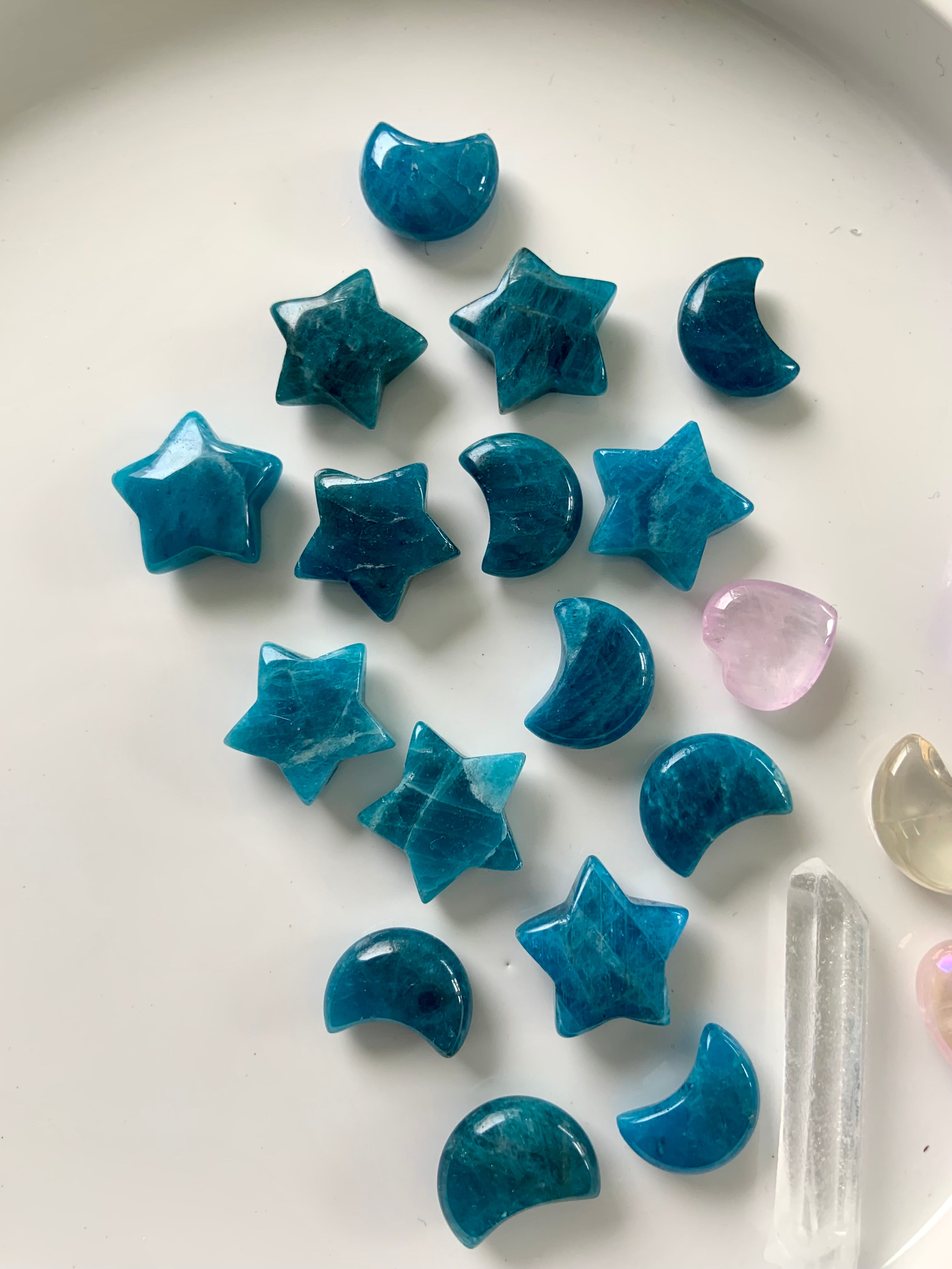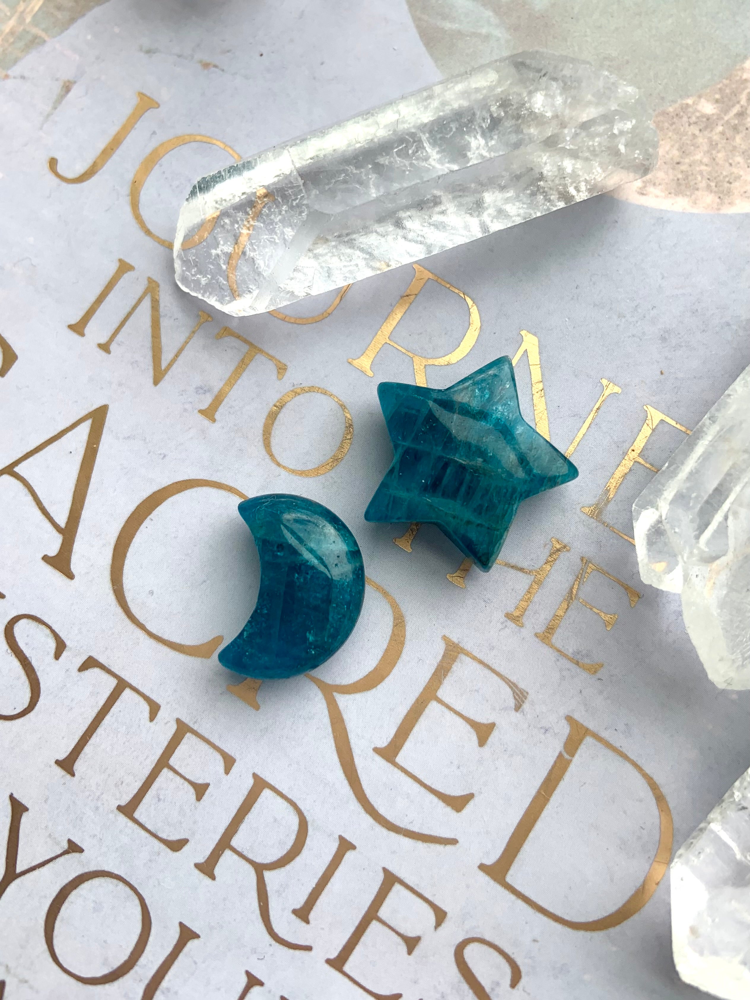 Add a set of mini Blue Apatite Moon and Stars to your crystal collection! Use these mini celestial crystals in your crystal grids, moon rituals, moon phase decor, or just floating in your jewelry box.