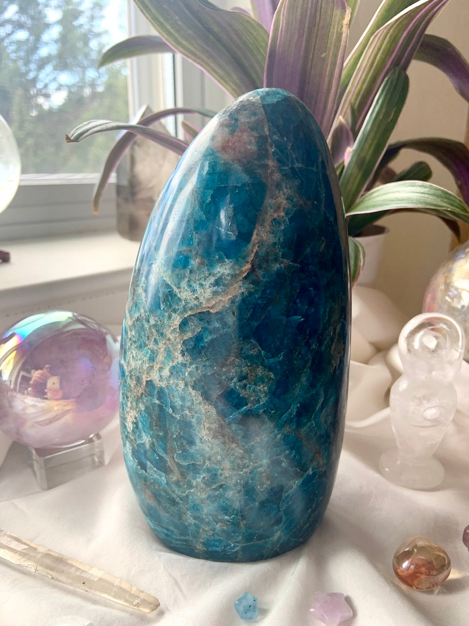 Bring this stunning XL Blue Apatite Freeform into your sacred space for it's shimmering blue color + profound Throat Chakra Healing energy.