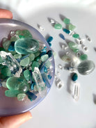 Colorful blue green Crystal Confetti is a fun way to add variety to your crystal collection, bring some energetic sparkle to a color story, and it makes a thoughtful gift too. I love crystals and gems in all colors, shapes, and sizes. These tiny blue-green crystals look so pretty together, like glittering magical mermaid sand!