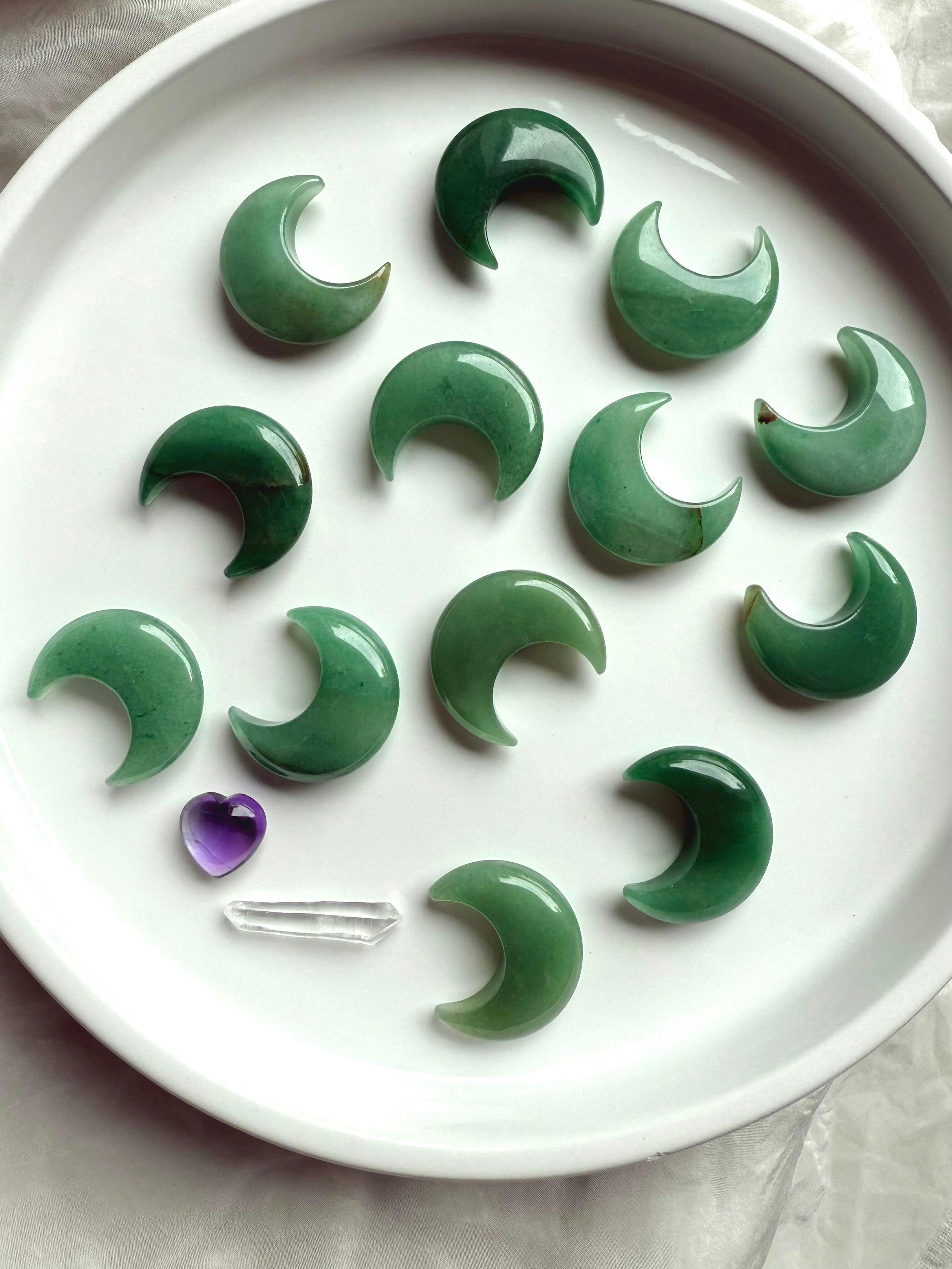 Green Aventurine Crescent Moons – Crystals for Love, Luck + Abundance