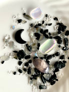 Our Moon Phase Crystal Confetti is a blend of black tourmaline, shungite, labradorite, and clear quartz crystal chips with a black obsidian moon carving. Or choose the bigger option with tumbles including opal aura and black flower agate with rough black tourmaline crystals mixed in with the chips and obsidian crescent moon, and add a cute heart bowl to make a great gift.