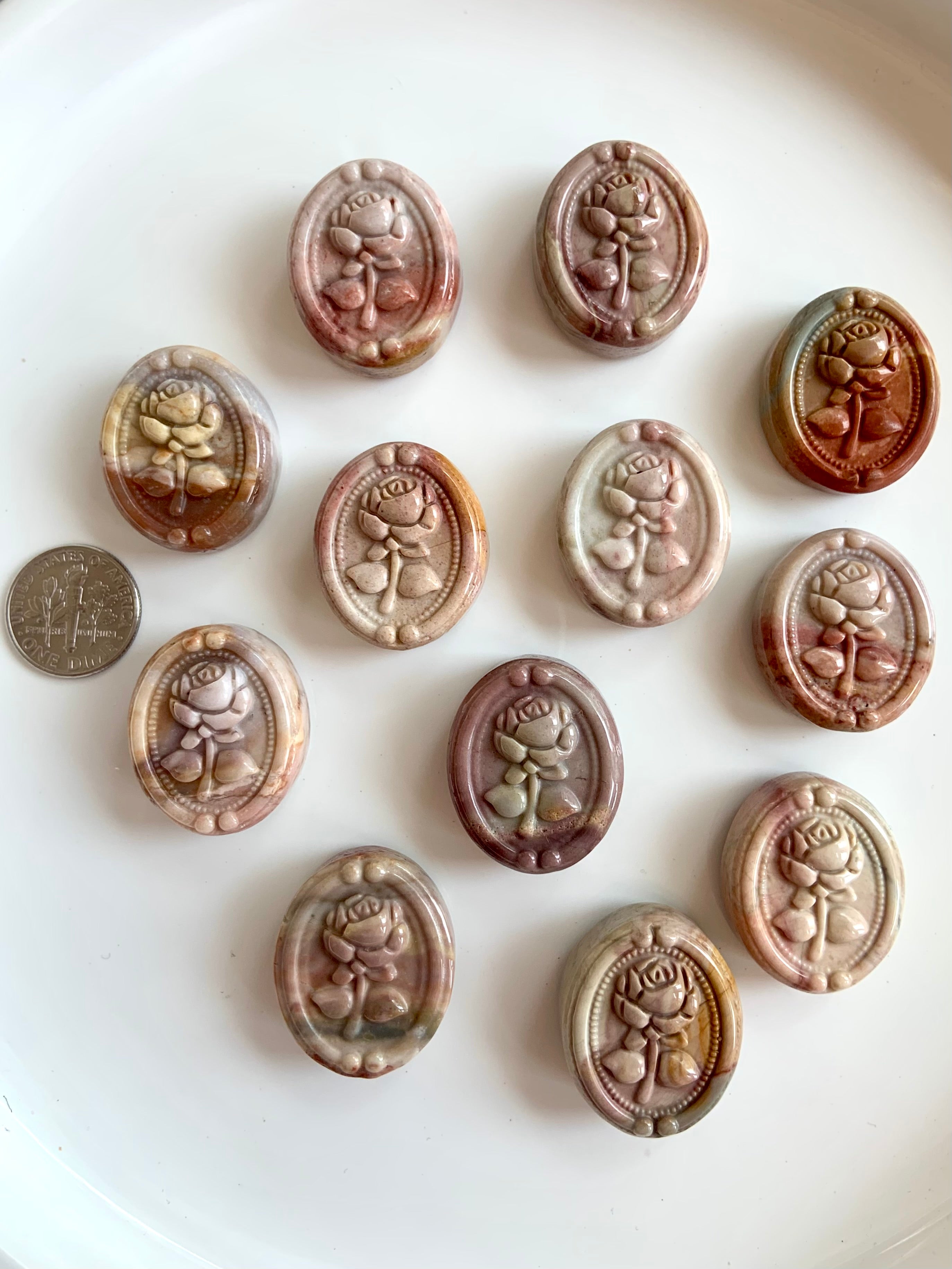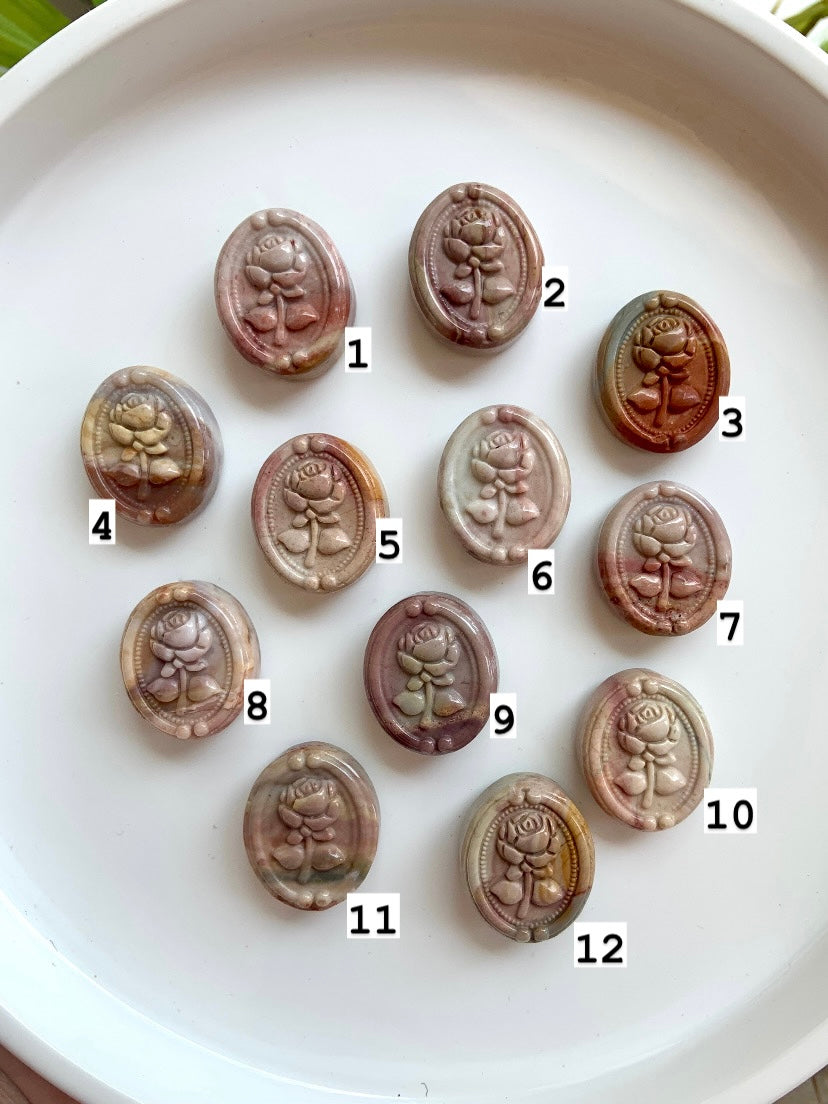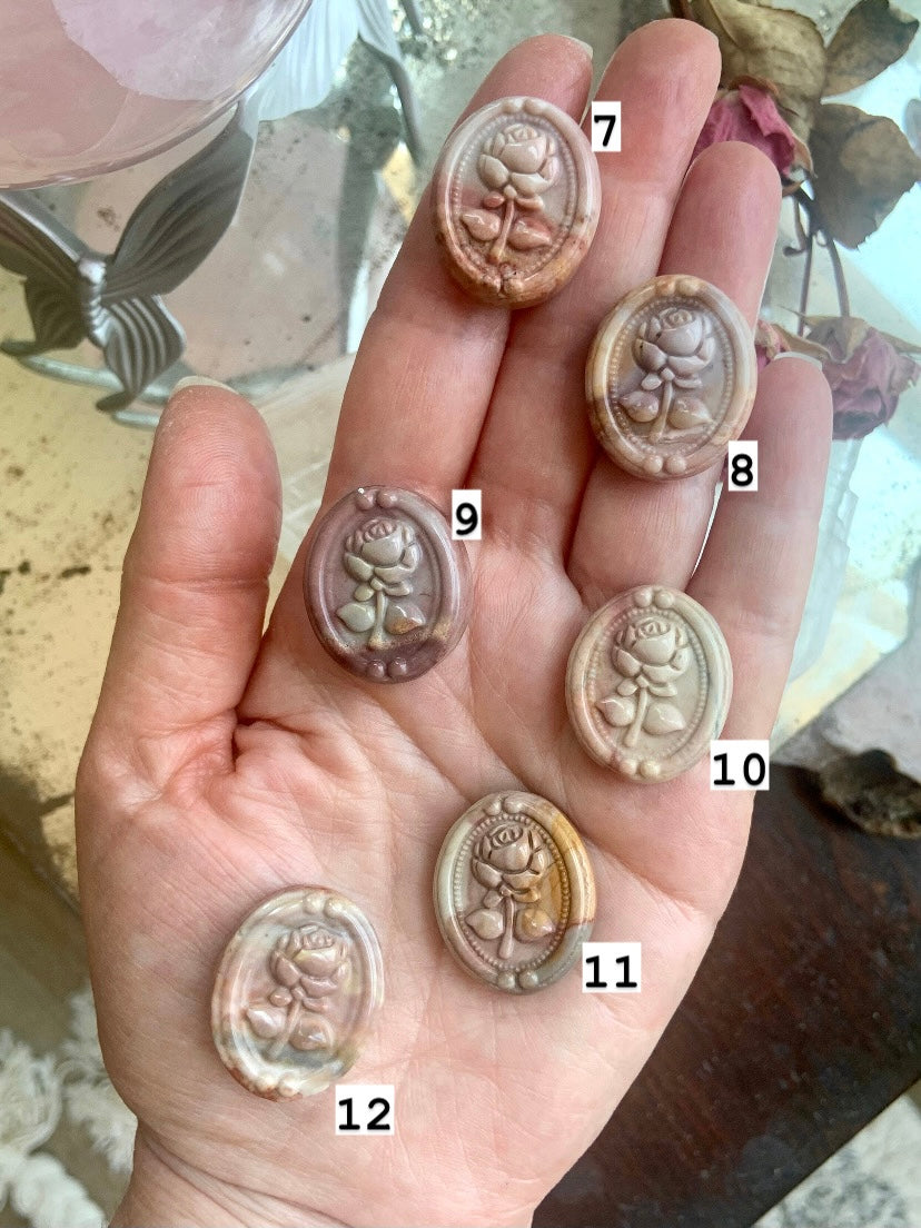 These Alashan Agate Flowers have beautifully detailed bas relief carving on the front with a flat back. There are just twelve to choose from + each stone rose is one of a kind, size details below.