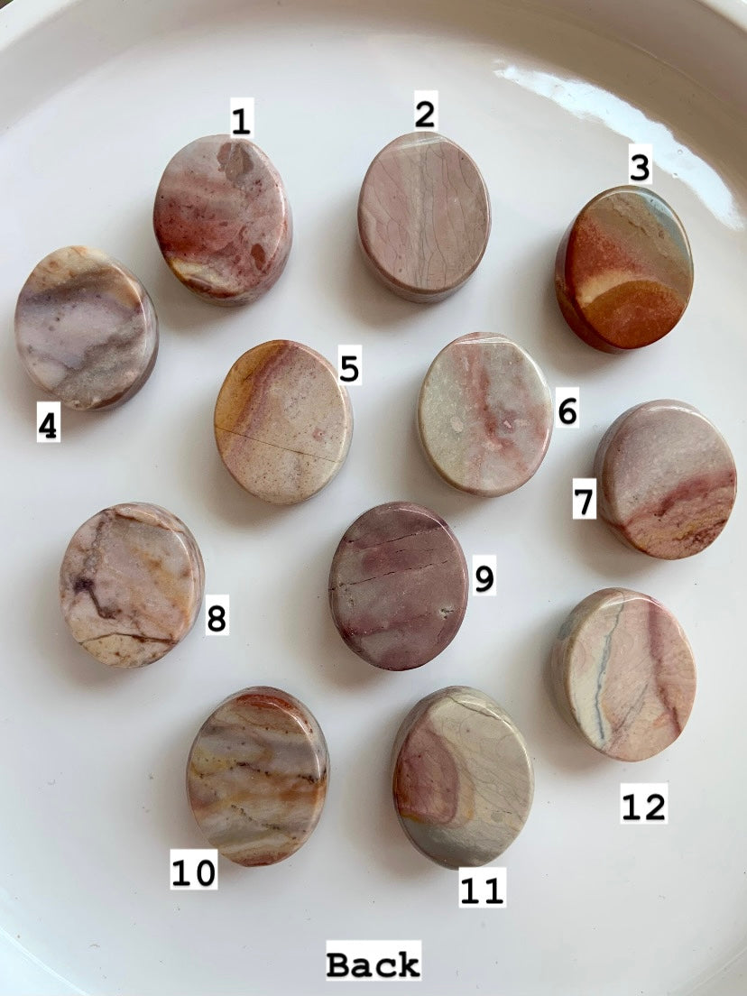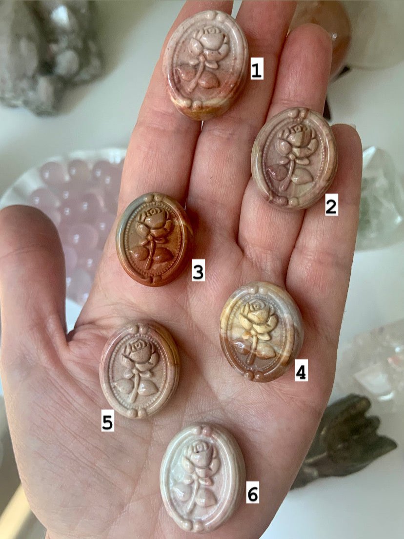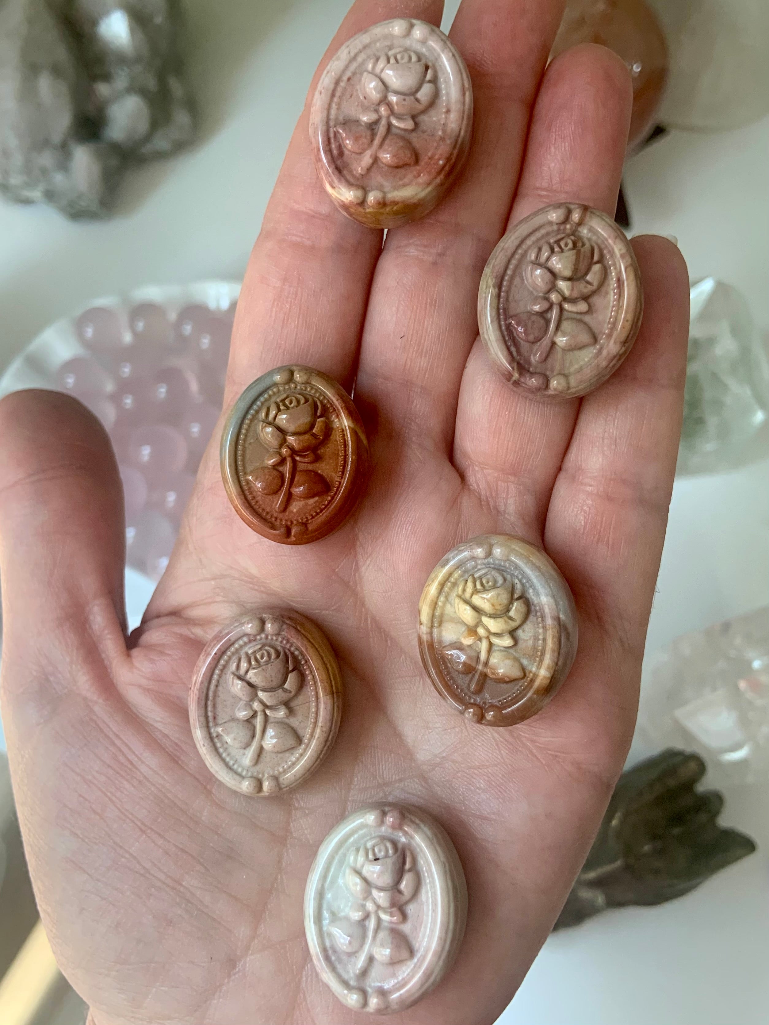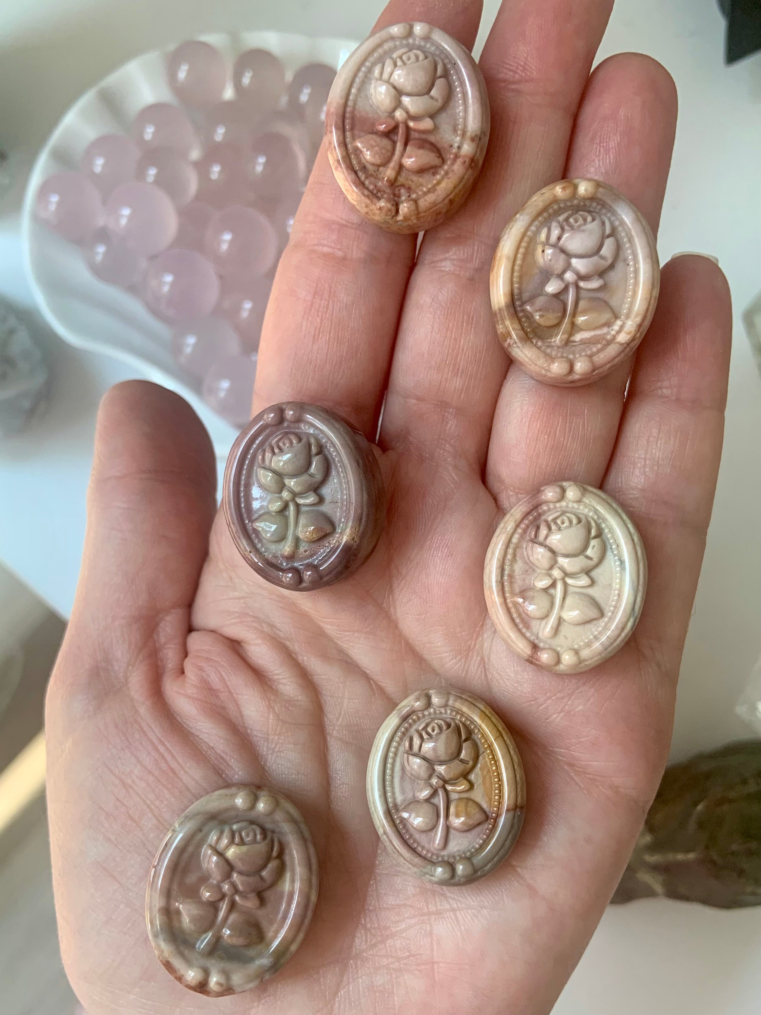 These Alashan Agate Flowers have beautifully detailed bas relief carving on the front with a flat back. There are just twelve to choose from + each stone rose is one of a kind, size details below.