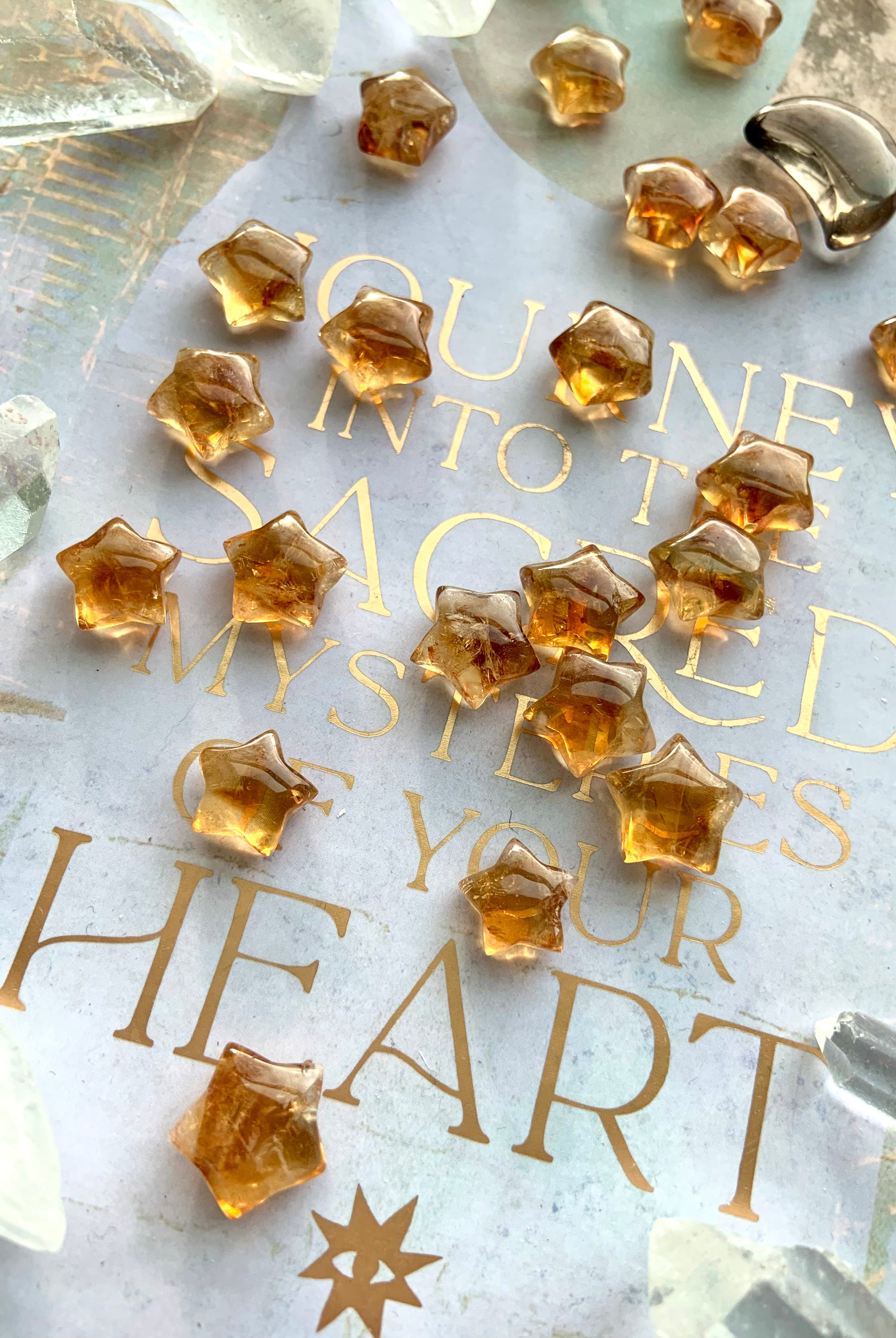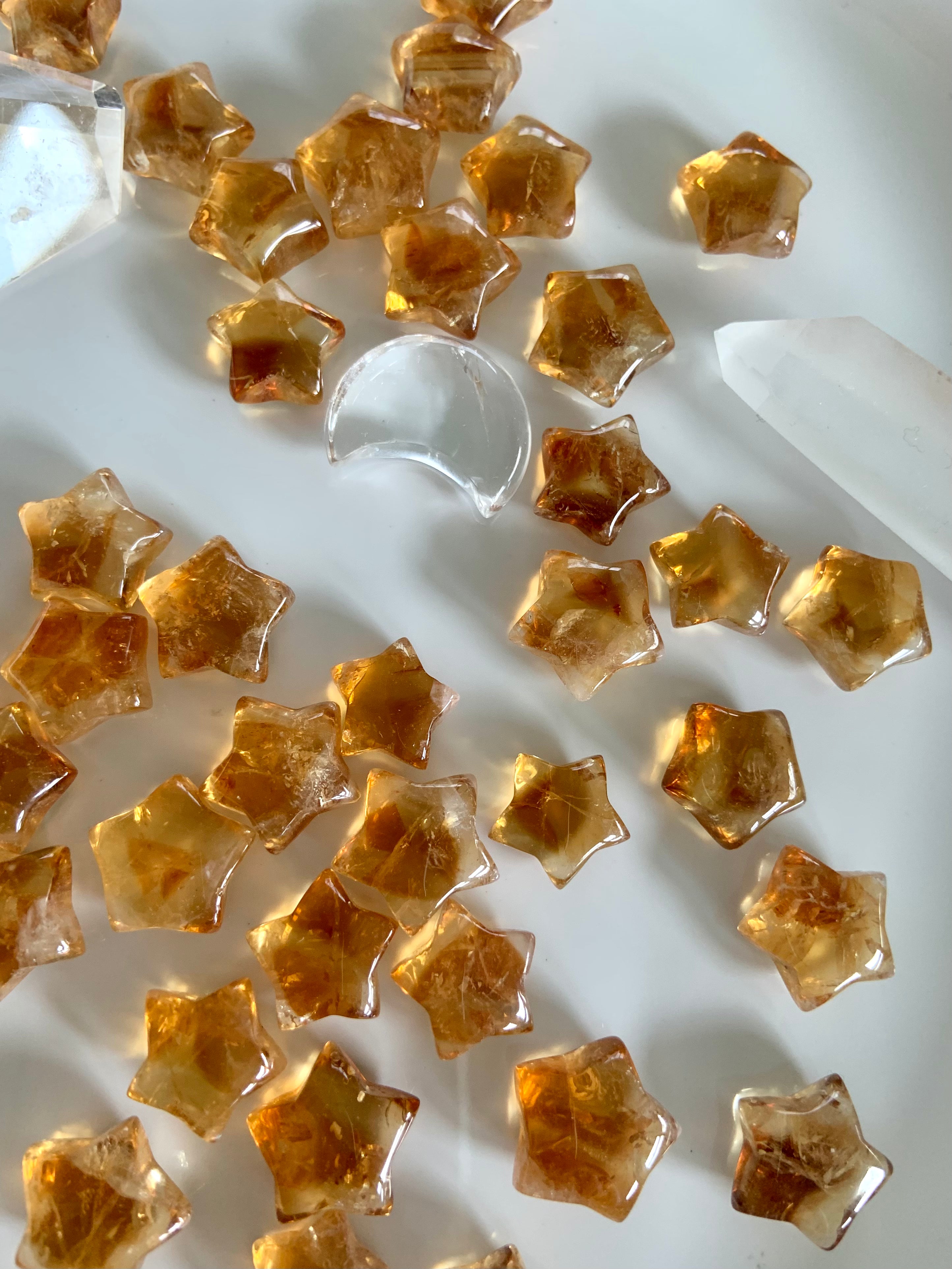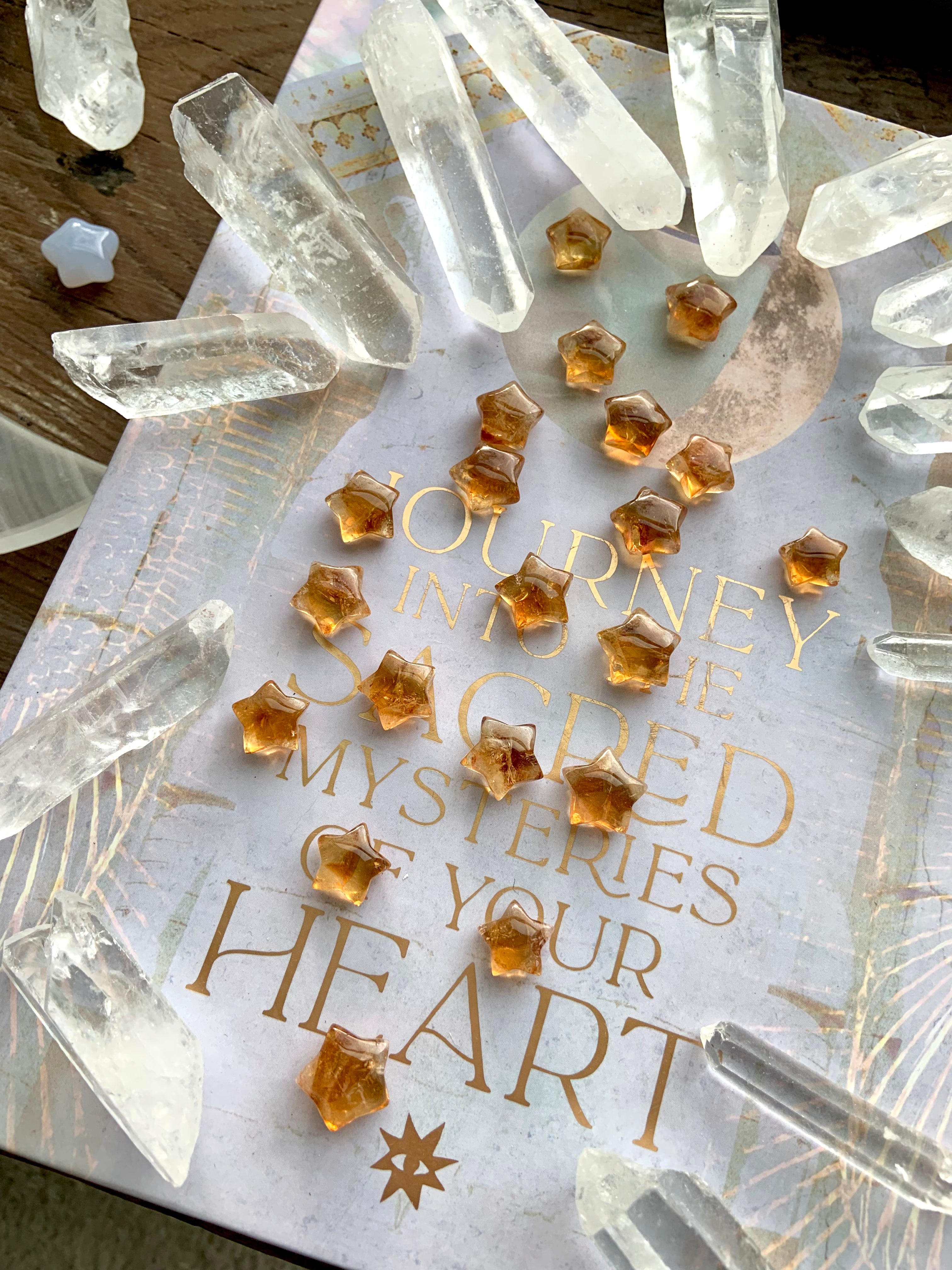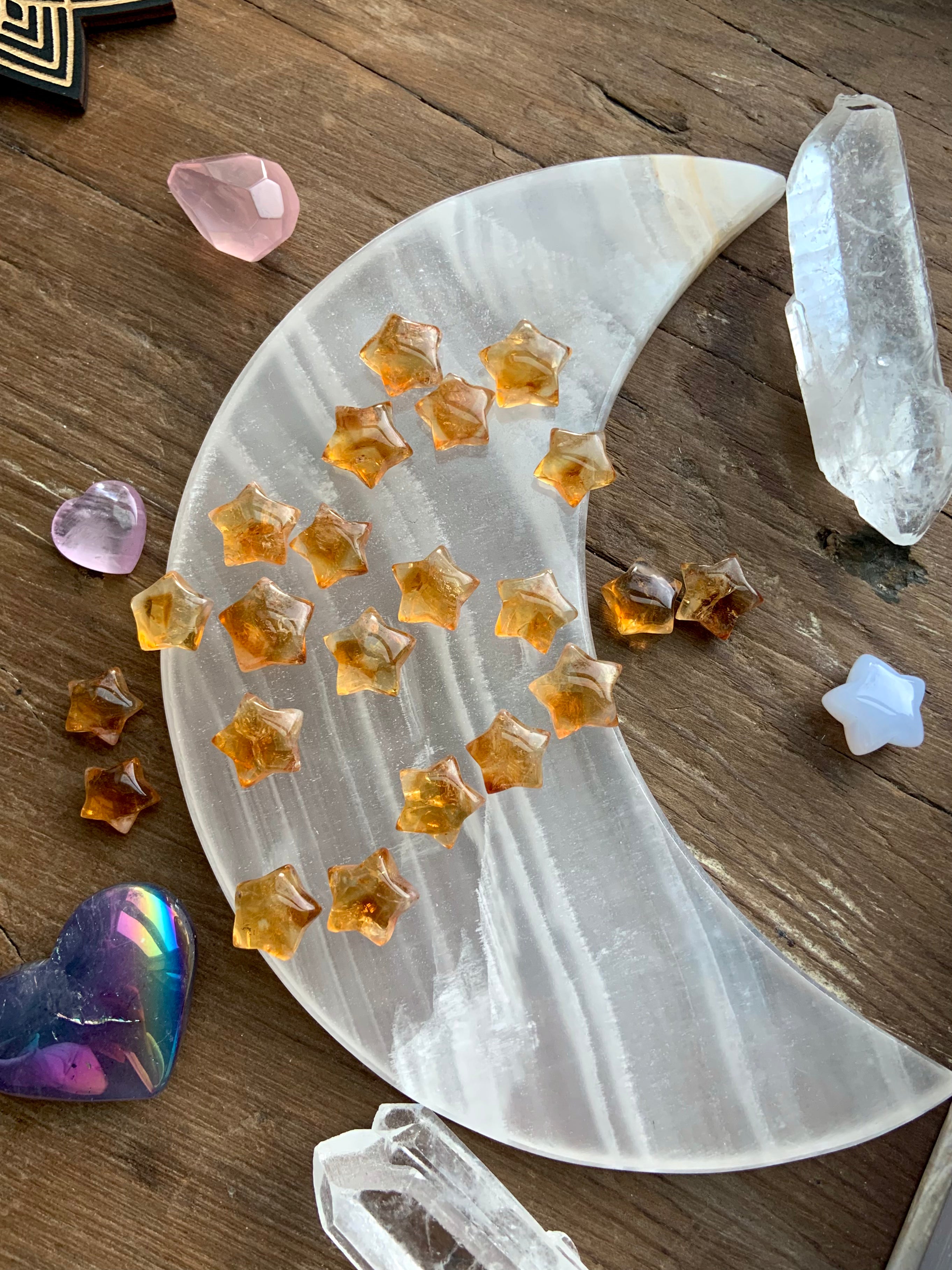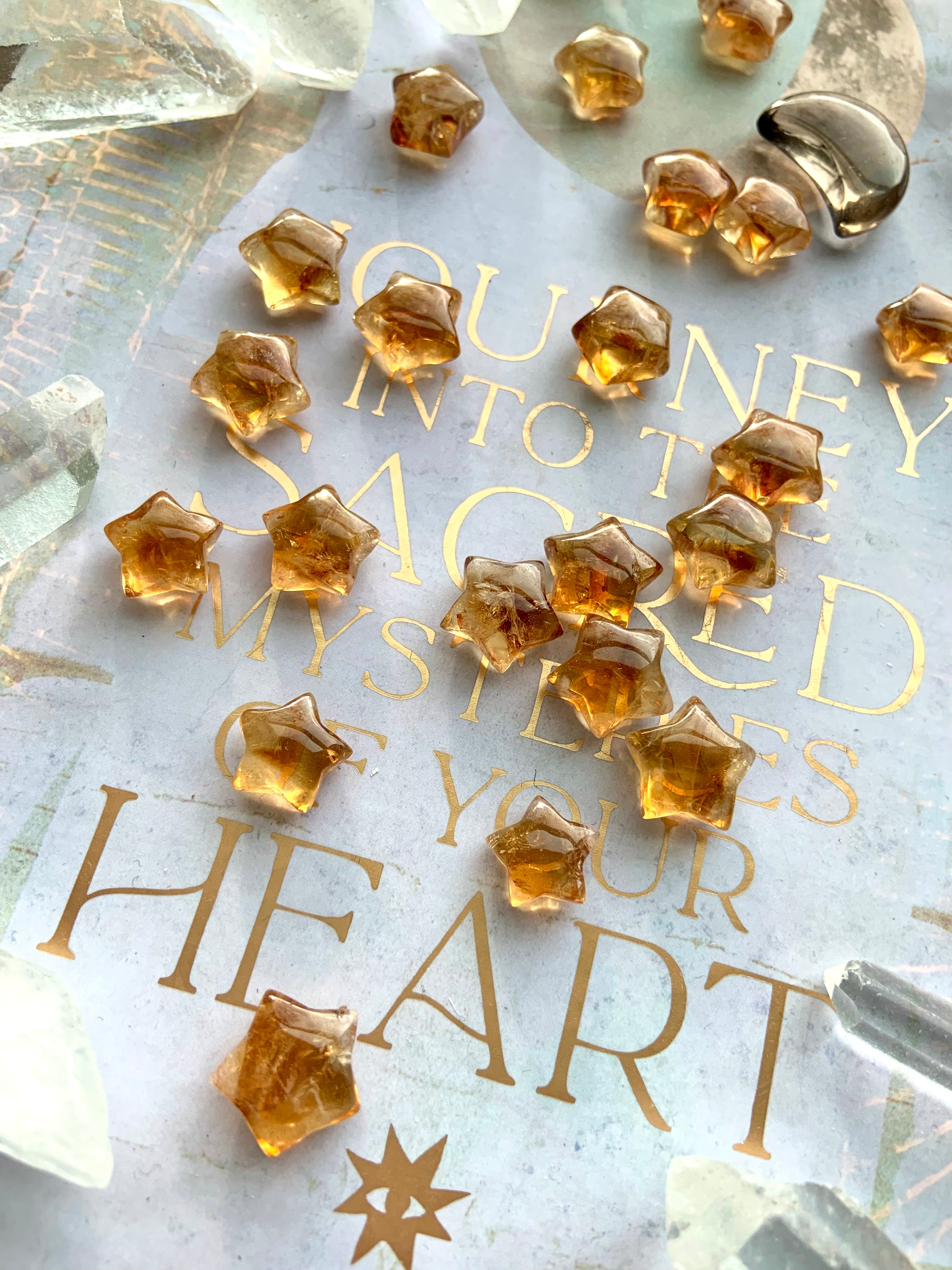 Our Citrine collection features best-selling mini crystal hearts, moons, and stars—plus bracelets, a Citrine-infused Golden Ray Aura Mist, and chakra healing crystal sets. You’ll also find a rotating selection of one-of-a-kind jewelry, raw points, spheres, towers, and sacred carvings that glow with golden warmth.
