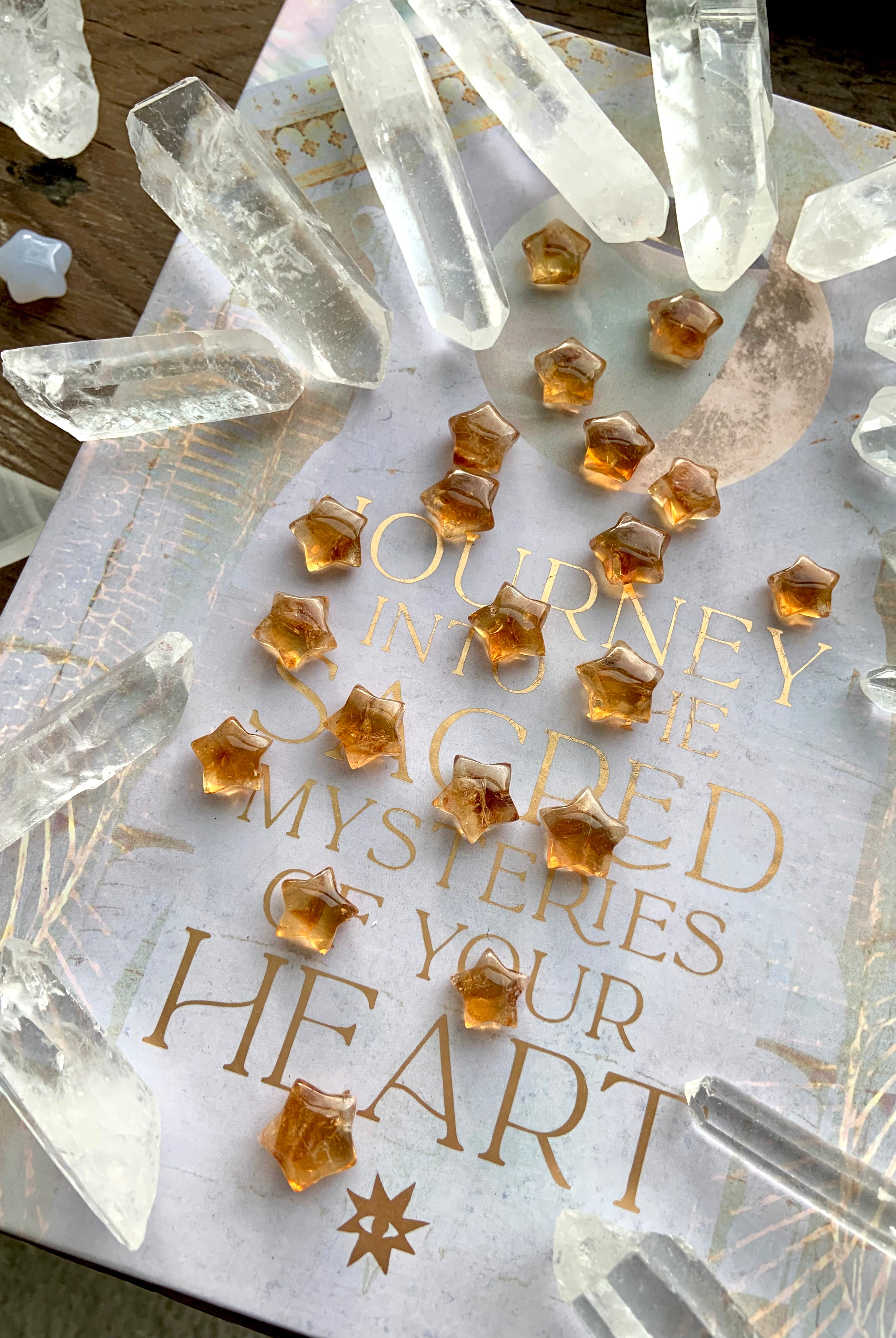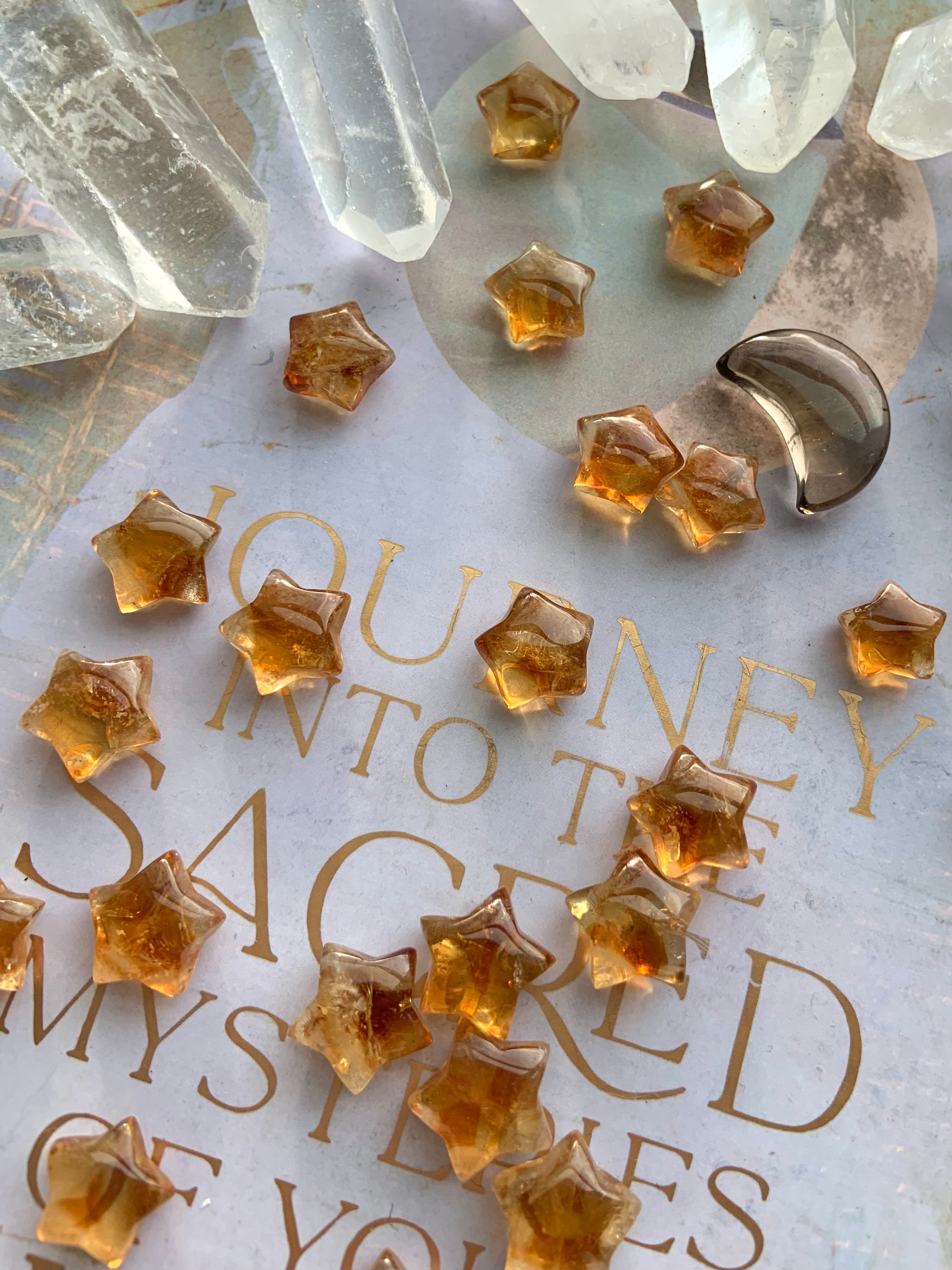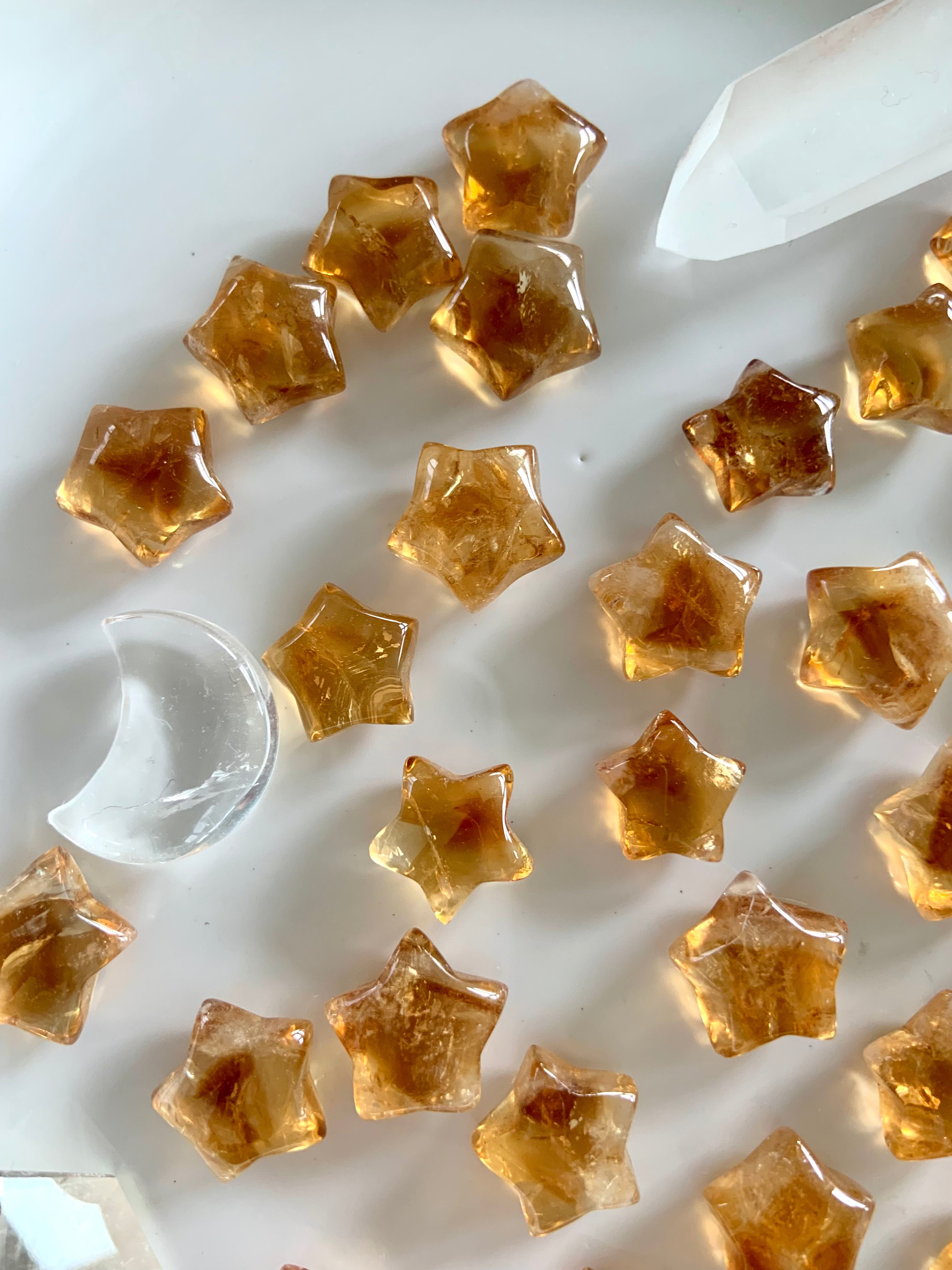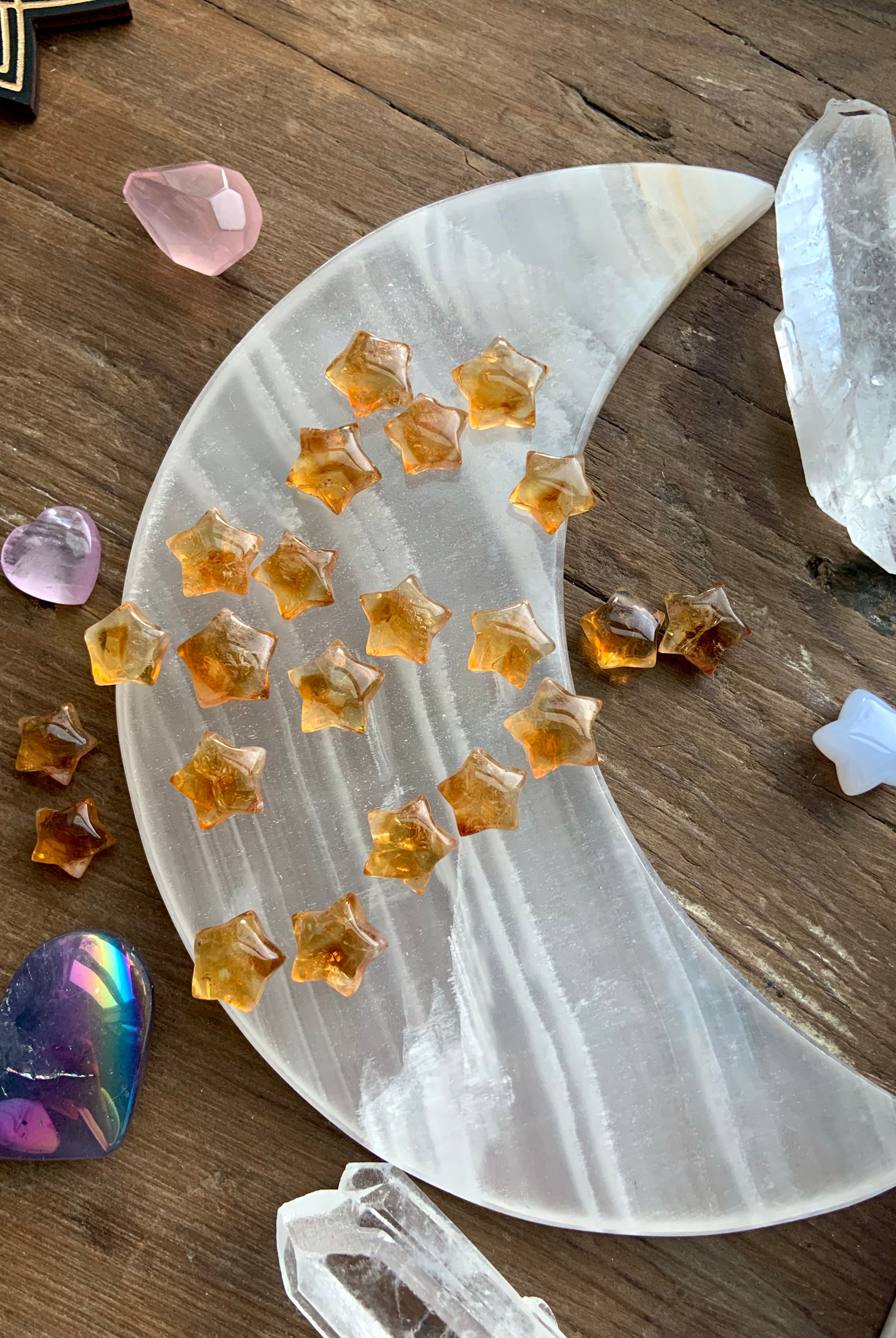Our Citrine collection features best-selling mini crystal hearts, moons, and stars—plus bracelets, a Citrine-infused Golden Ray Aura Mist, and chakra healing crystal sets. You’ll also find a rotating selection of one-of-a-kind jewelry, raw points, spheres, towers, and sacred carvings that glow with golden warmth.