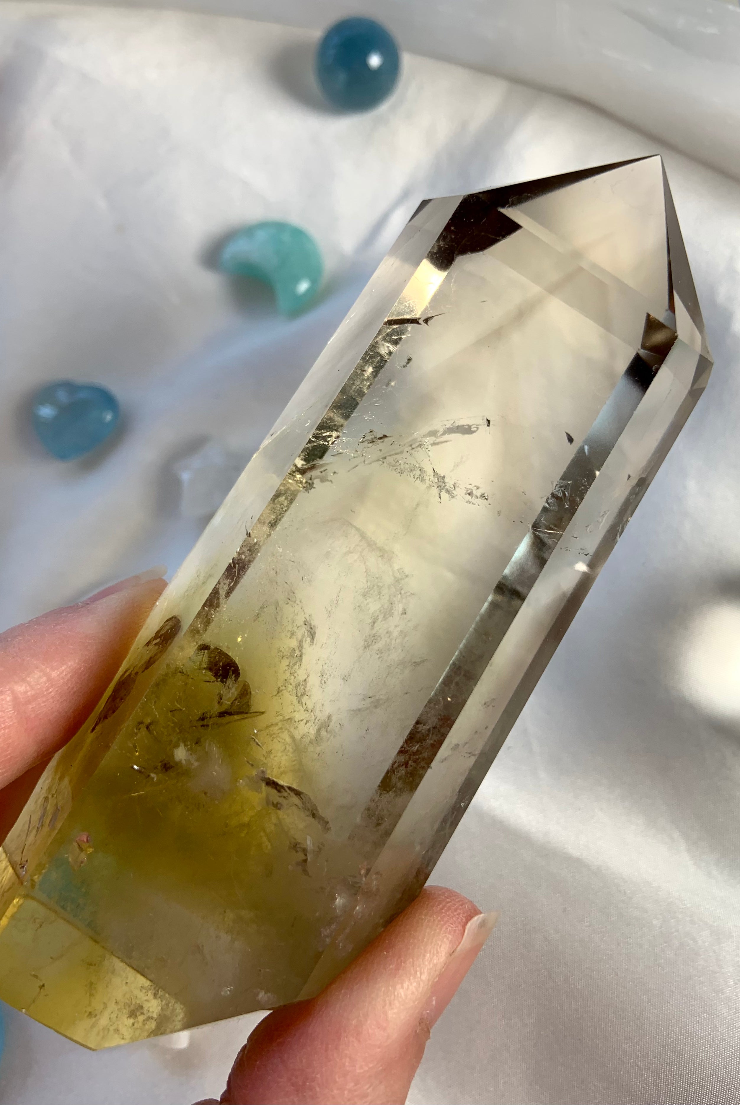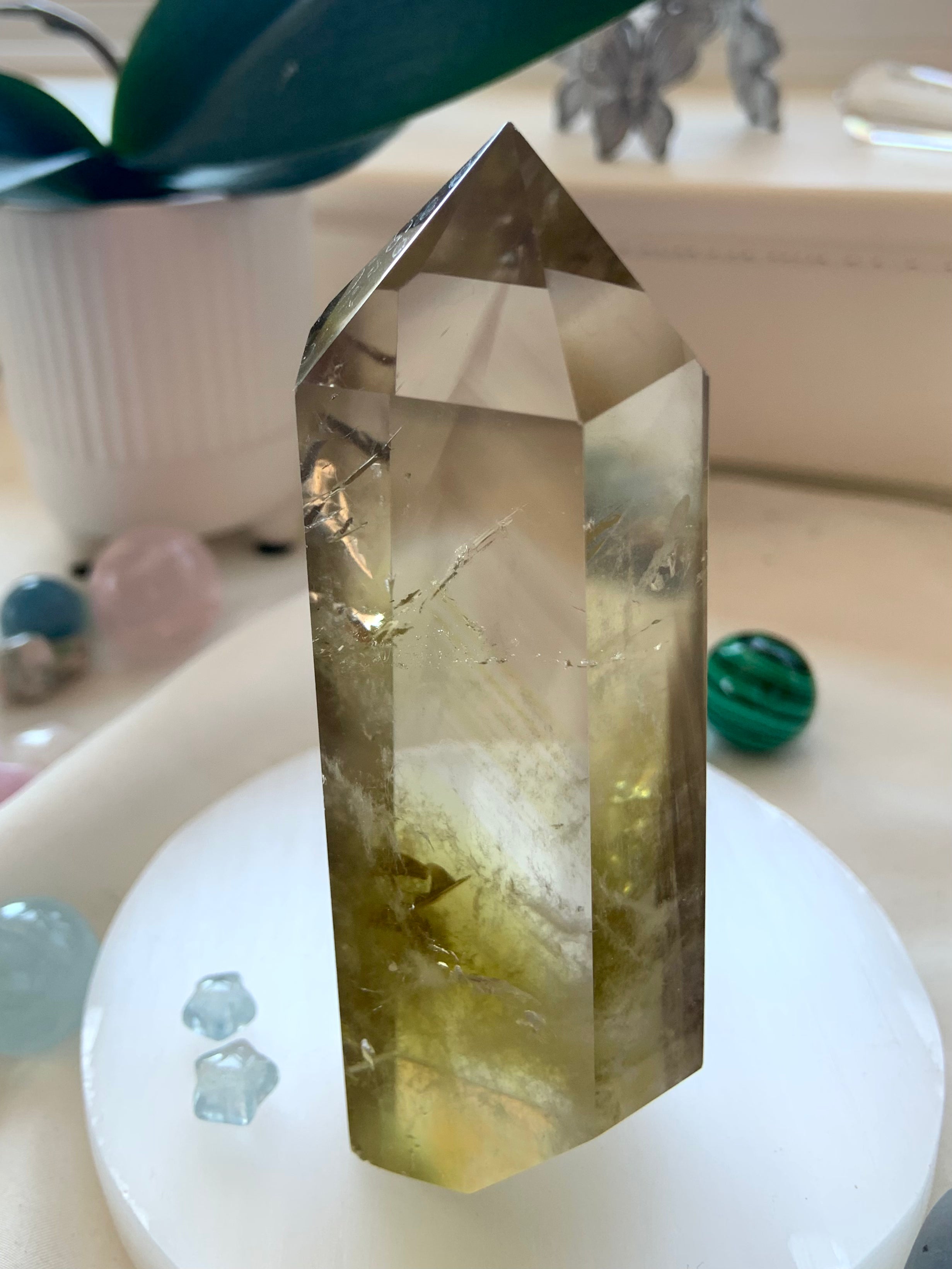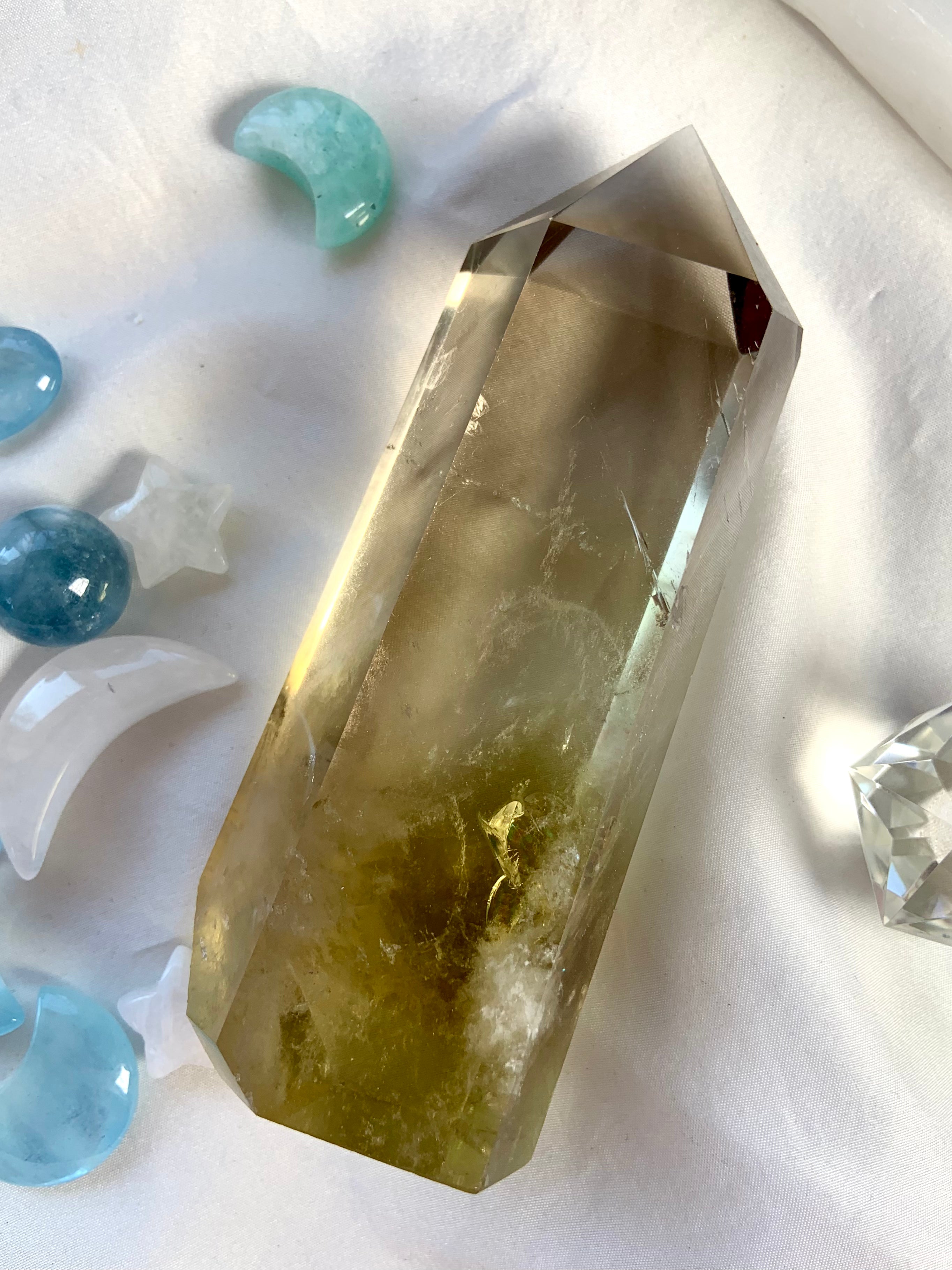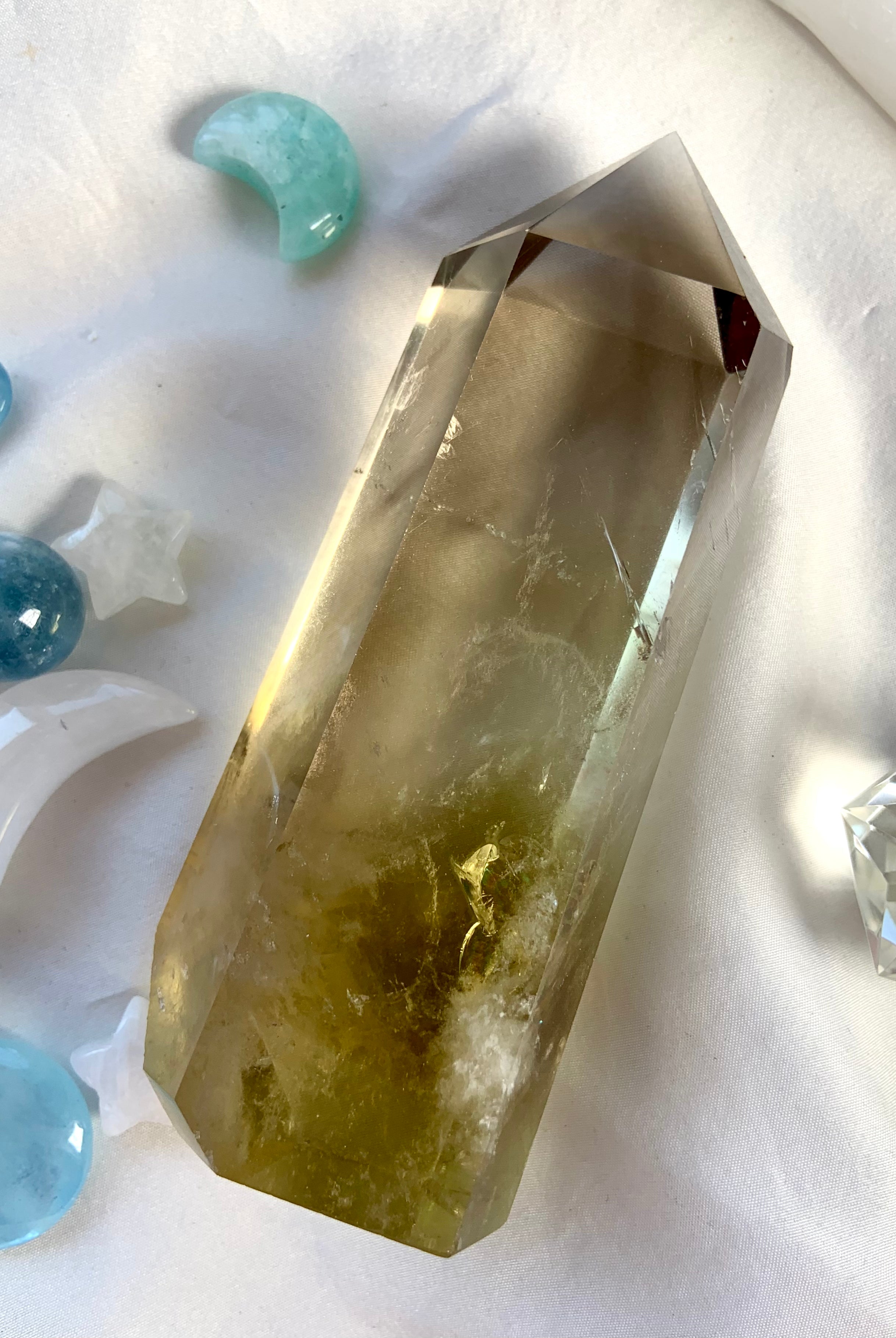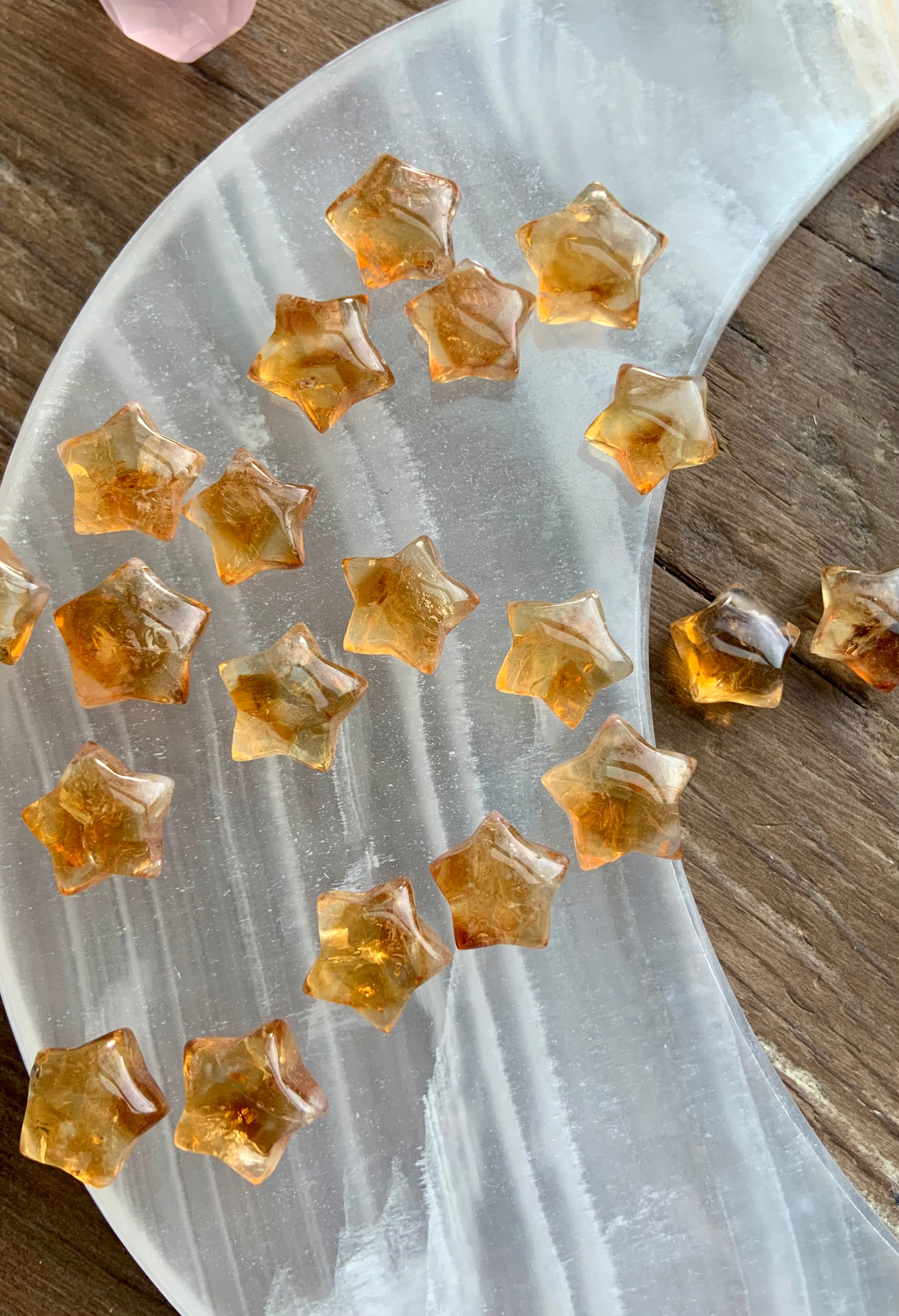 Our Citrine collection features best-selling mini crystal hearts, moons, and stars—plus bracelets, a Citrine-infused Golden Ray Aura Mist, and chakra healing crystal sets. You’ll also find a rotating selection of one-of-a-kind jewelry, raw points, spheres, towers, and sacred carvings that glow with golden warmth.