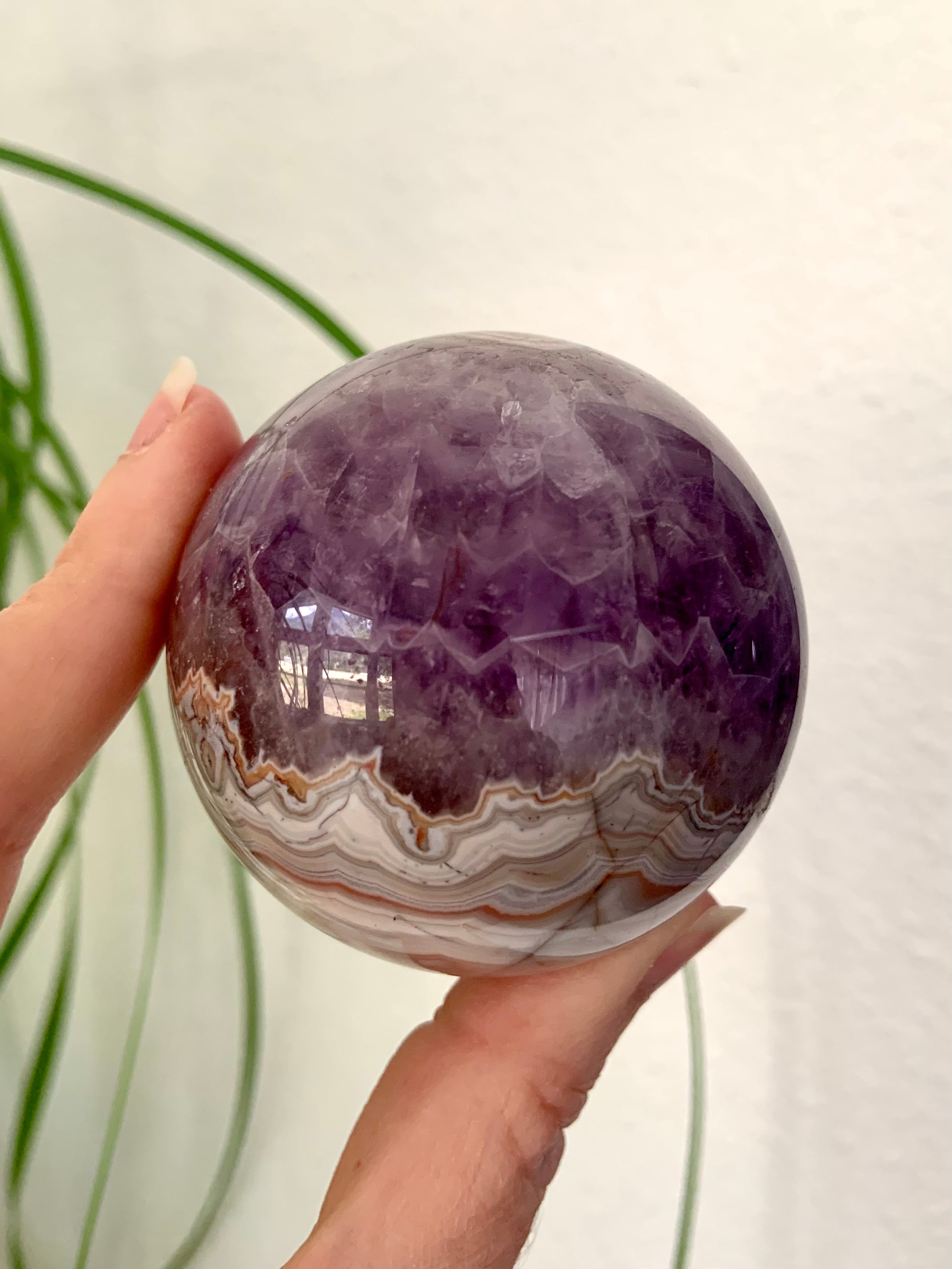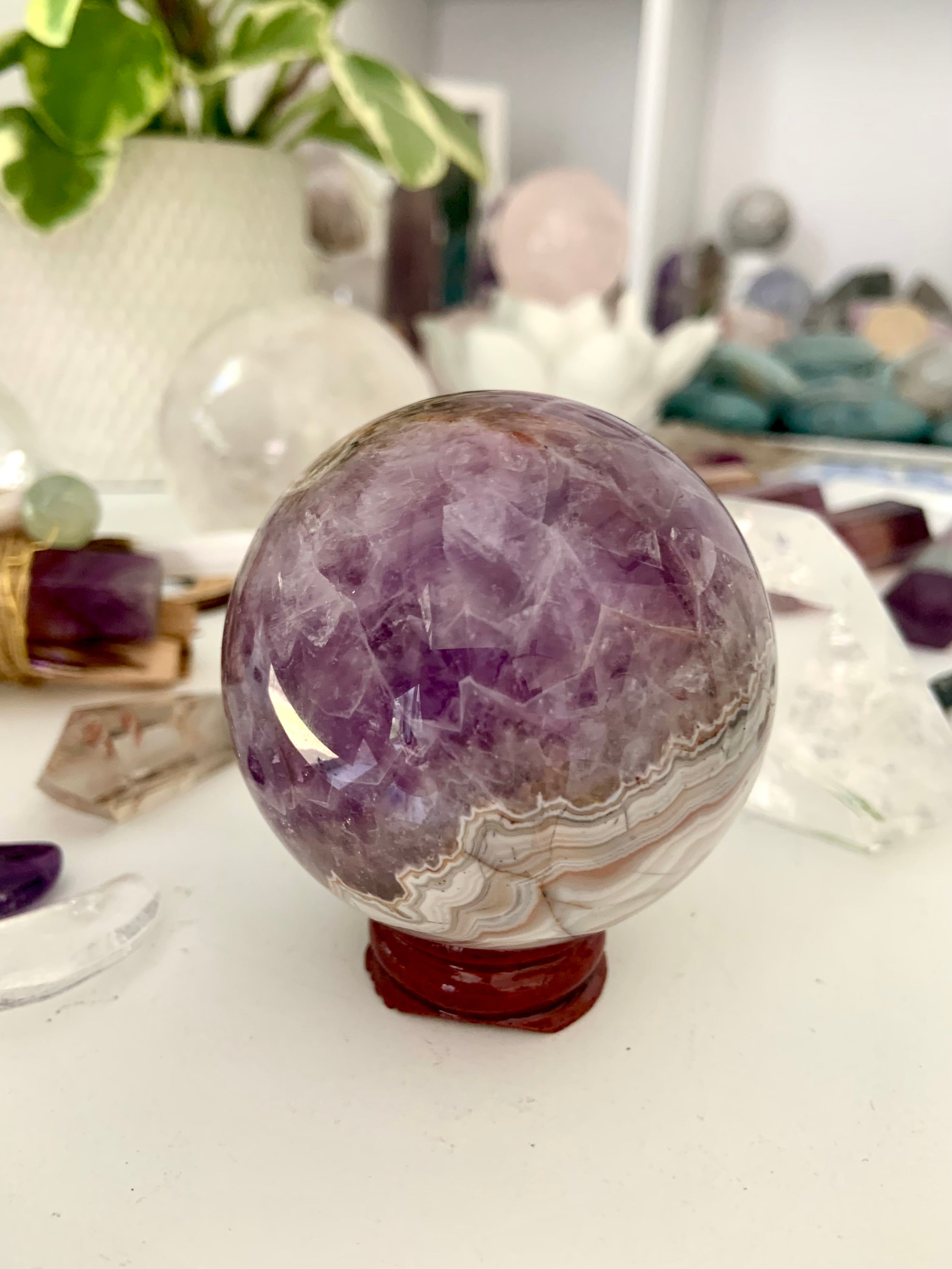 Consider this one of a kind Amethyst x Crazy Lace Agate Sphere with undulating banding + dreamy pastel color patterns with bubbly agate flowers surrounded by sparkly purple Amethyst with hematite inclusions + crystalline chevron patterns.