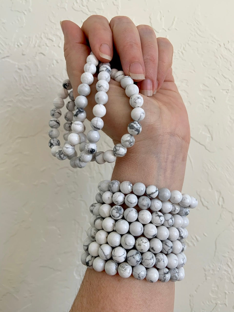 Wear your Howlite Crystal Bracelets when you need a bit of calming + peaceful energy in your midst. teaches peace. Howlite has an energy that is calming + emotionally supportive. It has a clear + expansive energy which is excellent for teachers + students in any subject.