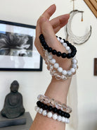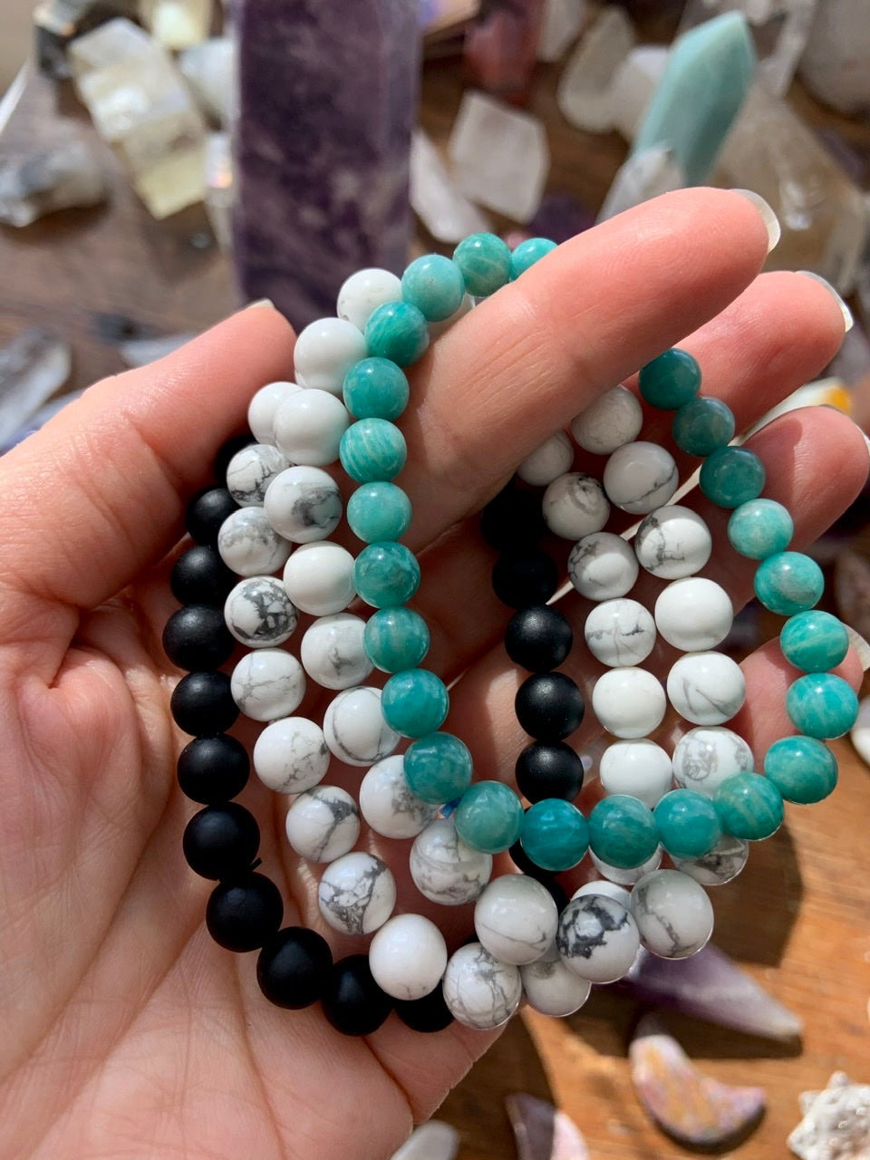 Pic # 4 shows a Goddess stack with Shungite + Amazonite bracelets, pic # 5-6 show Shungite + Rainbow Quartz, pic 7 shows Amazonite + Rose Quartz (8.5mm) which are all available in our shop.