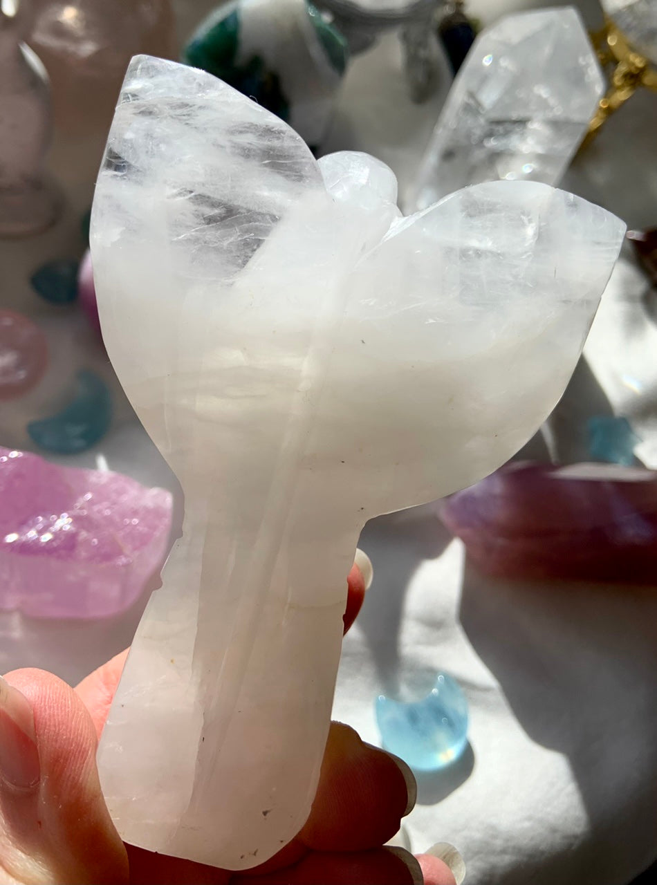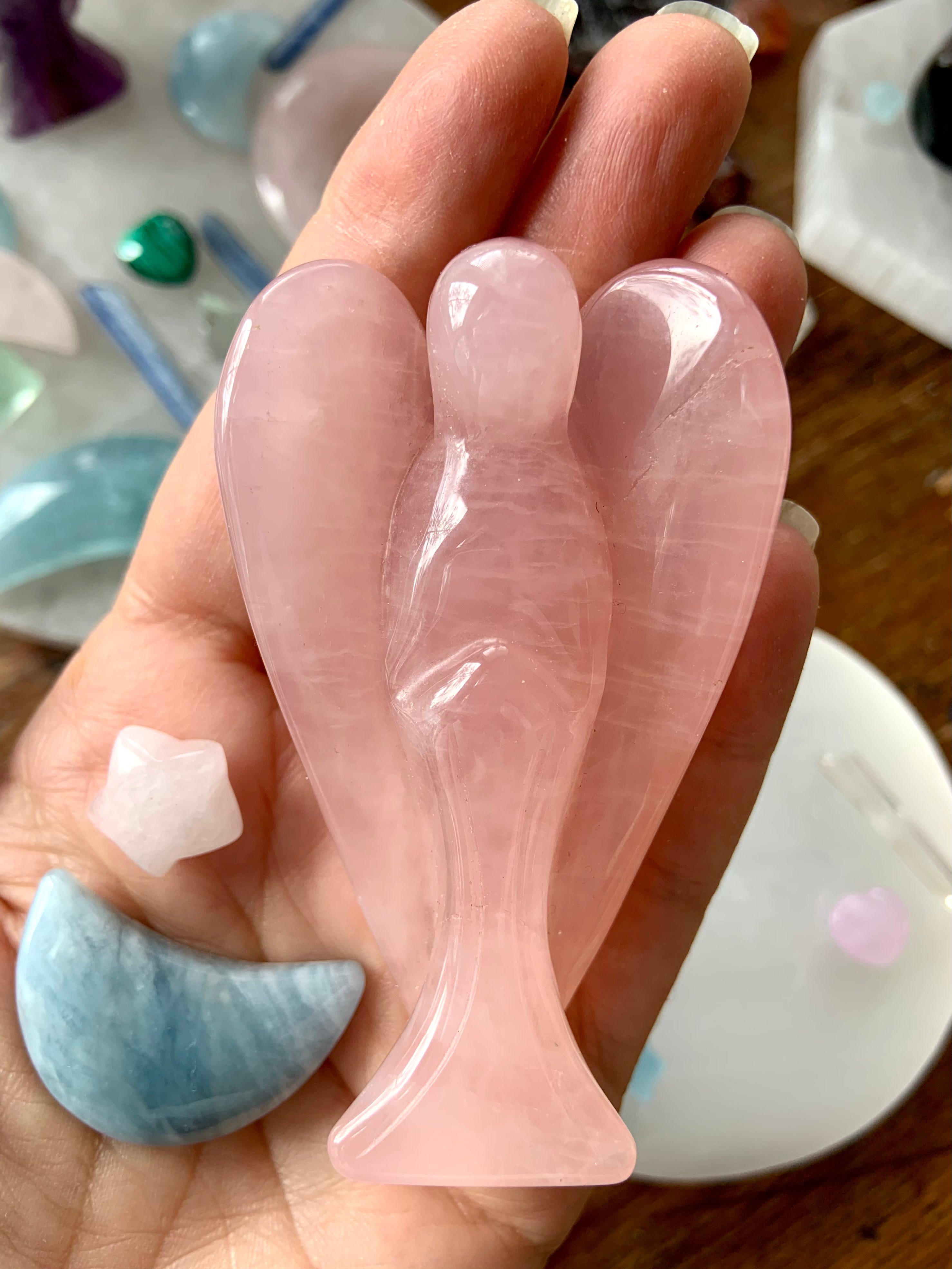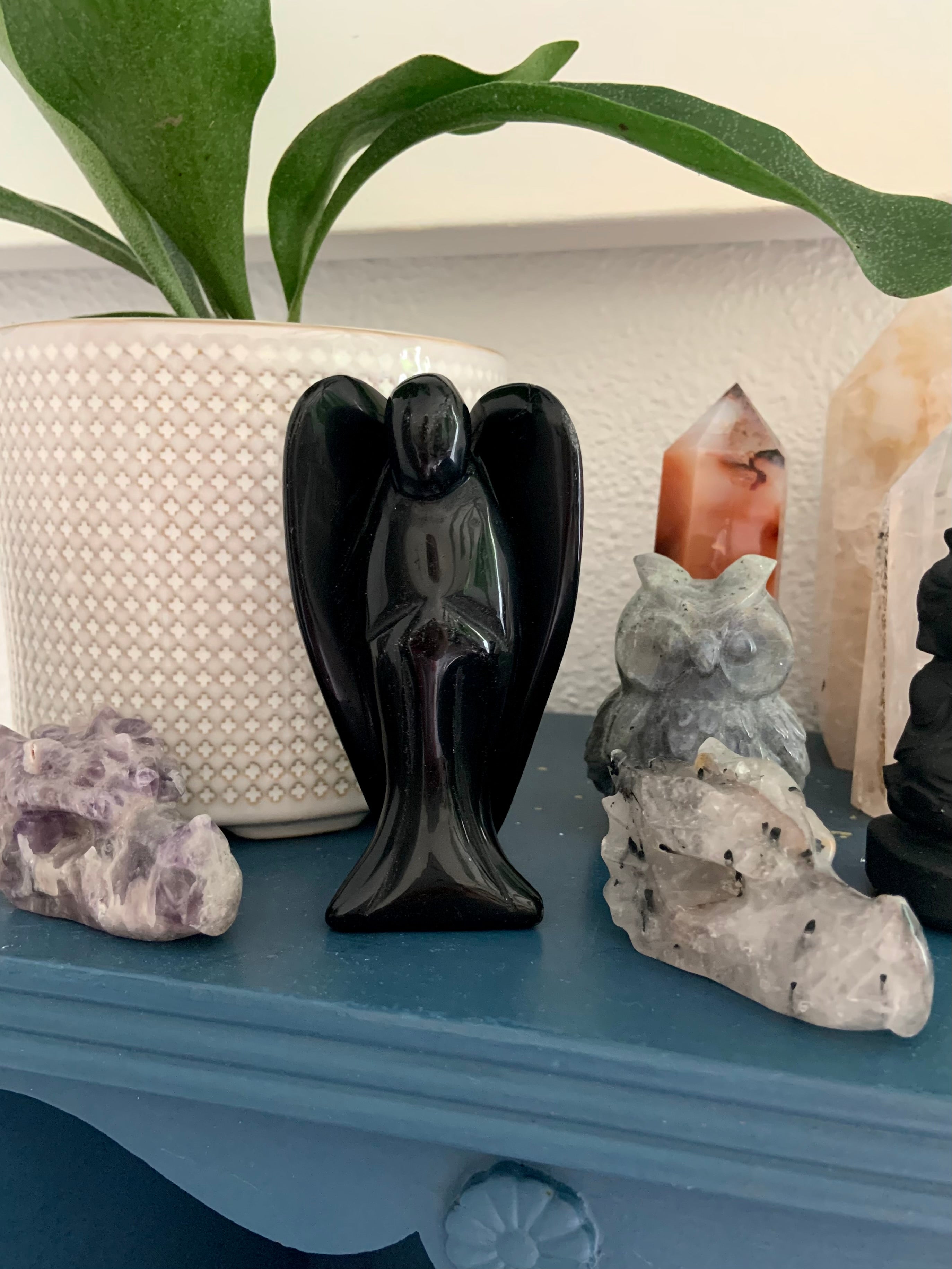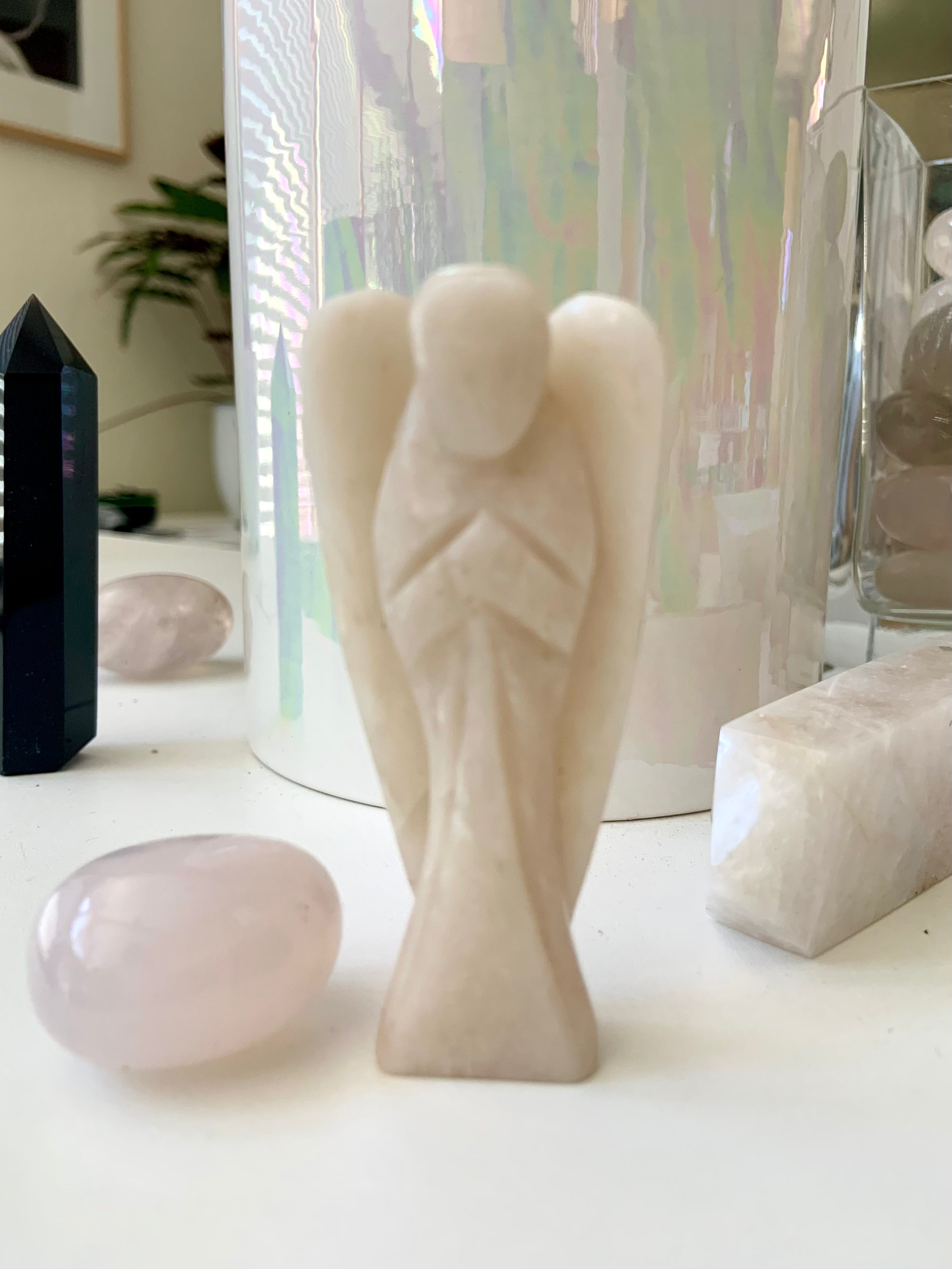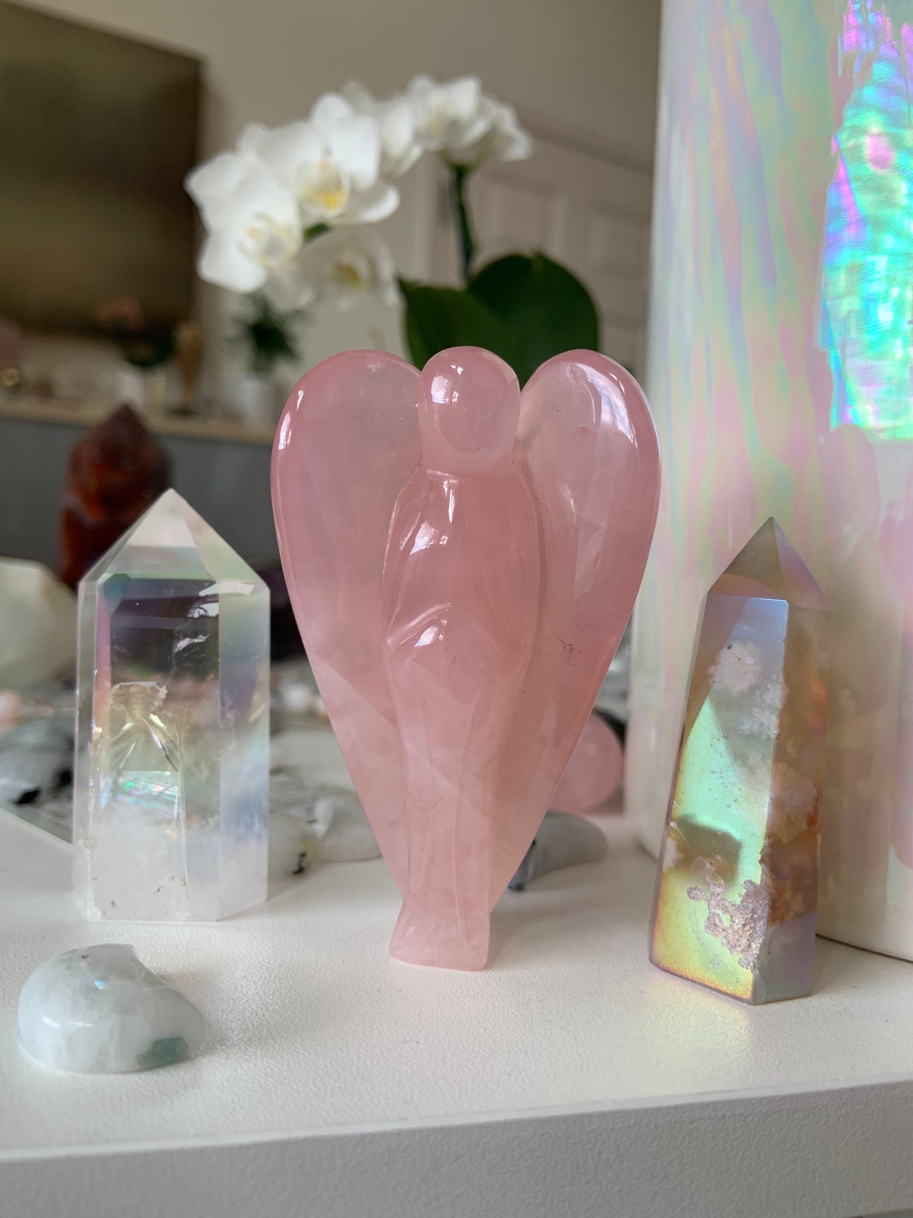 Call in divine support with our Crystal Angel carvings — sacred symbols of healing, protection, and spiritual light. These ethereal figures are carved from high-vibrational stones like Rose Quartz, Amethyst, Moonstone, Clear Quartz, and Black Obsidian, each radiating gentle guidance and peace.