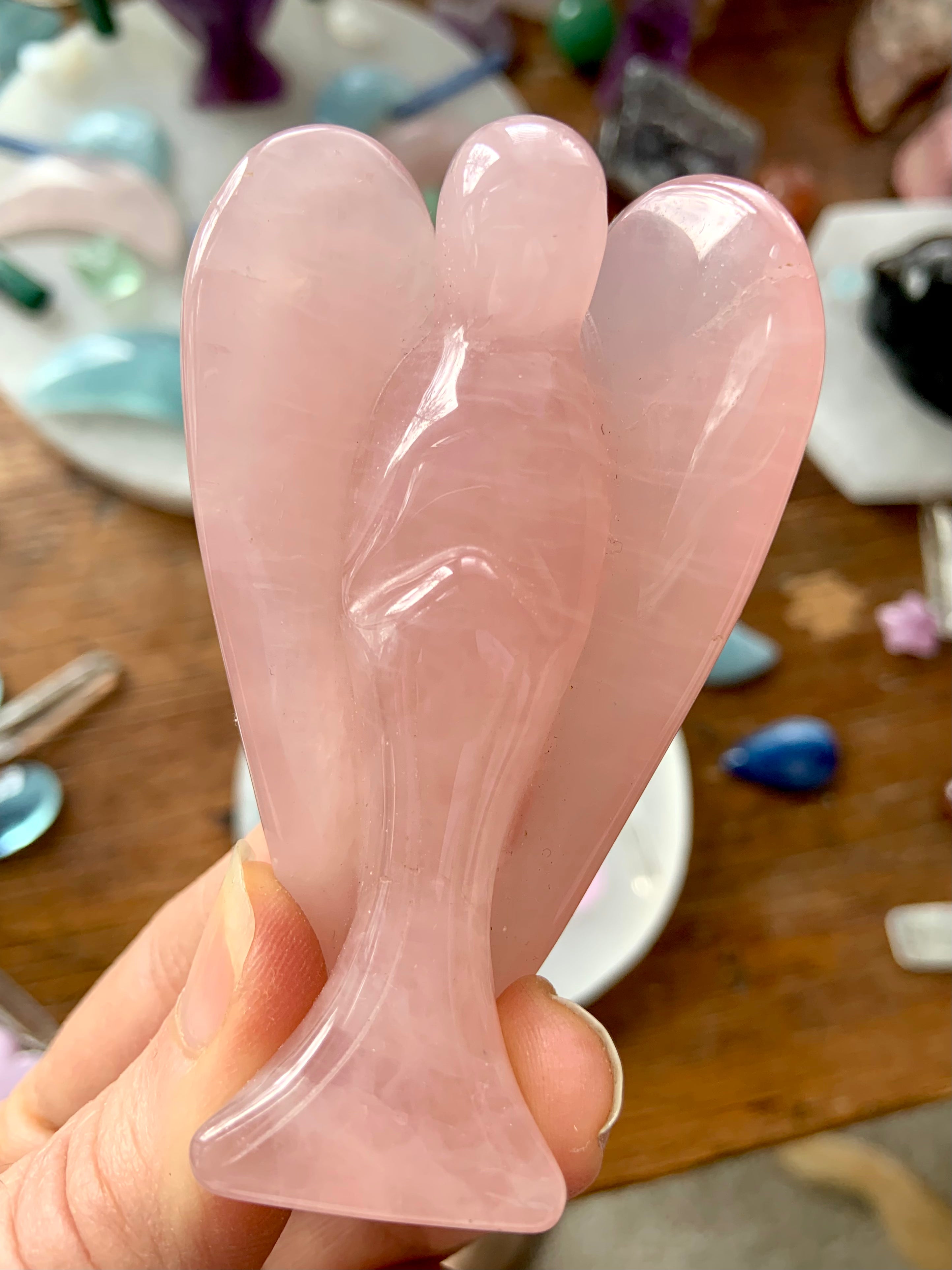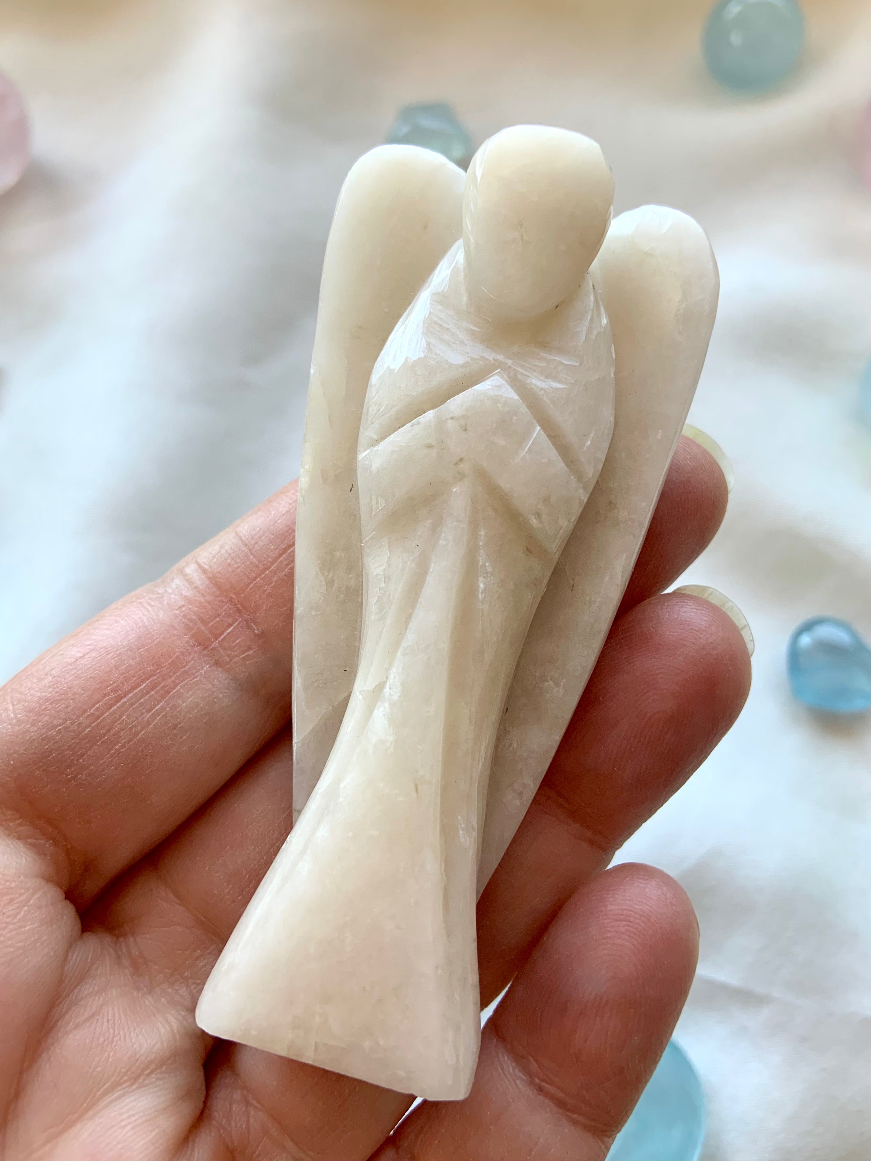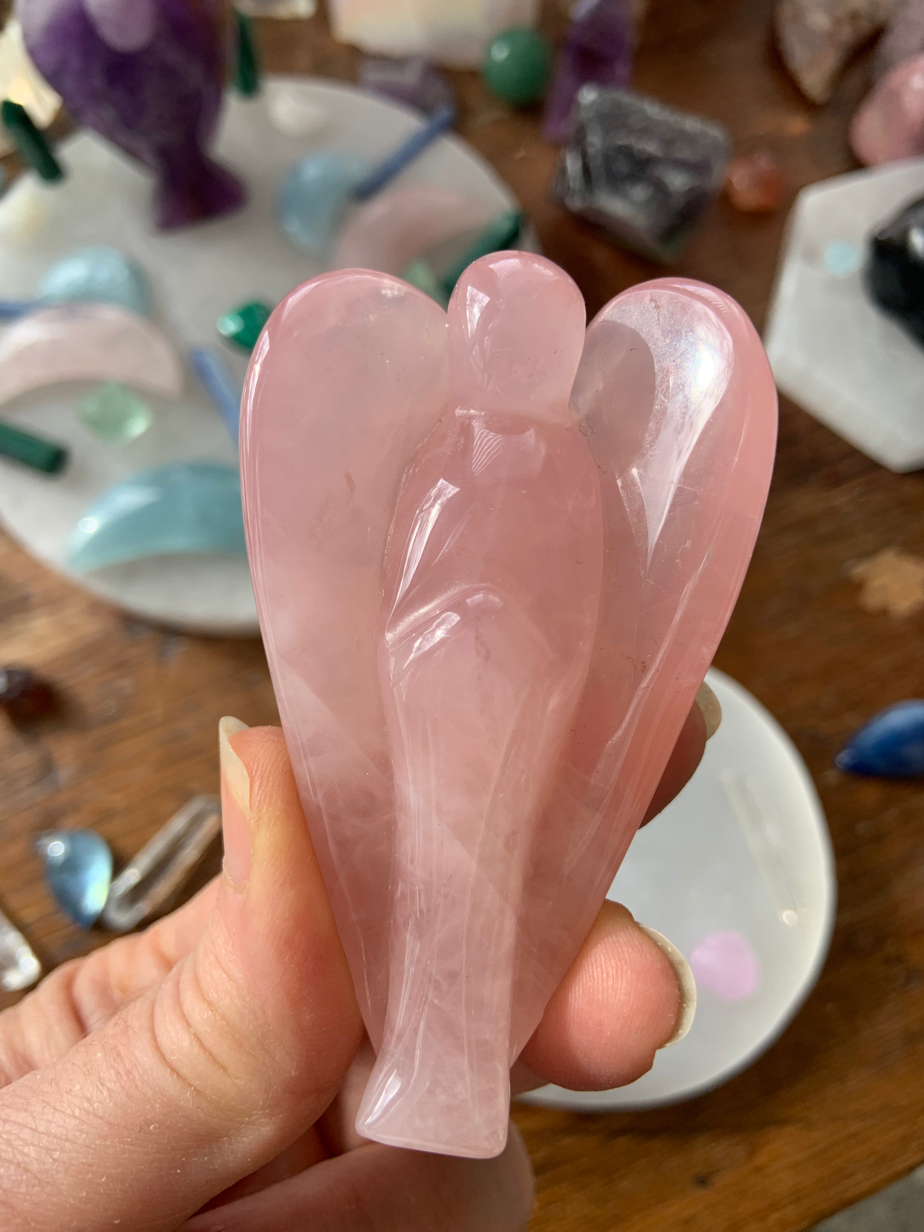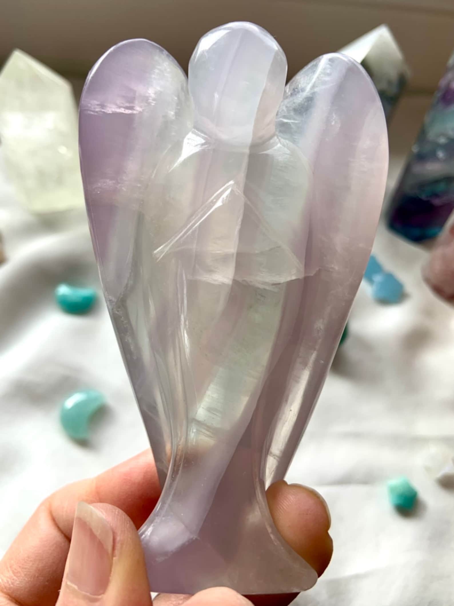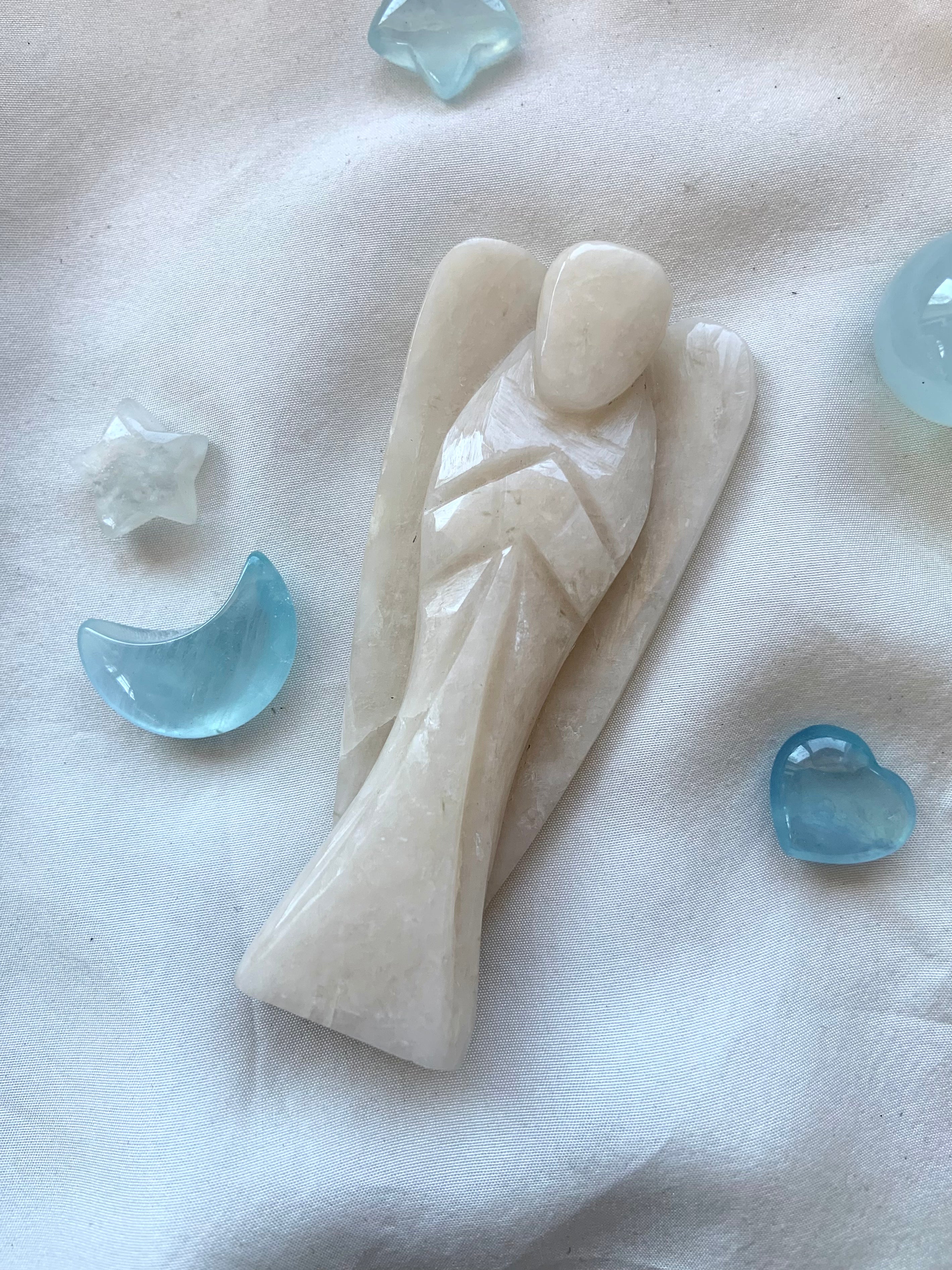 This curated collection includes pocket-size companions, meditation stones, altar guardians, and one-of-a-kind statement pieces. Whether gifted as a spiritual keepsake or used in ritual and remembrance, crystal angels offer comfort, presence, and a connection to the celestial realms.