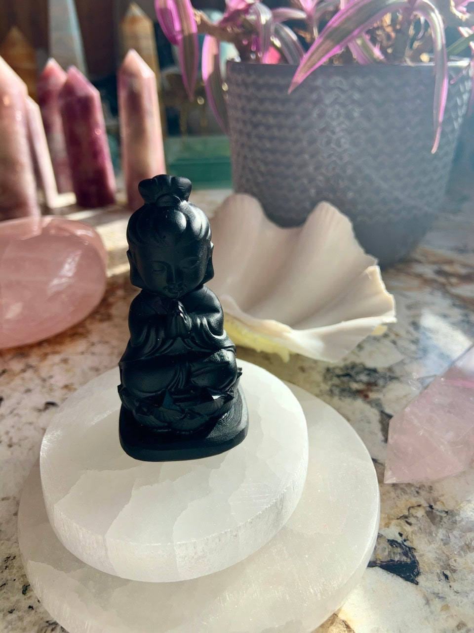 This obsidian carving shows Quan Yin sitting in meditation upon a lotus flower, sweetly expressing her divine loving energy. She is known as a great protector + benefactor.