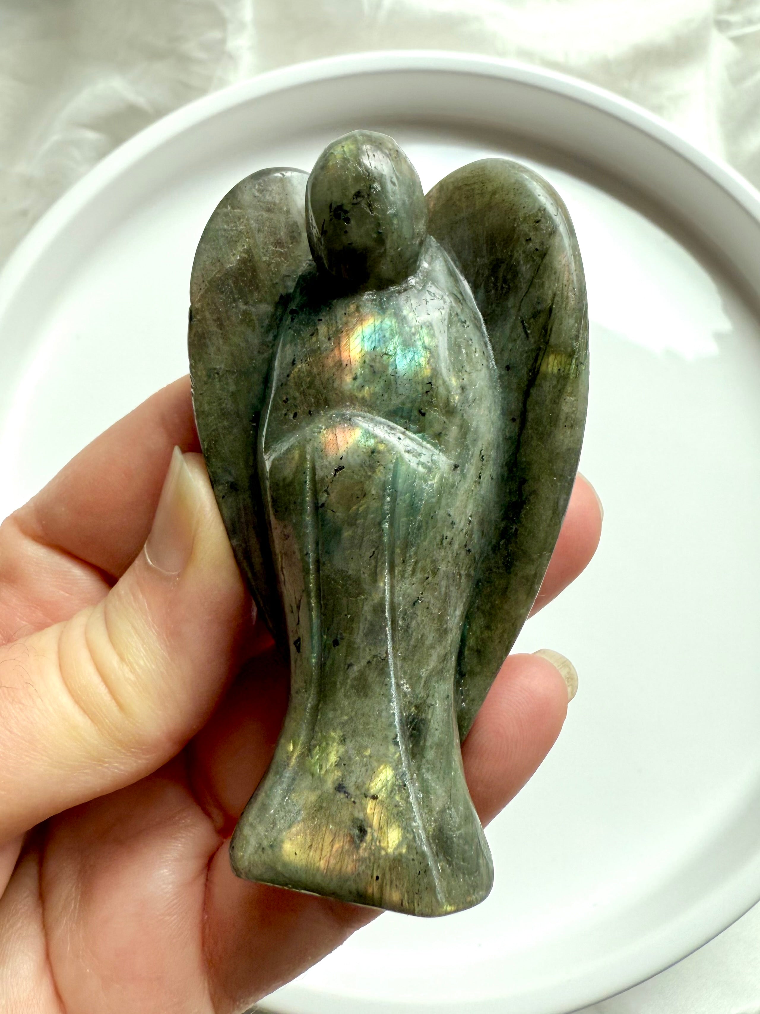 Bring the energy of angel love + light into your sacred space with this beautiful hand carved Labradorite Crystal Angel Figurine. These guardian angels make a very special gift for a loved one filled with angel energy. Place an angel figurine in the bedroom for protection while you sleep.