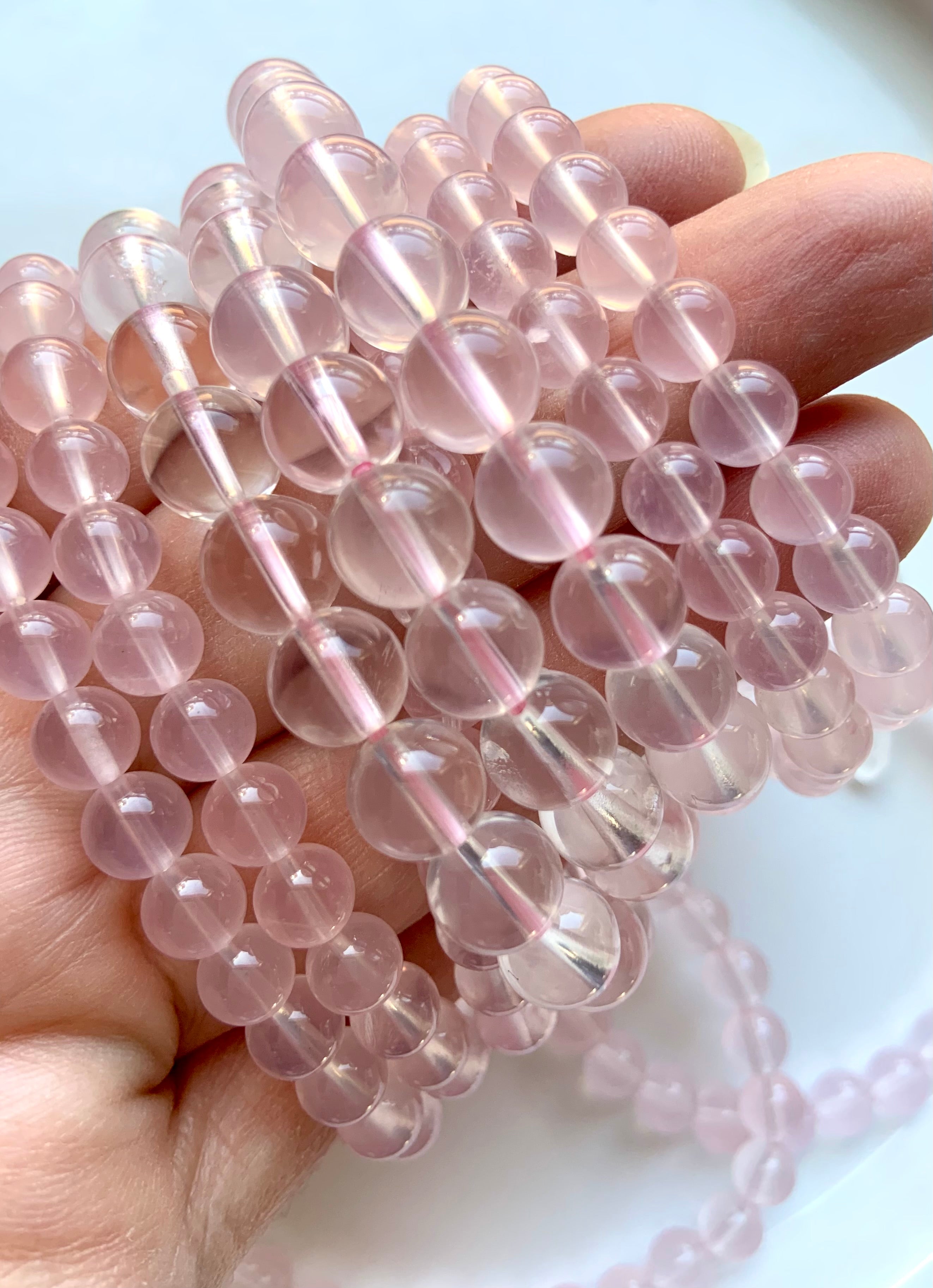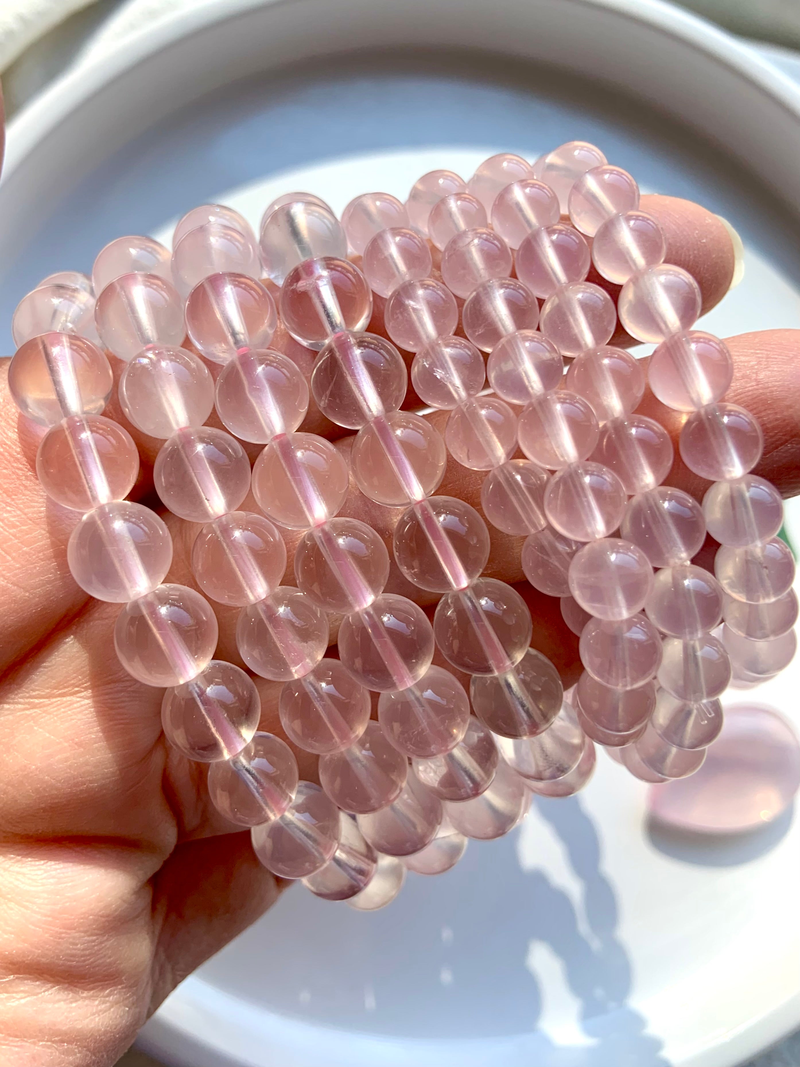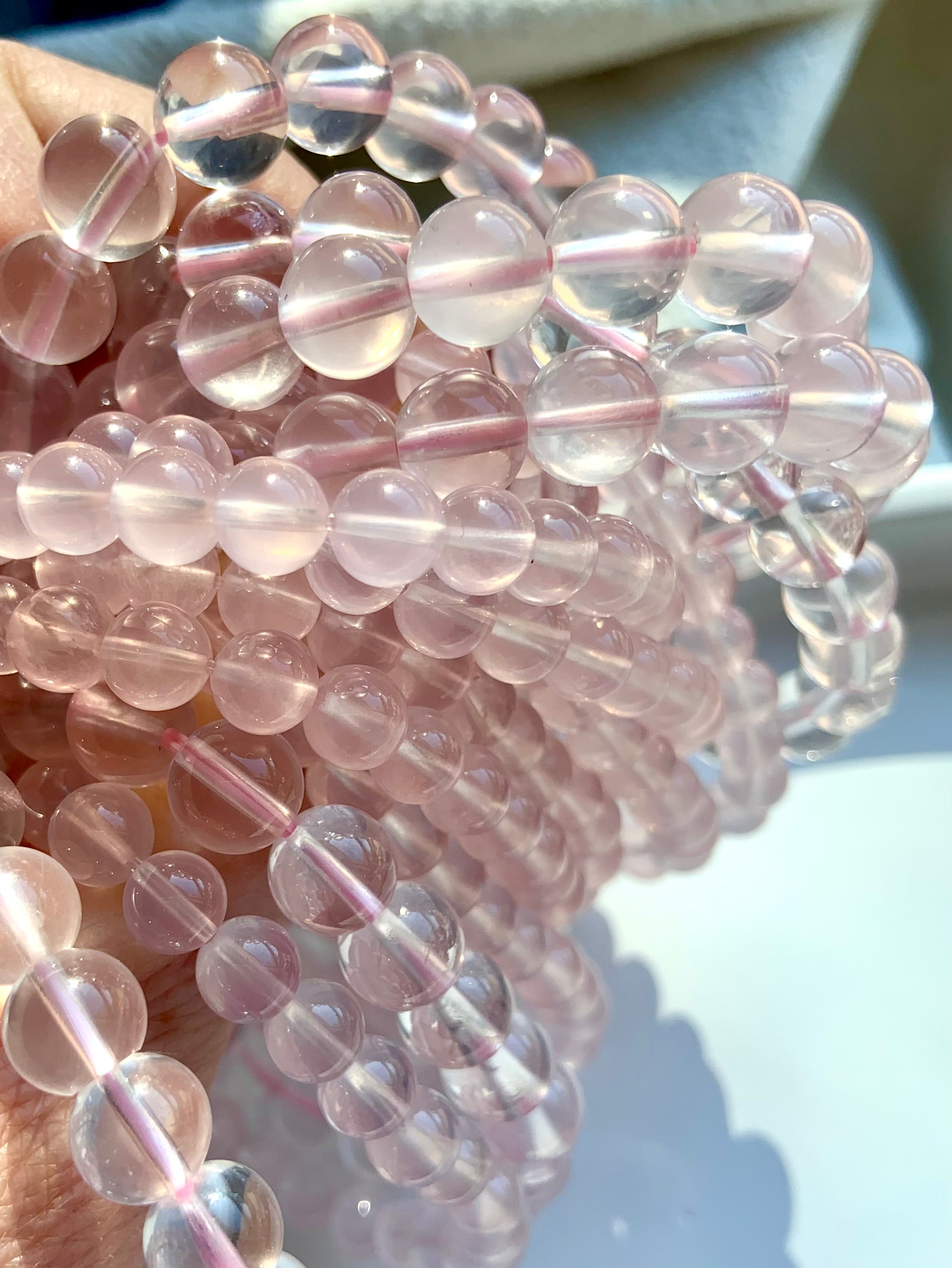 When your heart needs a hug, wear your luminous, gemmy Star Rose Quartz bracelet + be wrapped in it's soothing energy. These super high quality transparent pink Rose Quartz beads have the milky translucence of Girasol quartz + cats eye asterism when held to a strong light source.