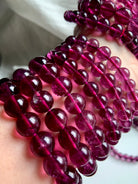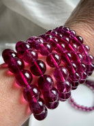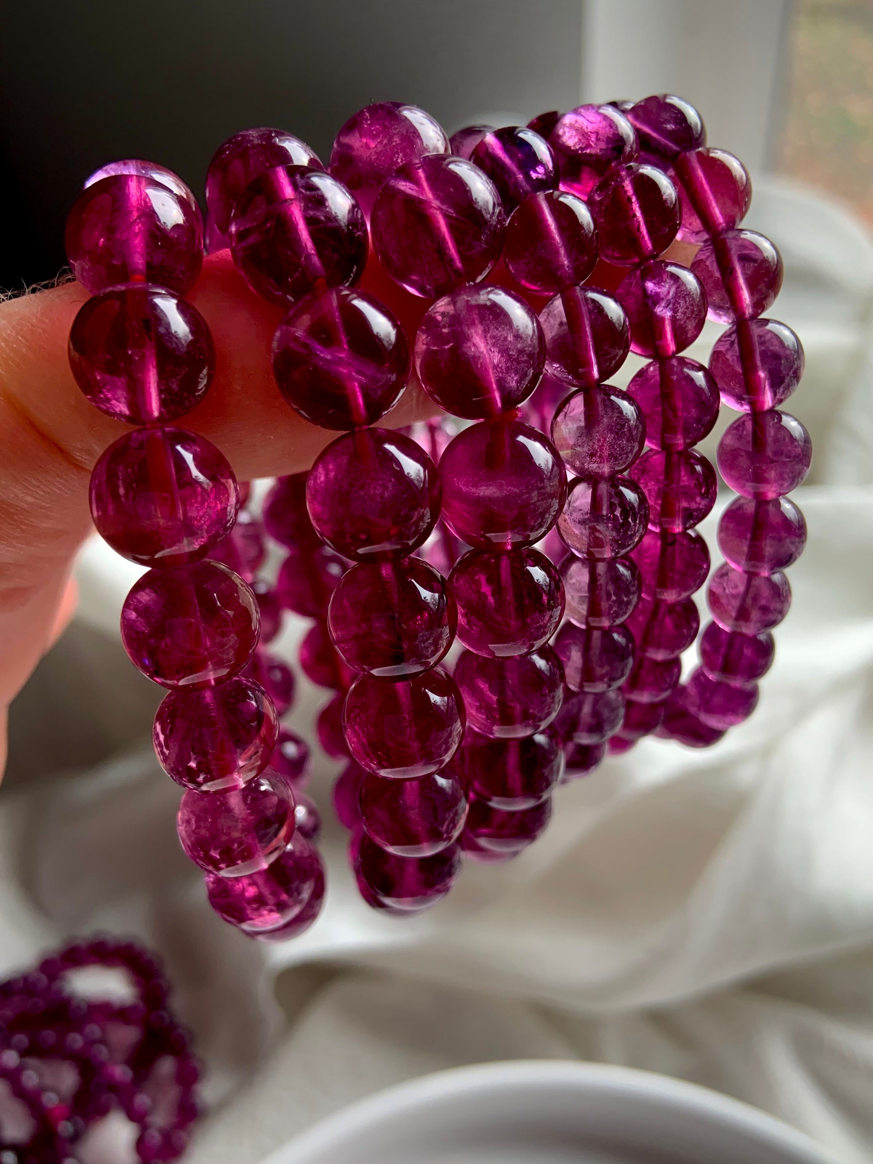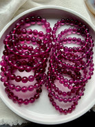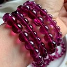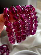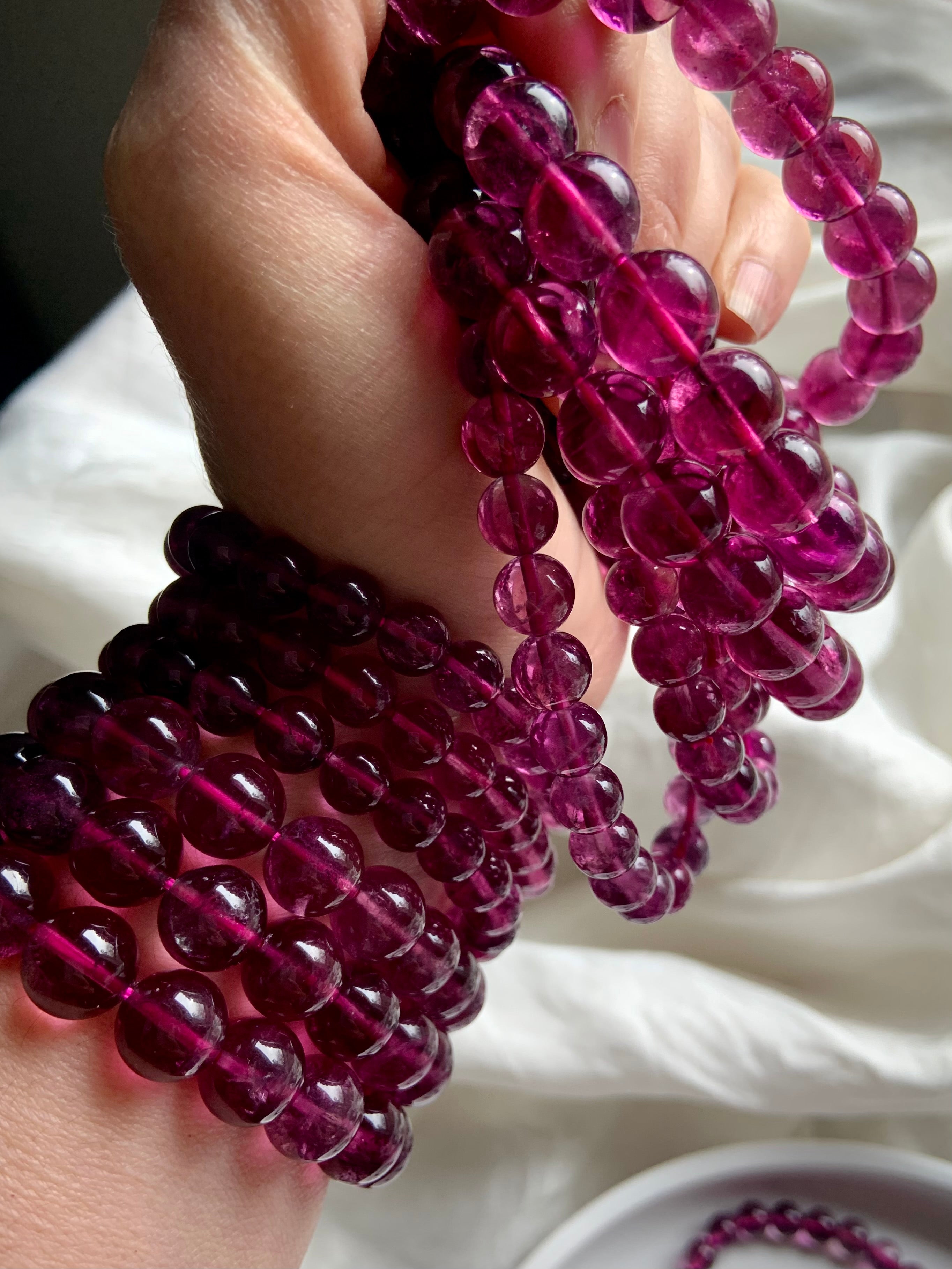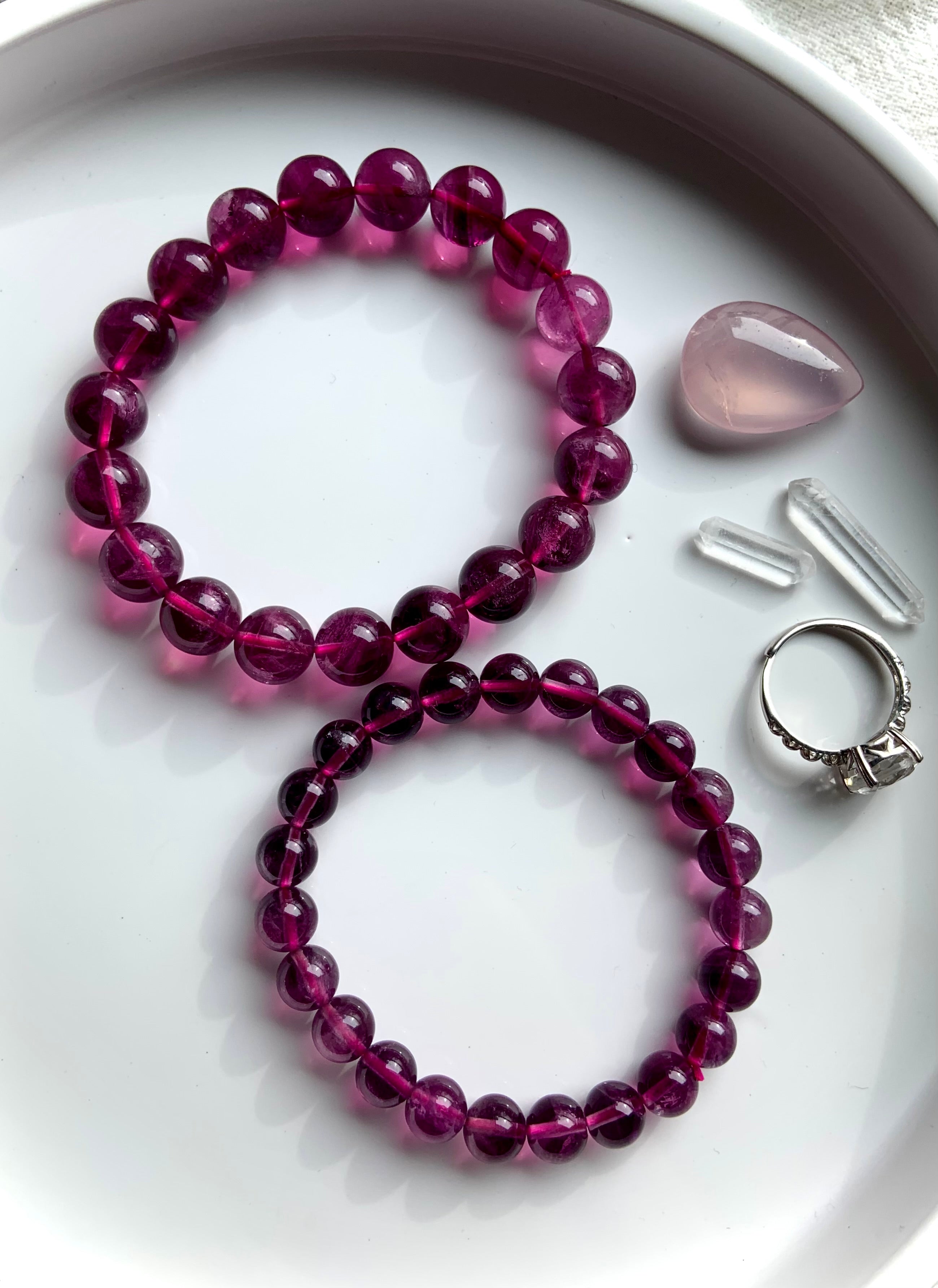 Wear one of these gorgeous Magenta Fluorite crystal bracelets + allow your heart to blossom. These rare, high quality Magenta Fluorite beaded bracelets are made from a glossy, saturated magenta colored fluorite crystal with a little dimension in the stone that captures the light beautifully, round beads strung on stretchy cord.