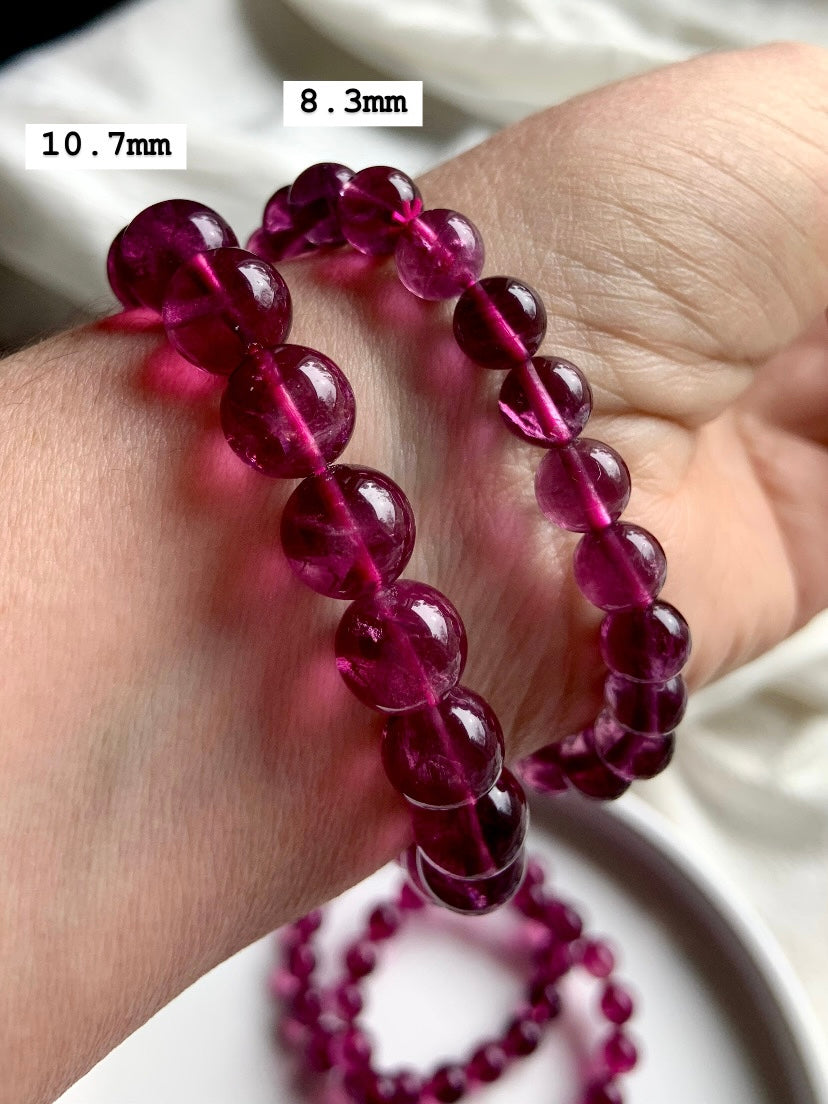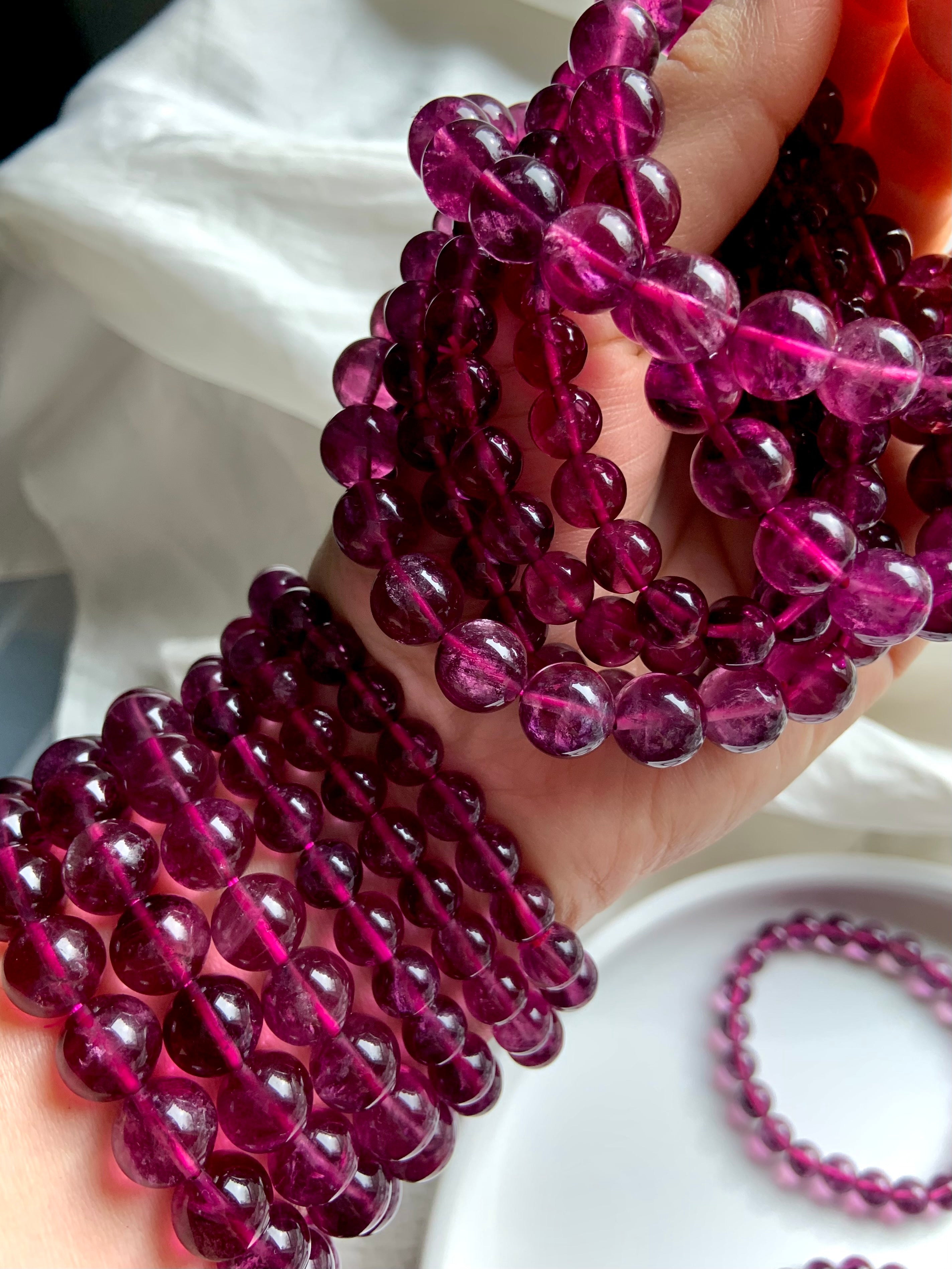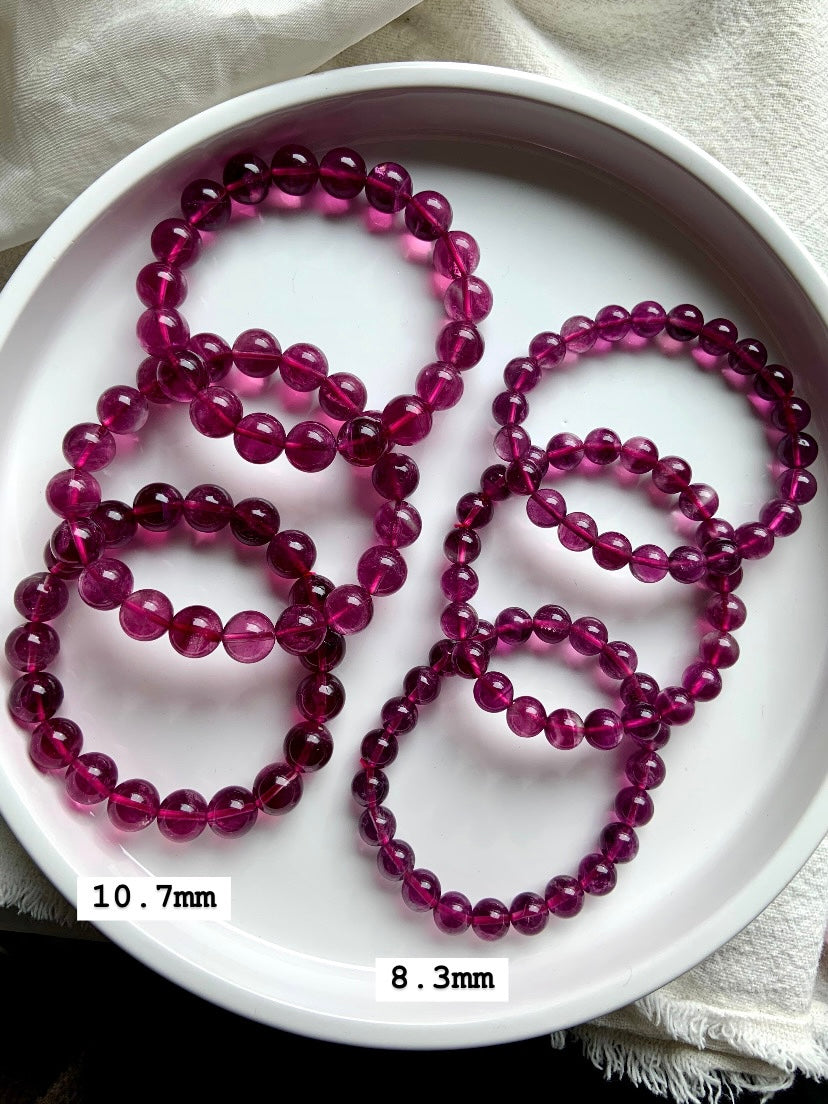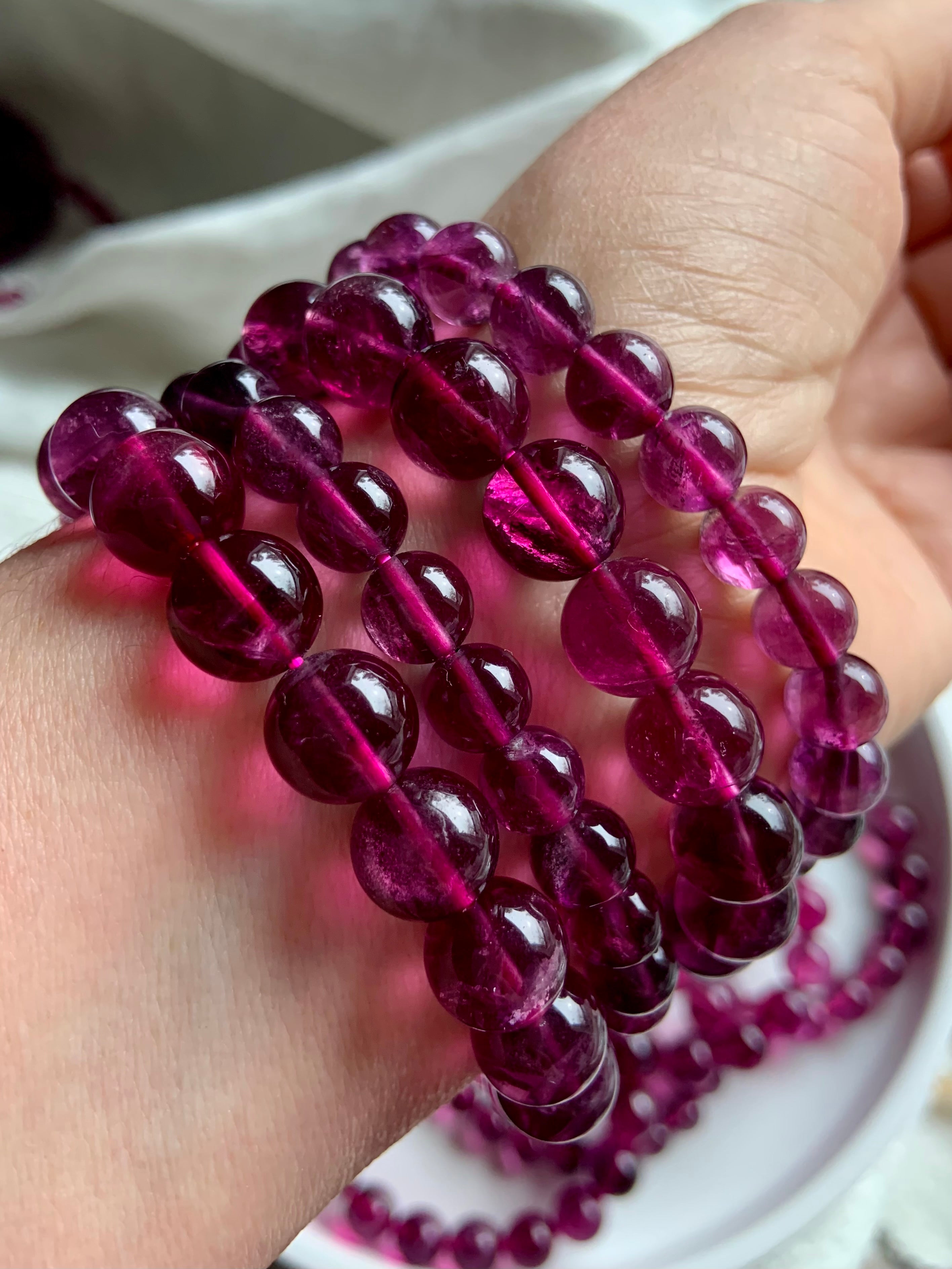 Wear one of these gorgeous Magenta Fluorite crystal bracelets + allow your heart to blossom. These rare, high quality Magenta Fluorite beaded bracelets are made from a glossy, saturated magenta colored fluorite crystal with a little dimension in the stone that captures the light beautifully, round beads strung on stretchy cord.
