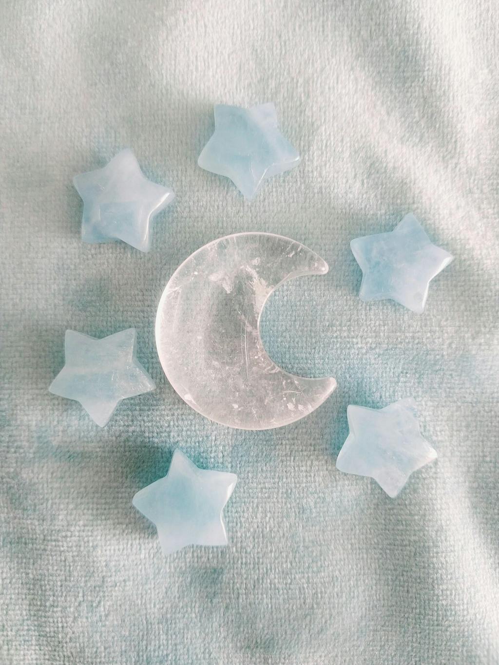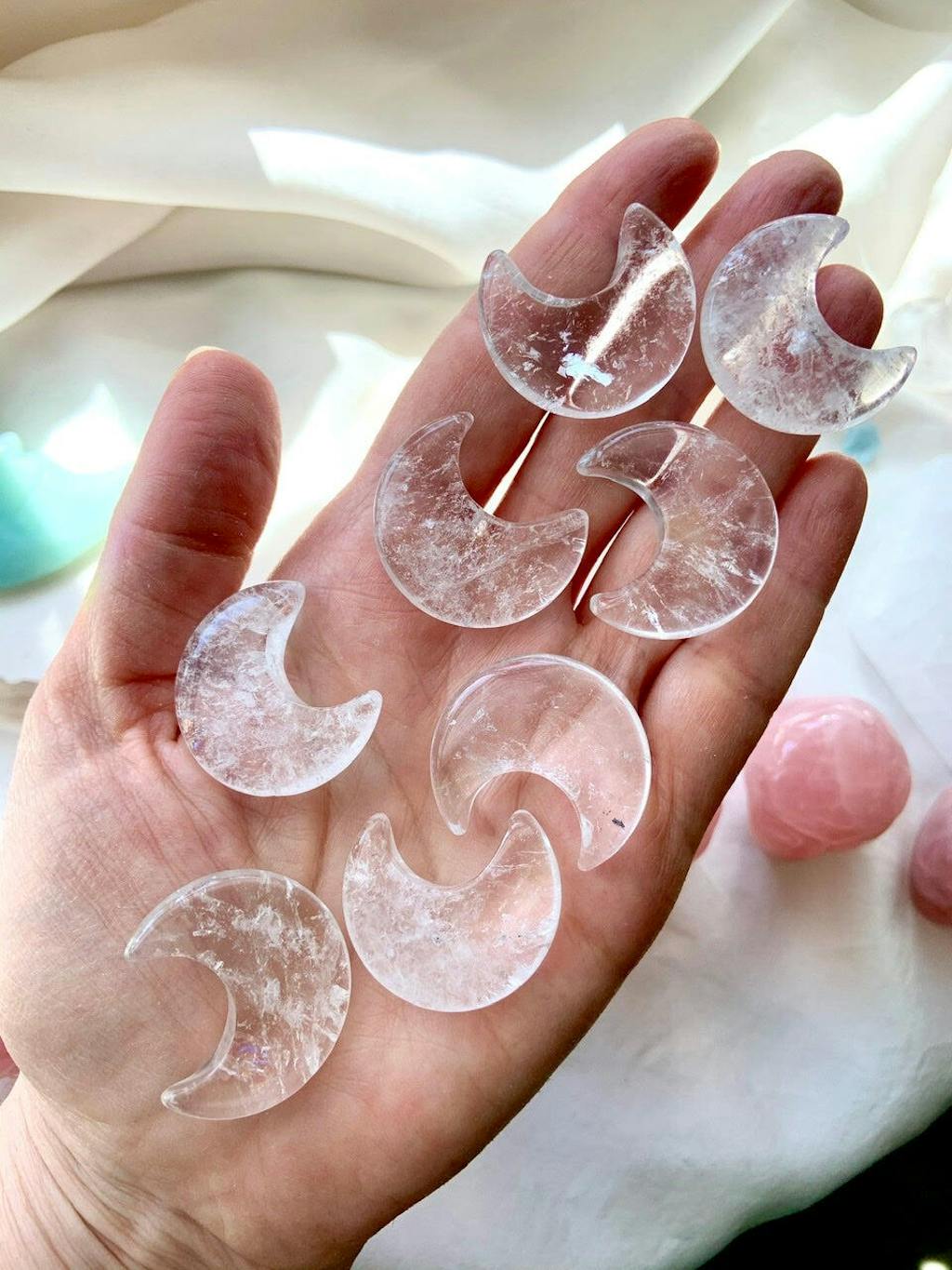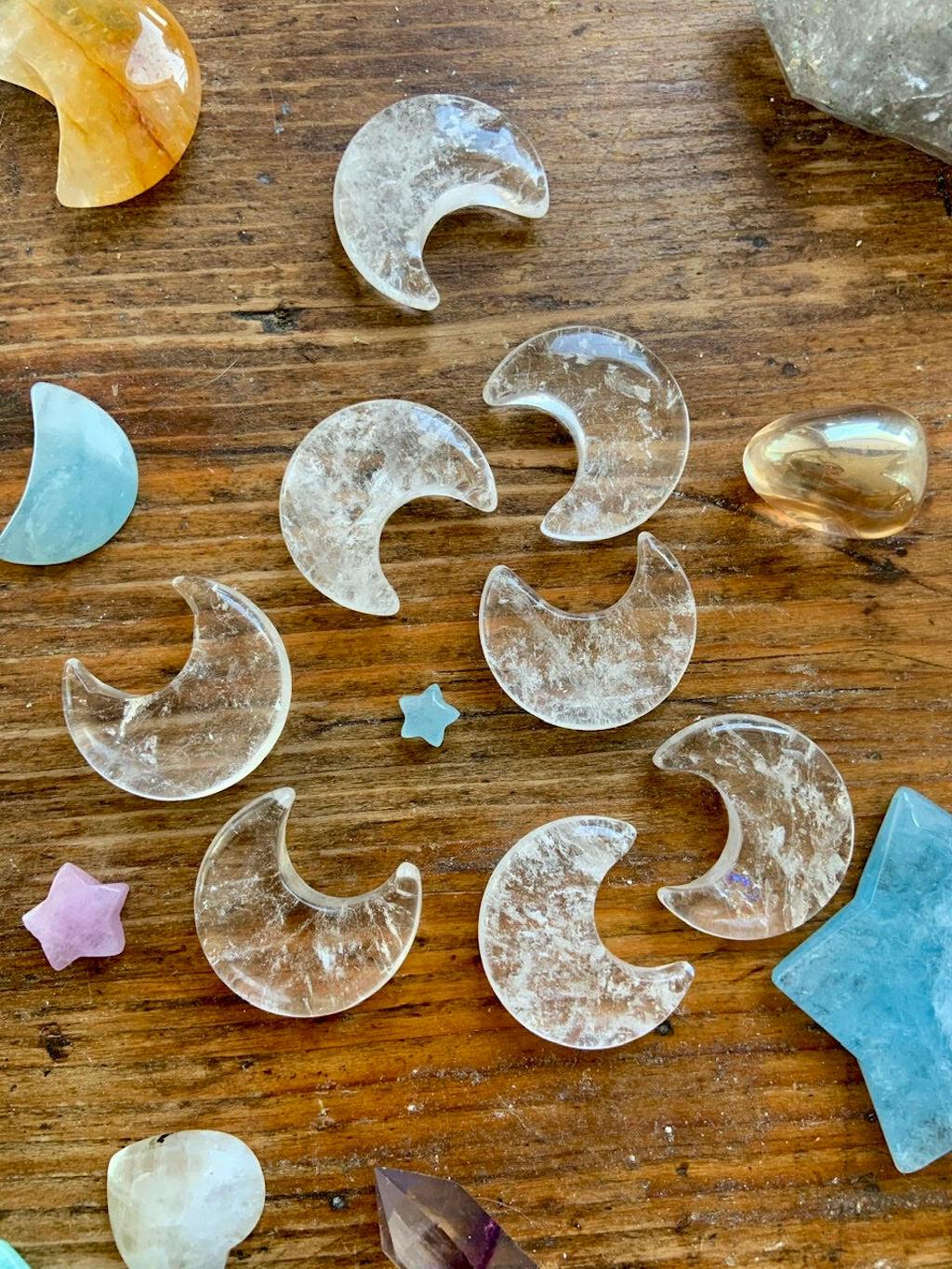 These small moons have slight variation in shape as shown in pics. These crystals are natural gifts from Gaia with unique variances in shape, size, interior patterns, mineral inclusions + clarity. Intuitively chosen just for you.