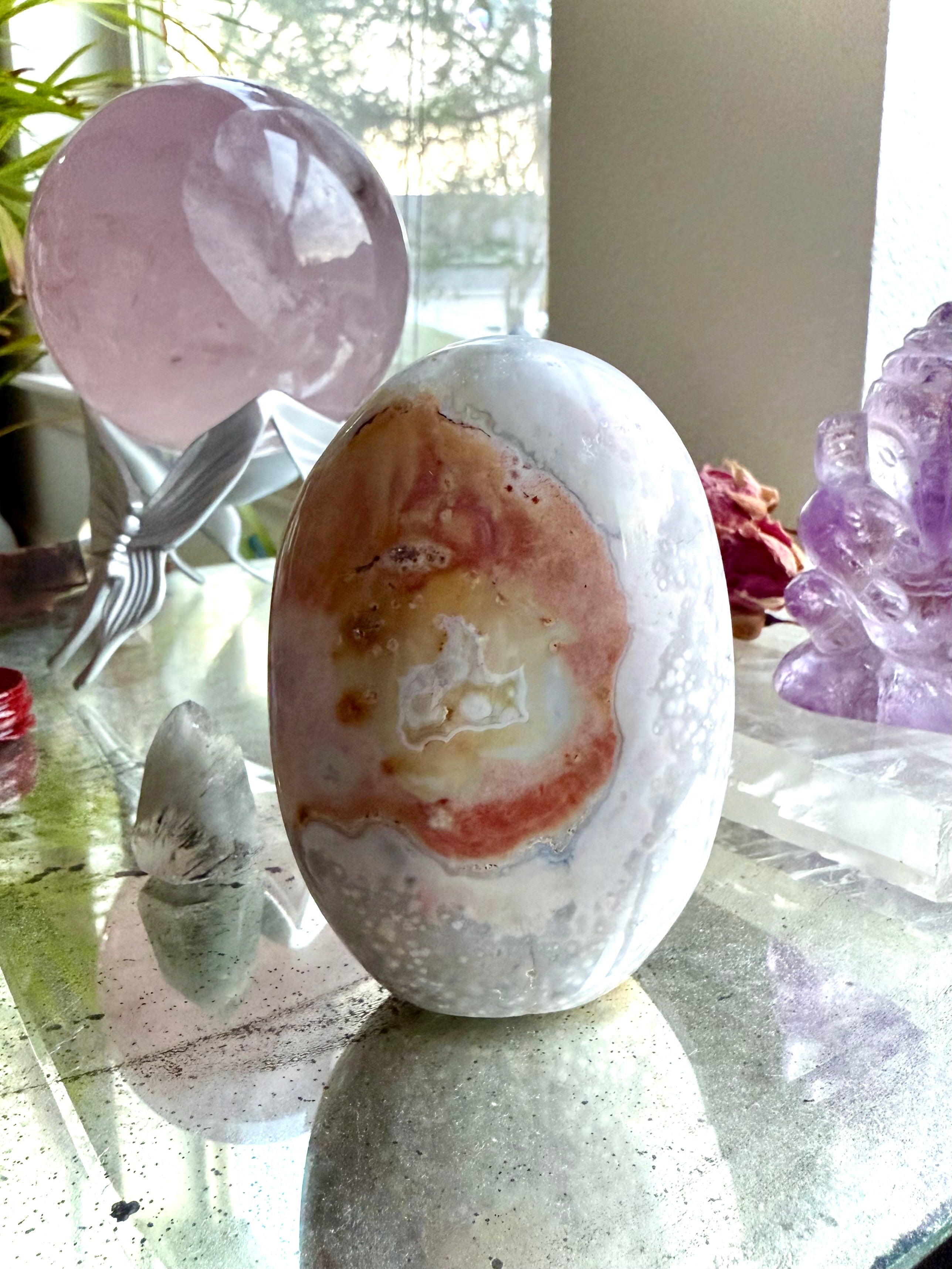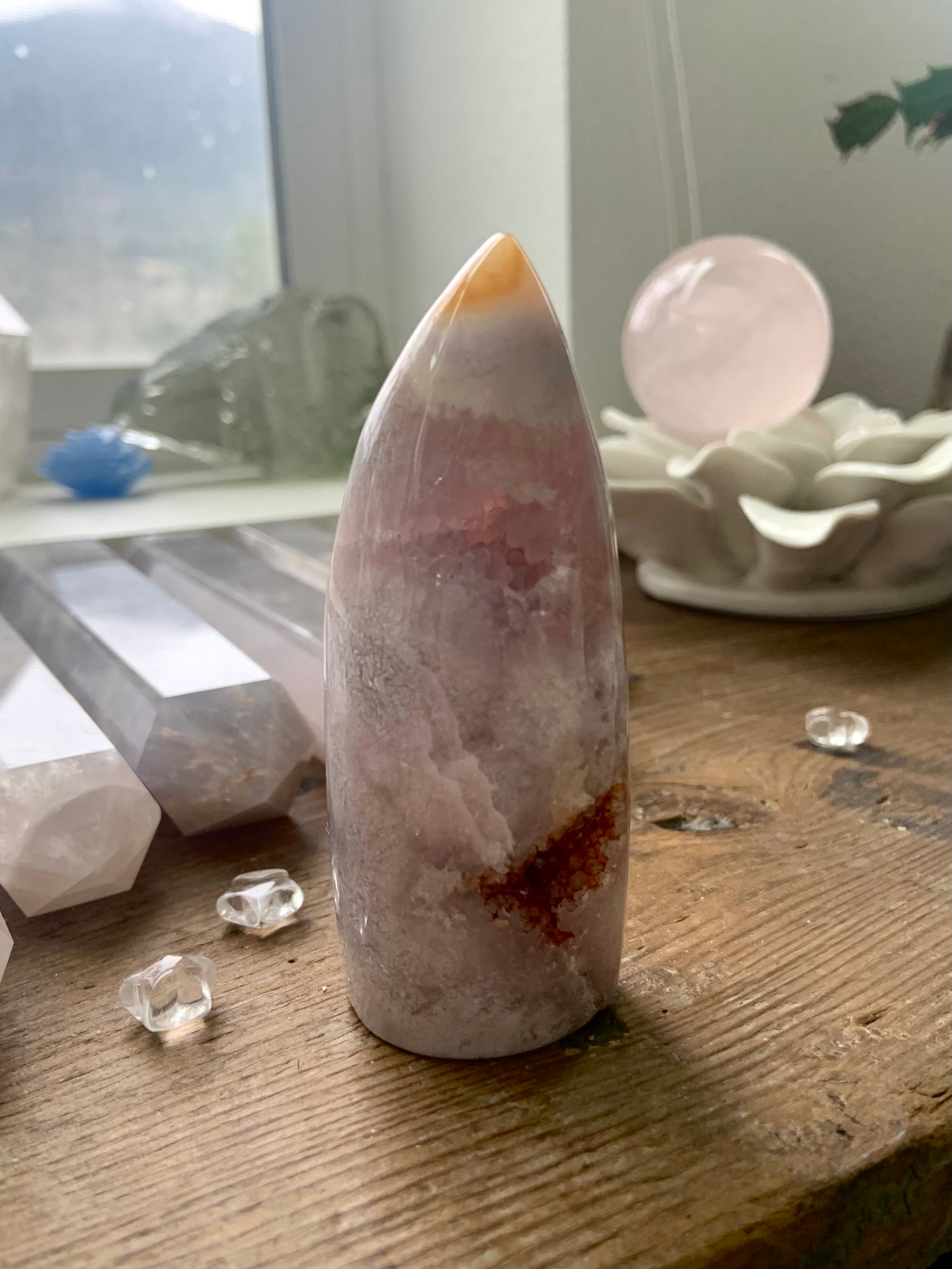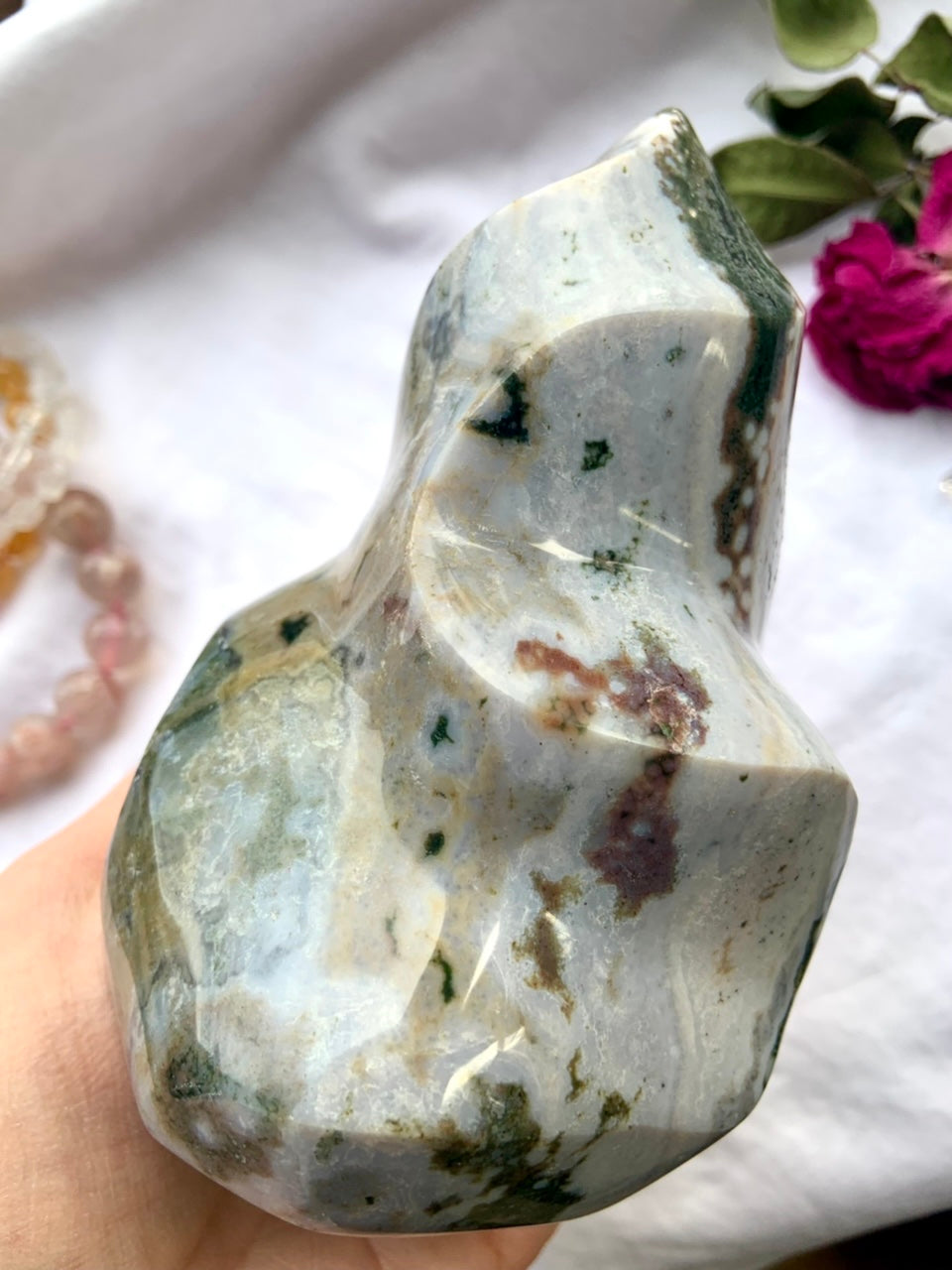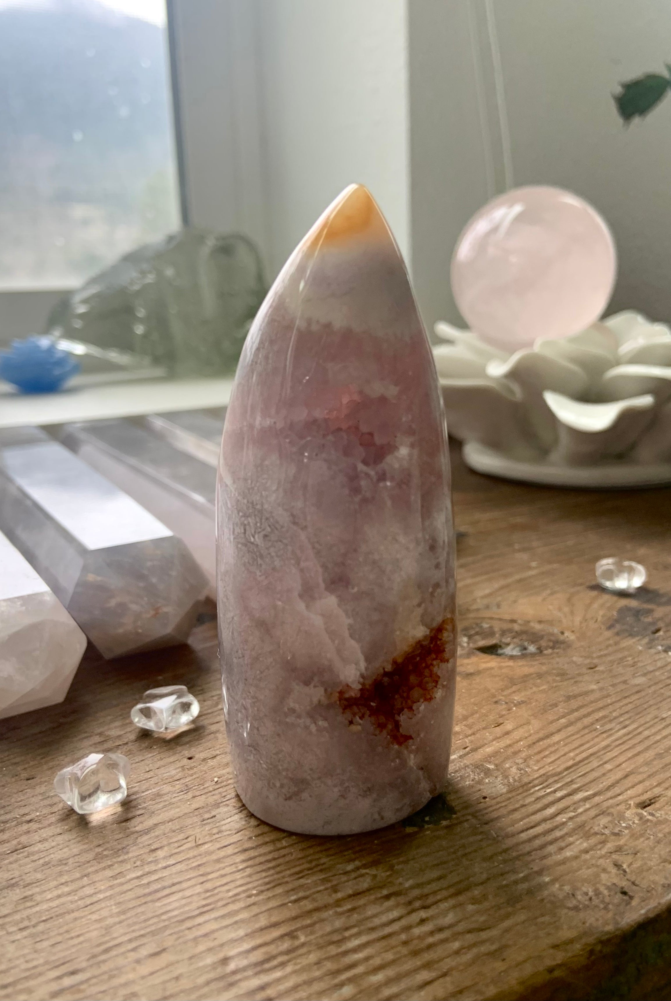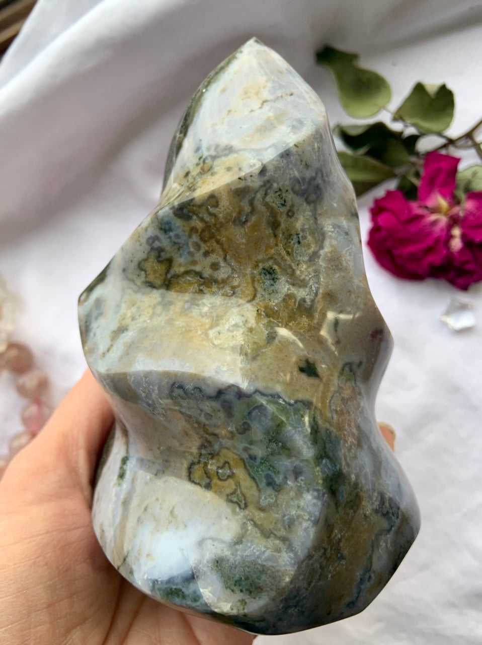 Crafted from high-vibrational crystals like Garden Quartz, Orca Agate, Rose Quartz, Ocean Jasper, Fire Quartz, and Labradorite, these one-of-a-kind, hand shaped pieces bring powerful presence and energy to any space. Freeforms capture the raw elegance of the Earth, while flame carvings symbolize transformation, passion, and the spark of inner power.