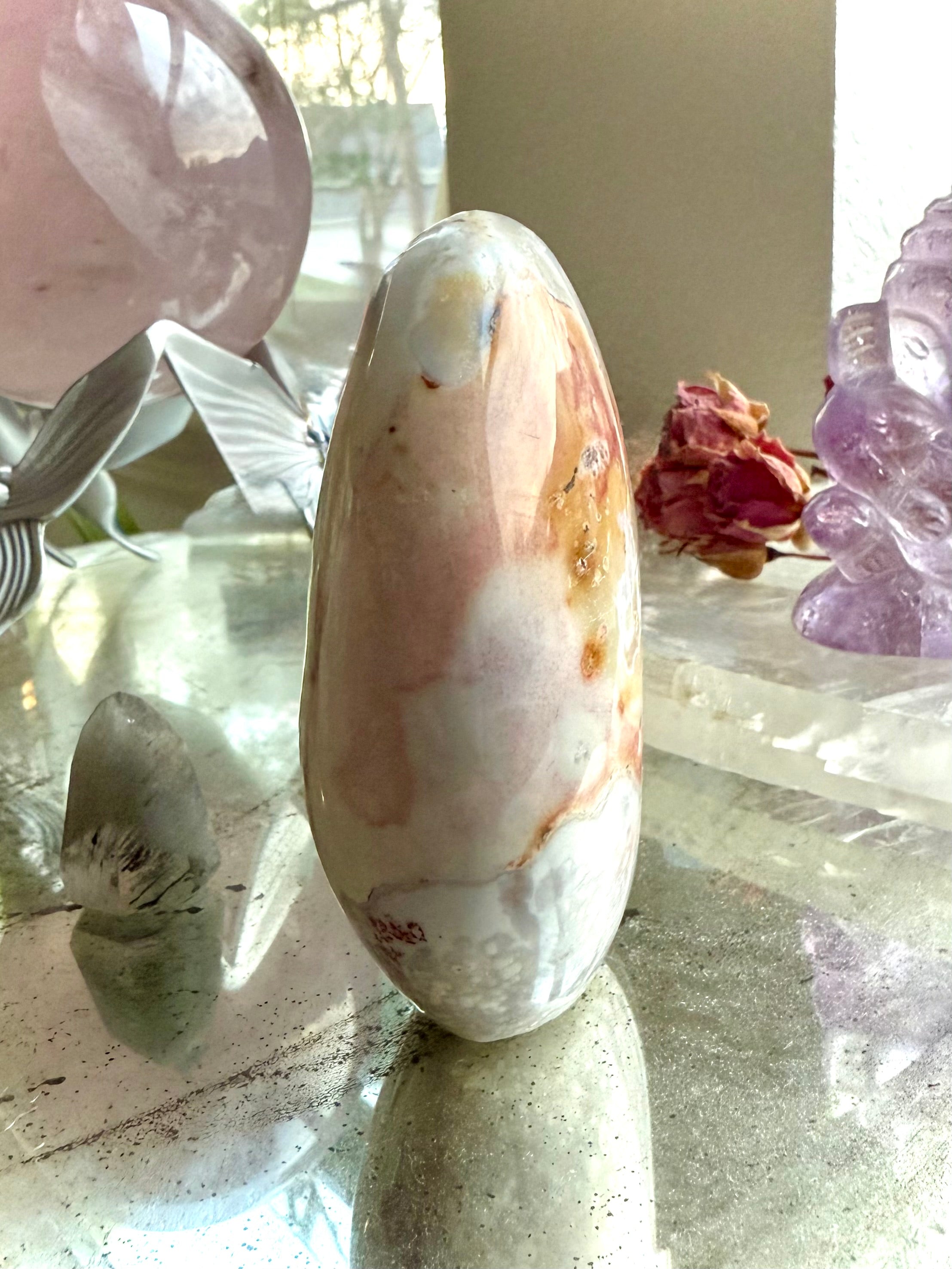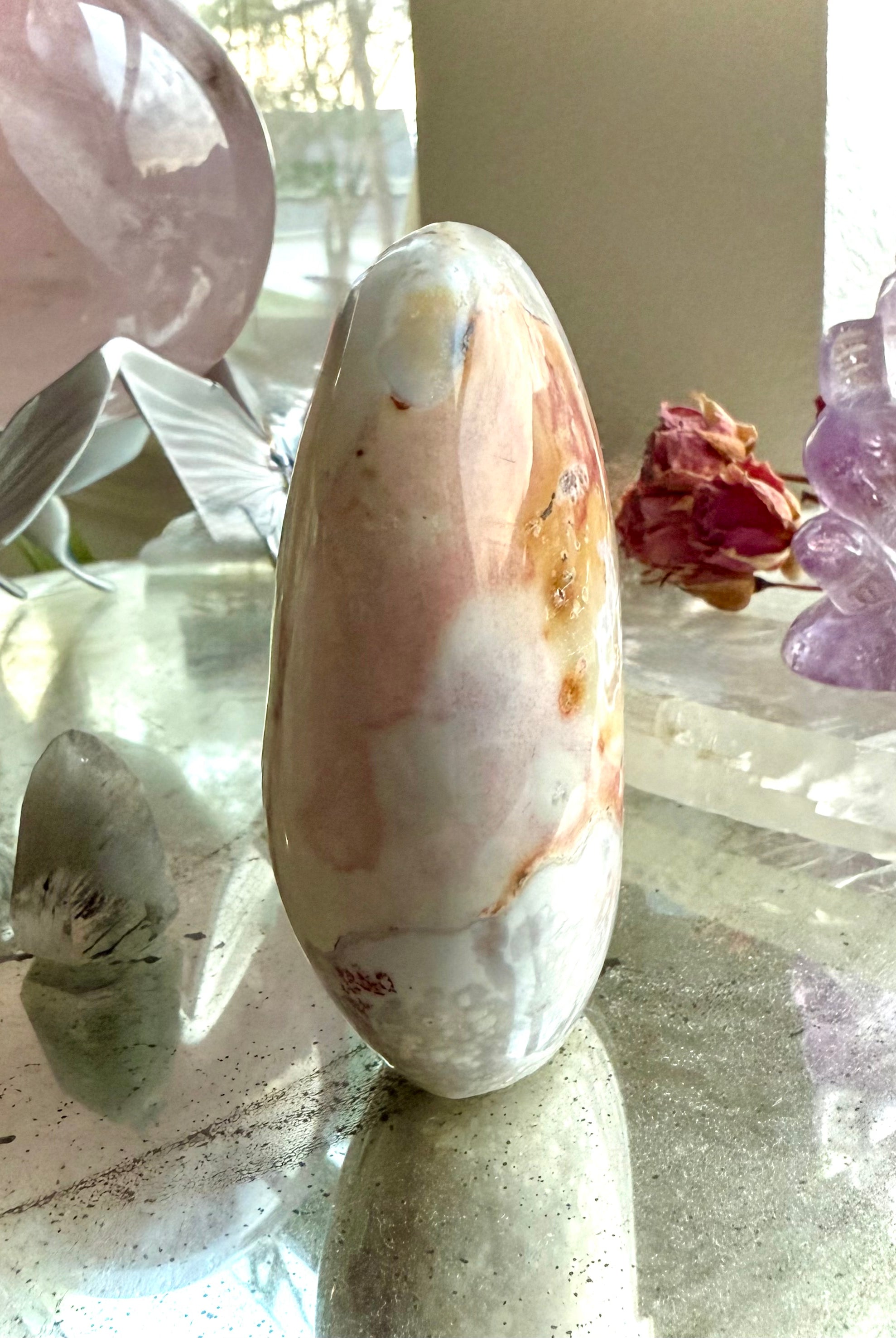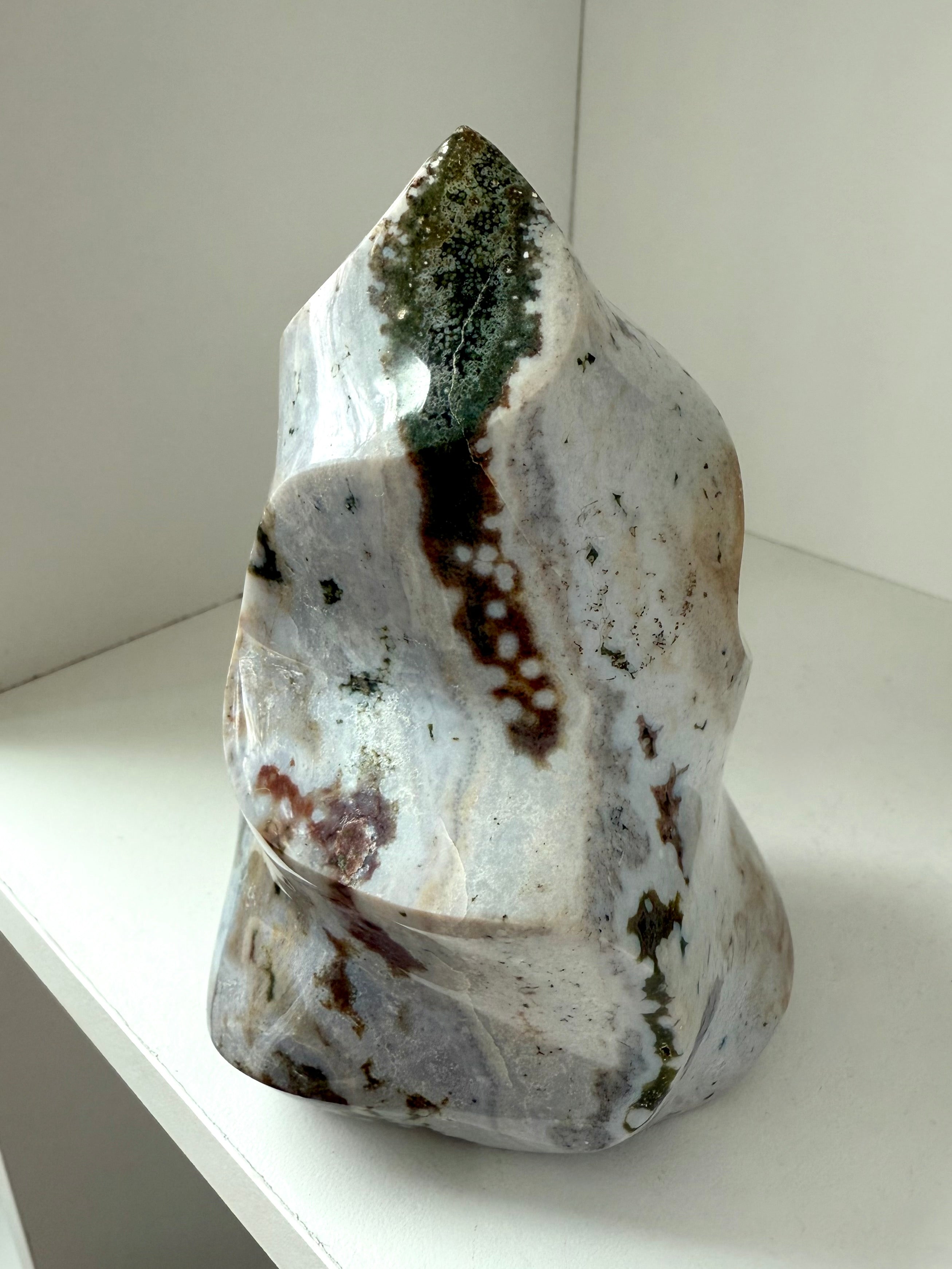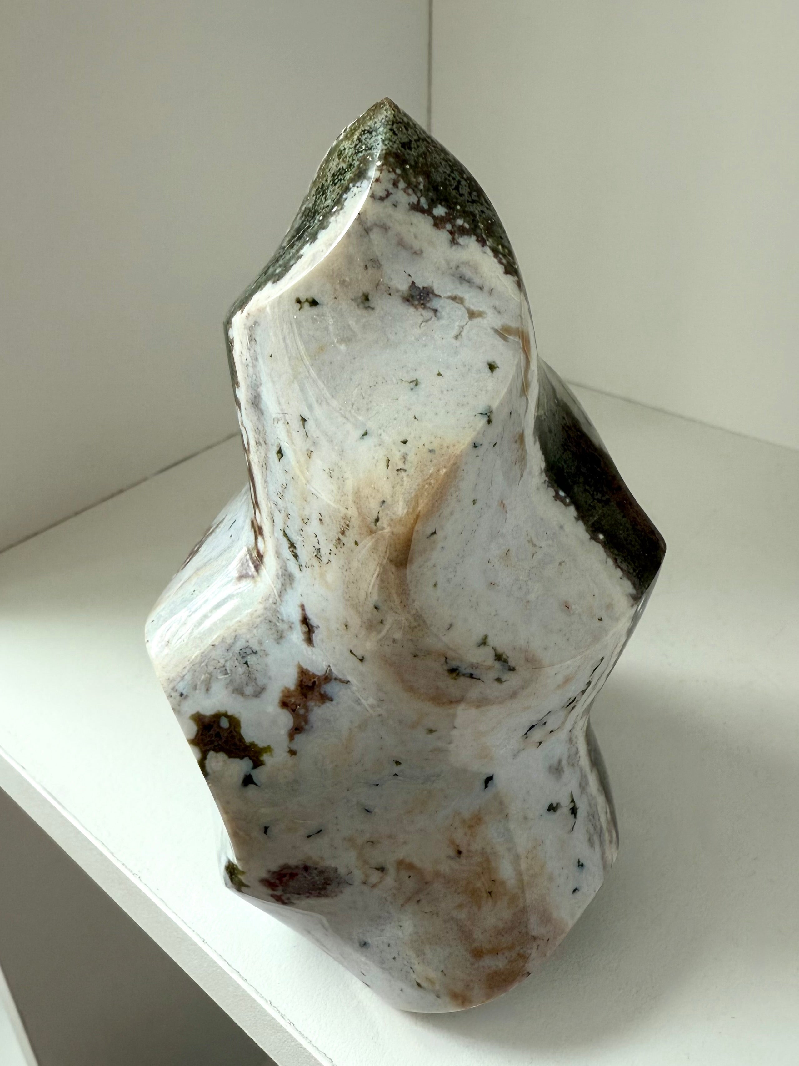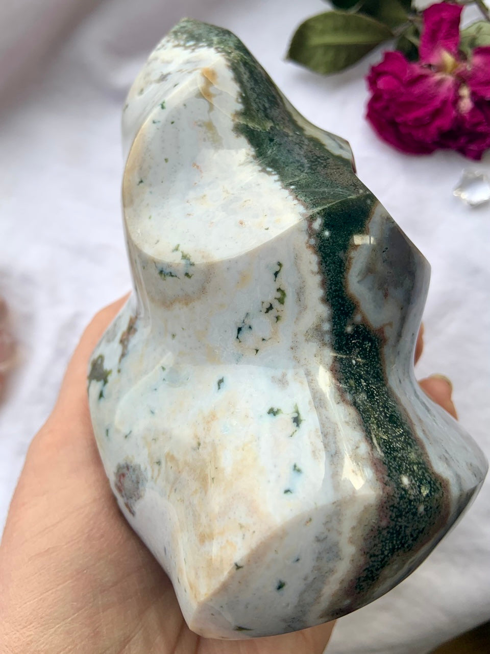 Crafted from high-vibrational crystals like Garden Quartz, Orca Agate, Rose Quartz, Ocean Jasper, Fire Quartz, and Labradorite, these one-of-a-kind, hand shaped pieces bring powerful presence and energy to any space. Freeforms capture the raw elegance of the Earth, while flame carvings symbolize transformation, passion, and the spark of inner power.