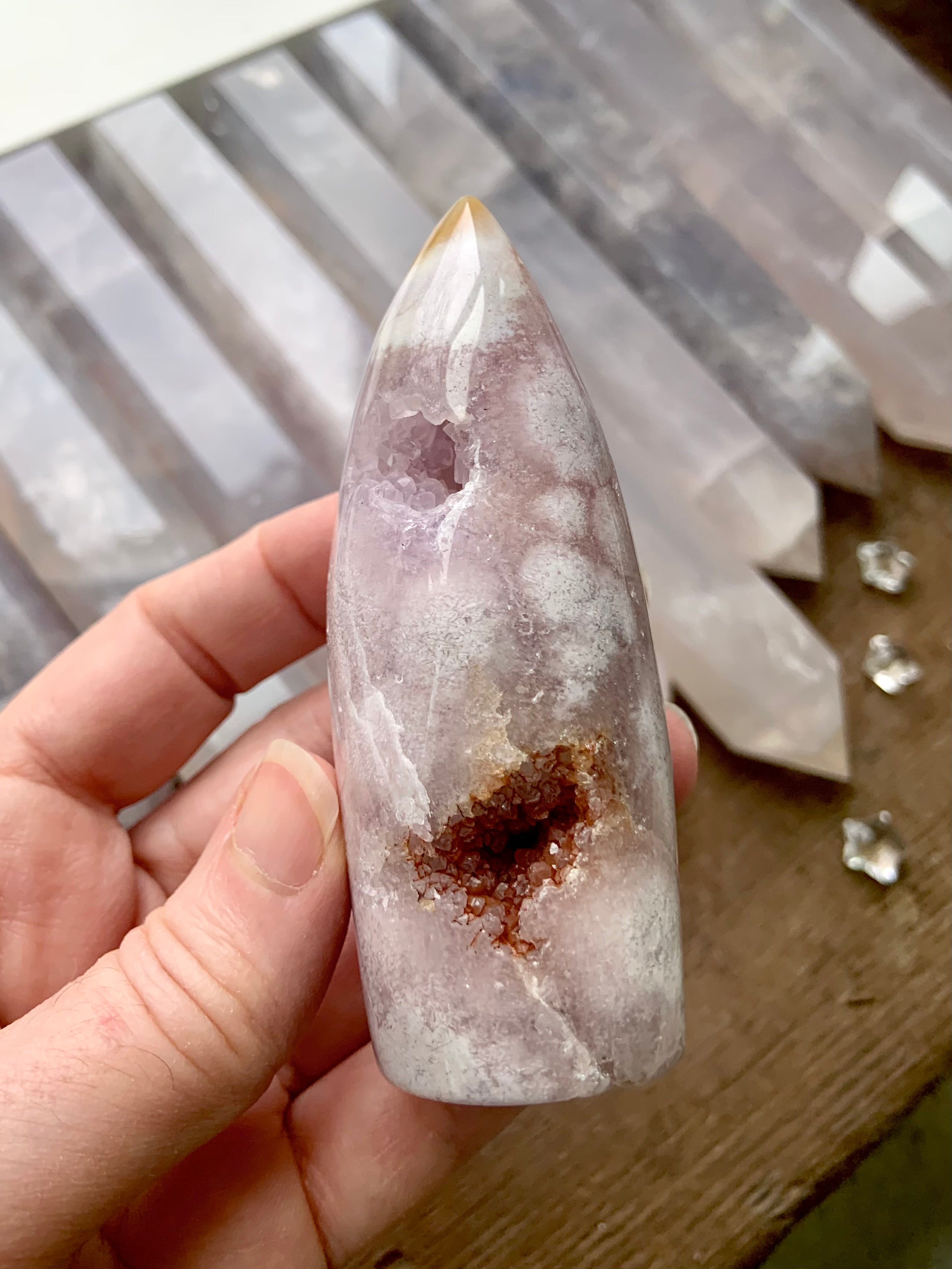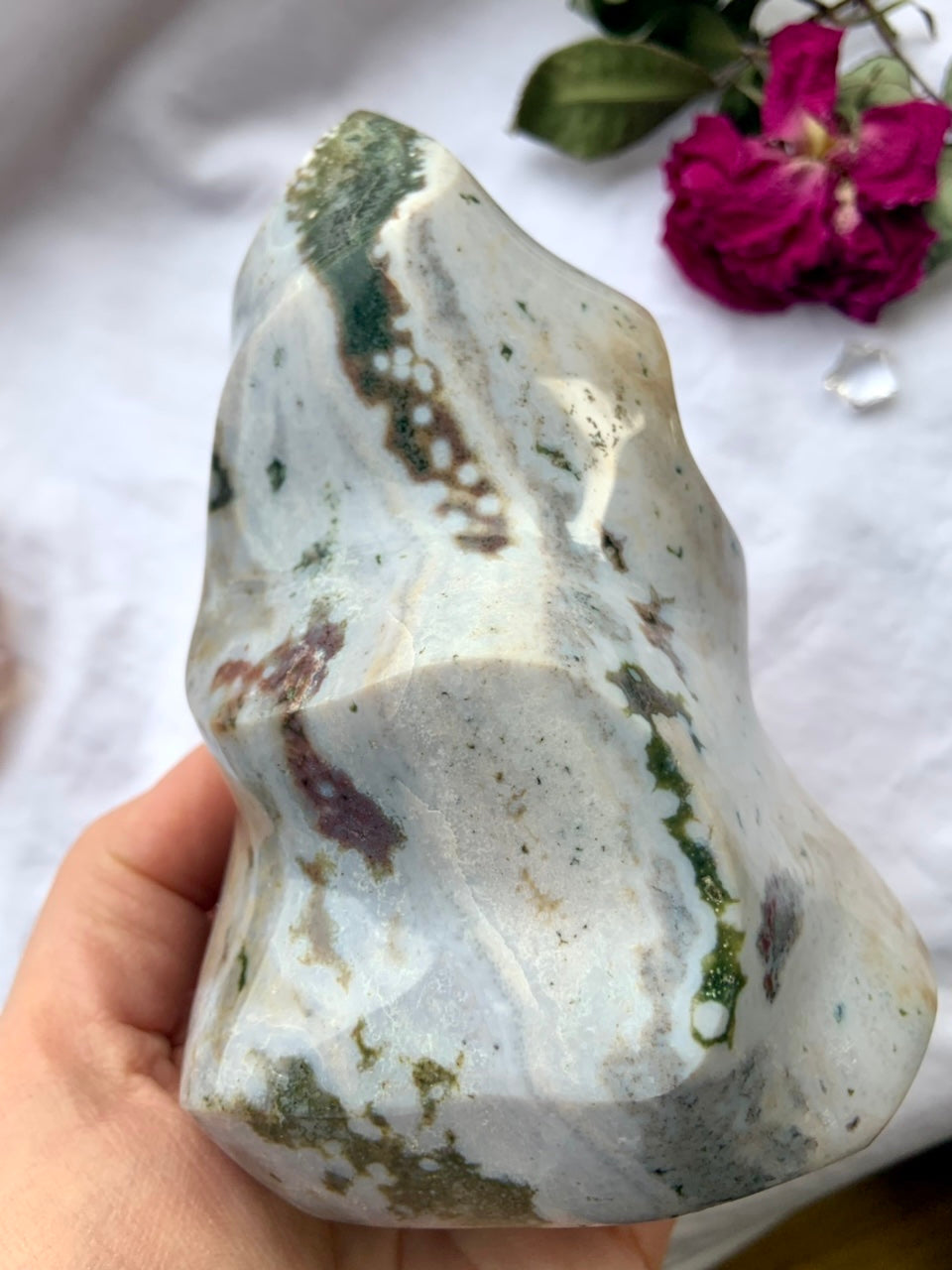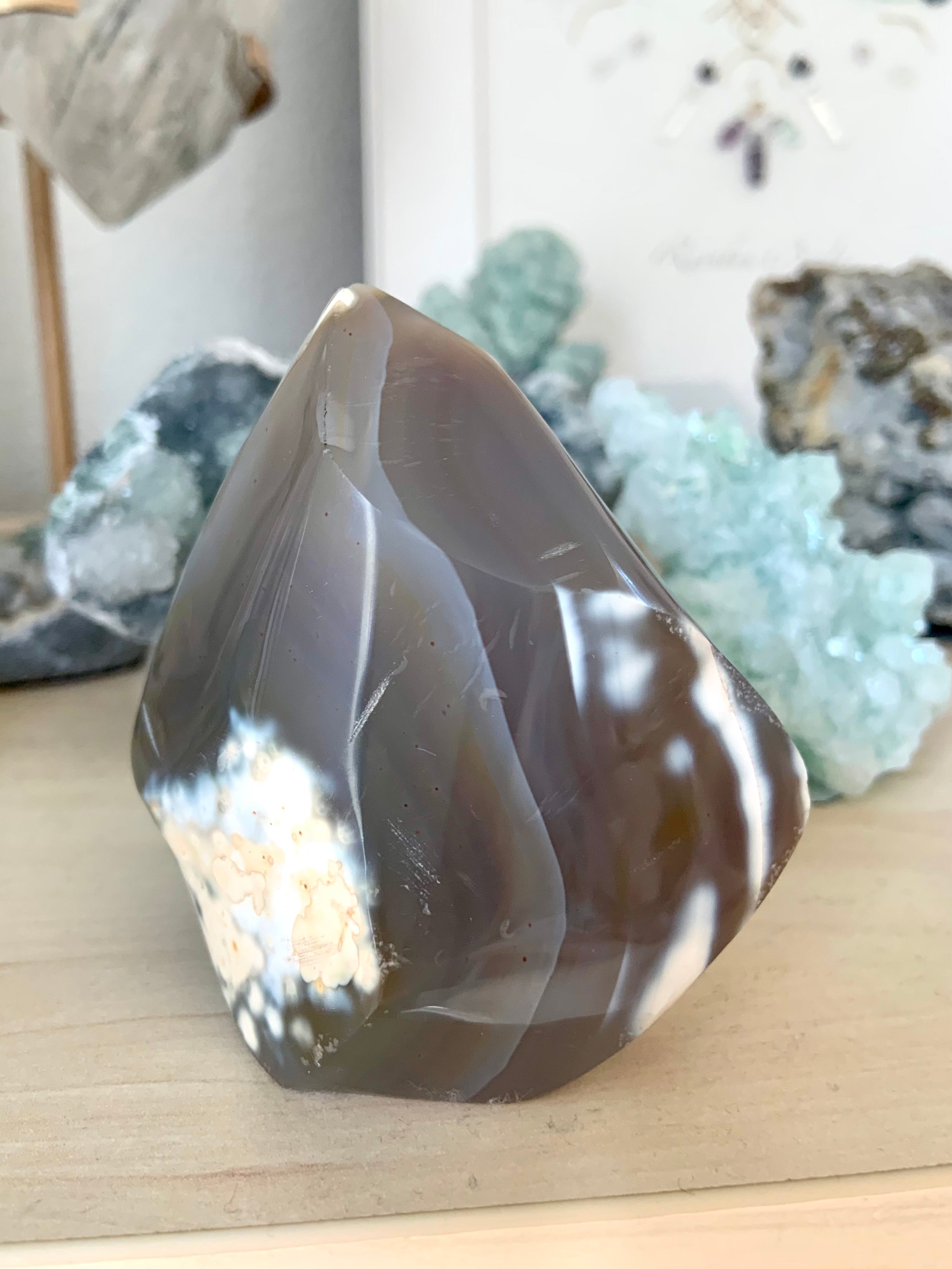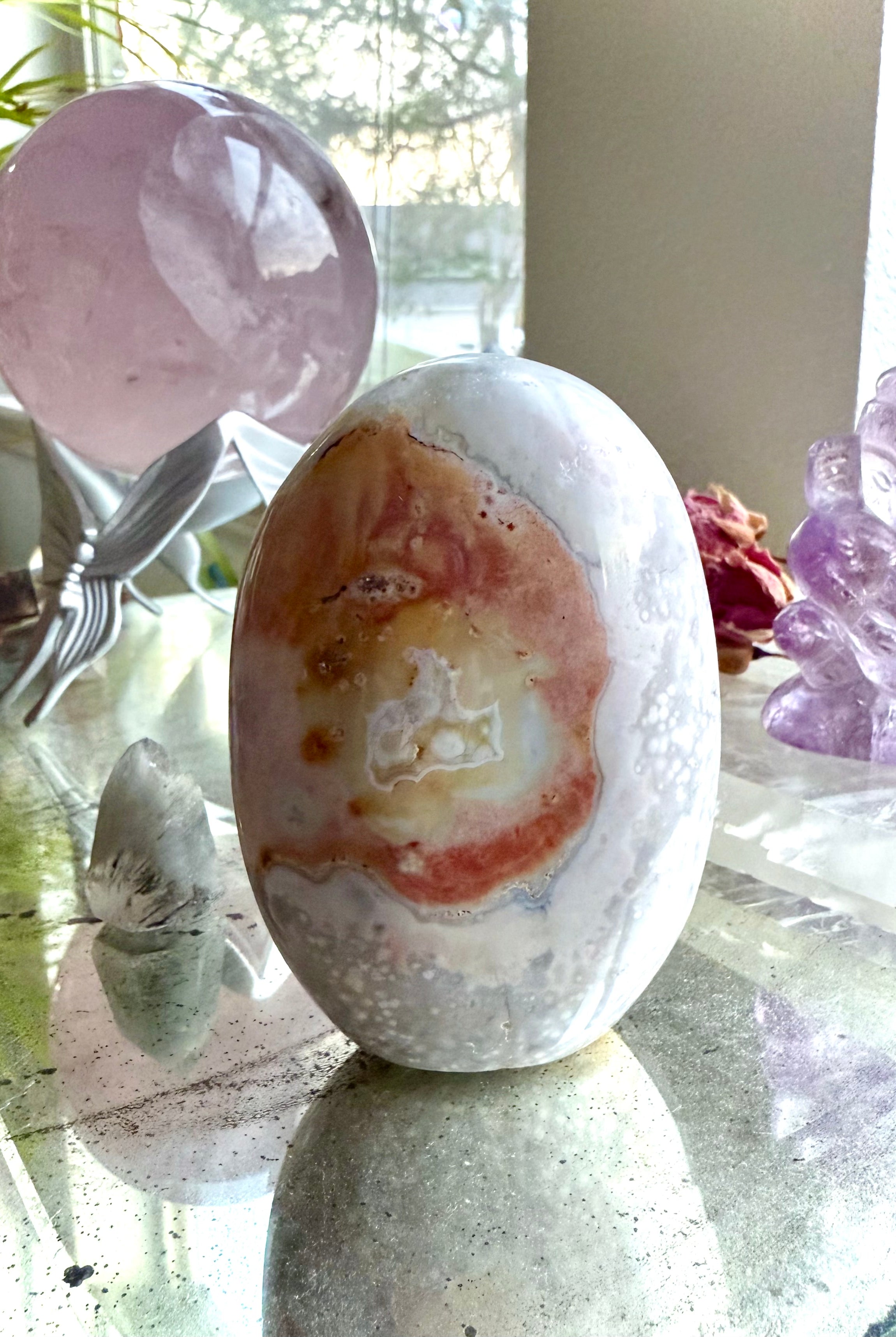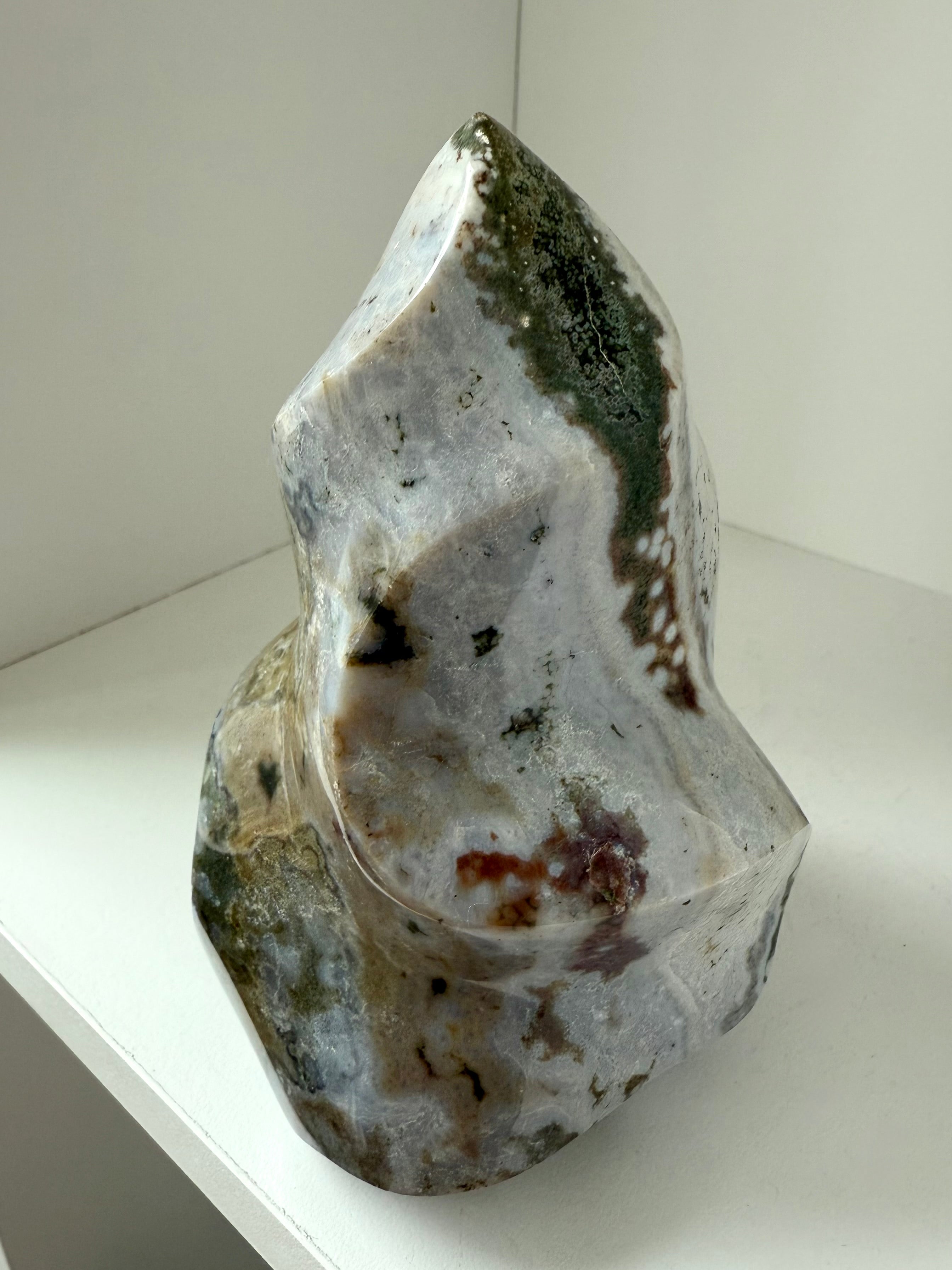 Crafted from high-vibrational crystals like Garden Quartz, Orca Agate, Rose Quartz, Ocean Jasper, Fire Quartz, and Labradorite, these one-of-a-kind, hand shaped pieces bring powerful presence and energy to any space. Freeforms capture the raw elegance of the Earth, while flame carvings symbolize transformation, passion, and the spark of inner power.