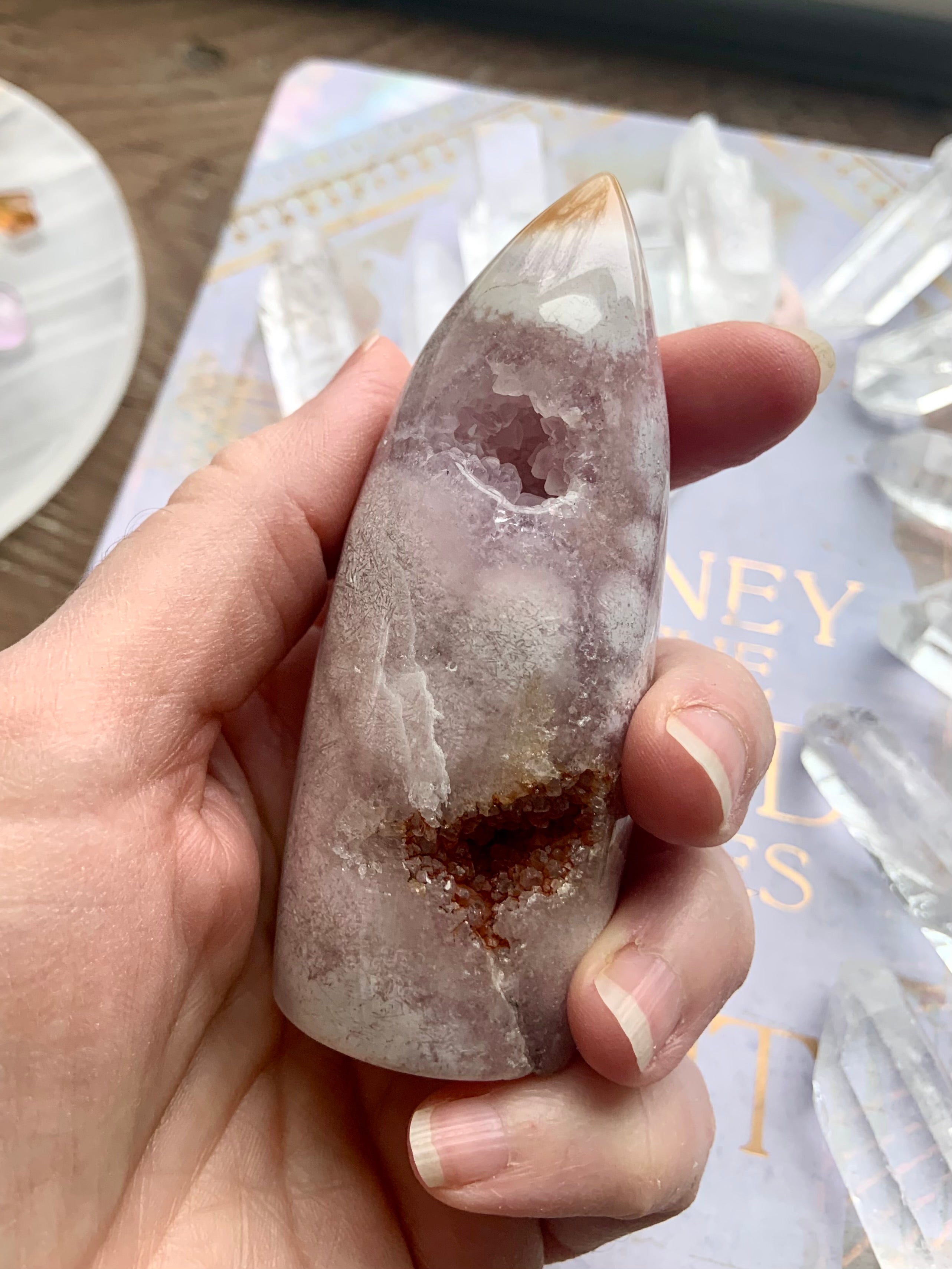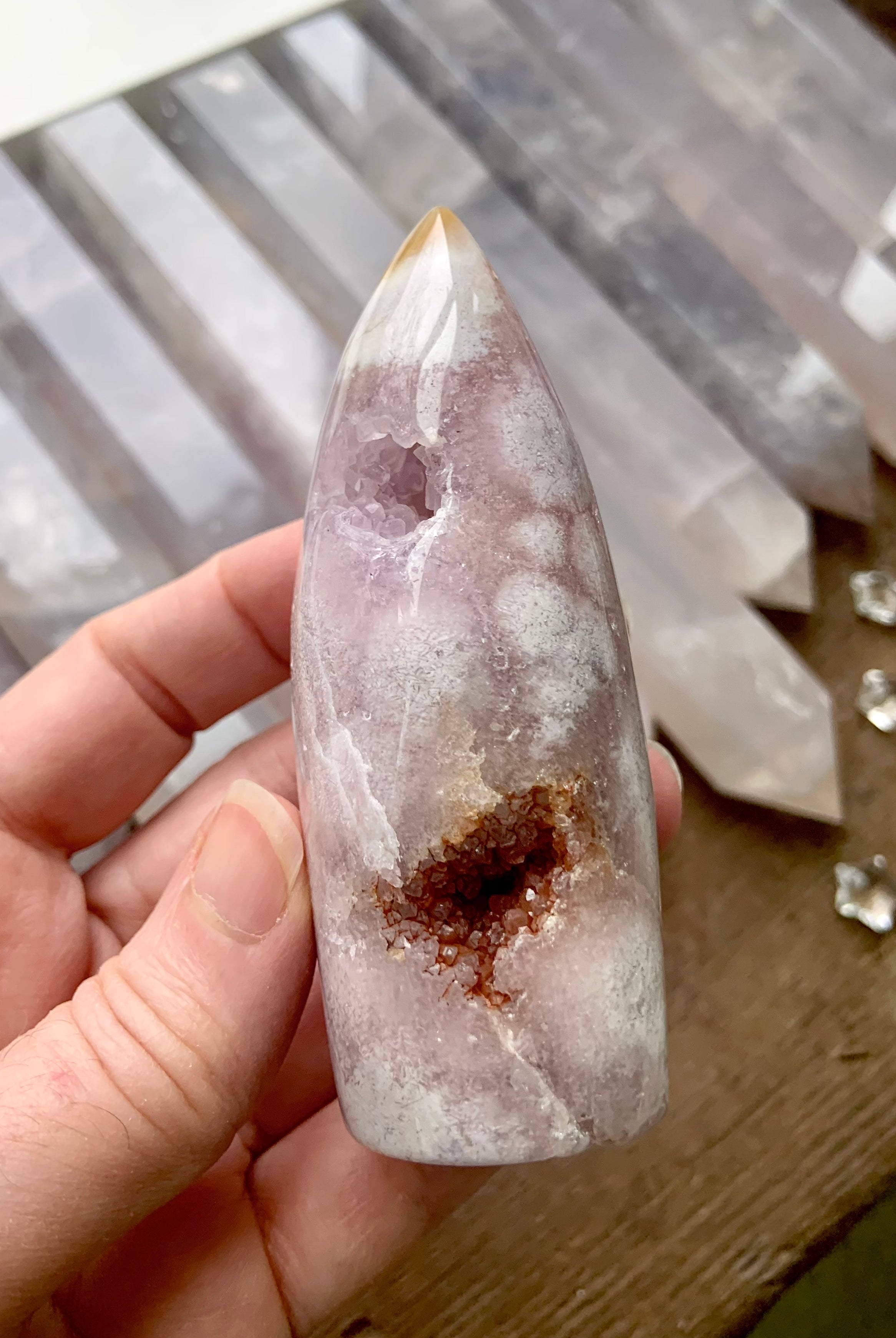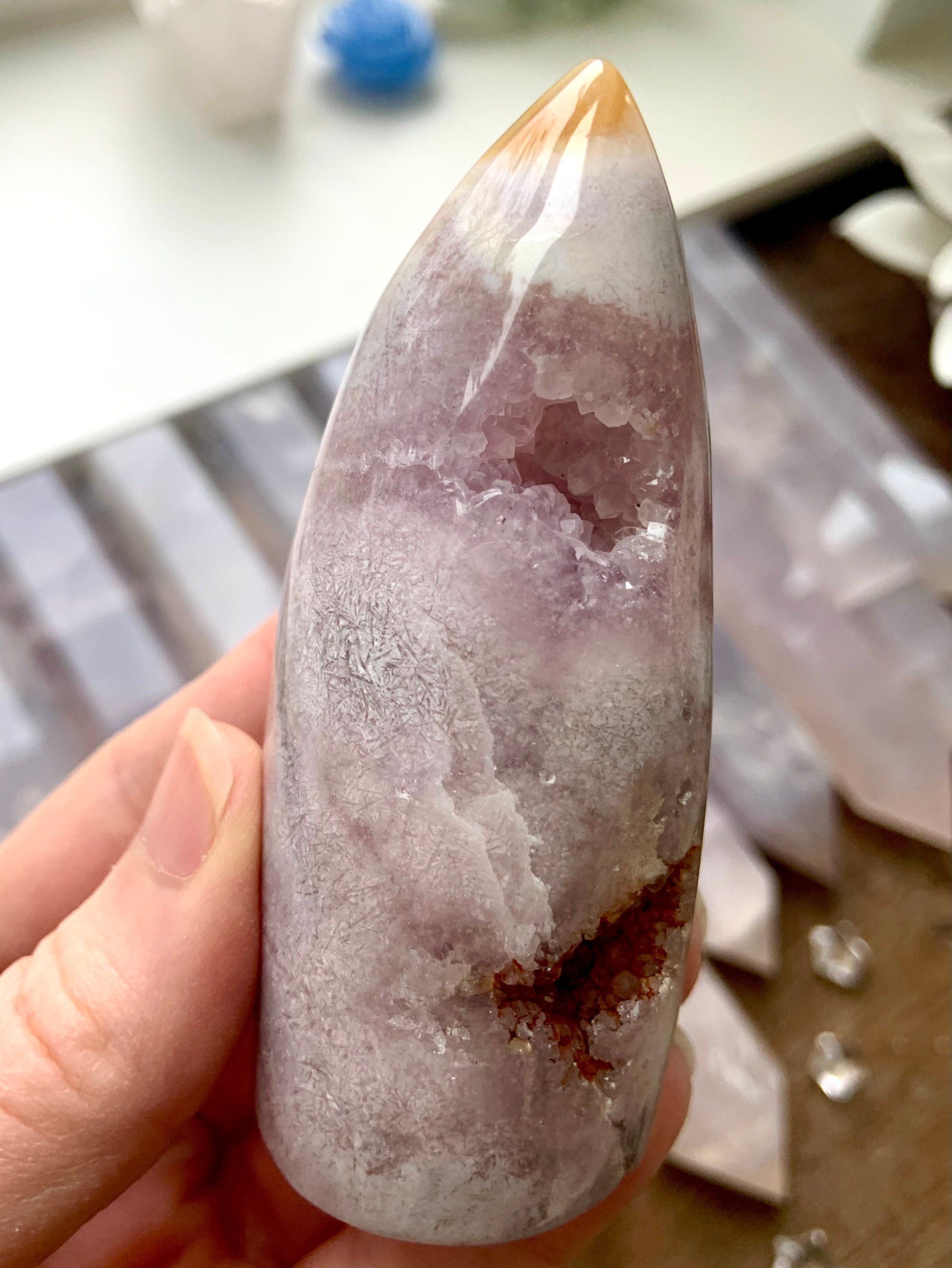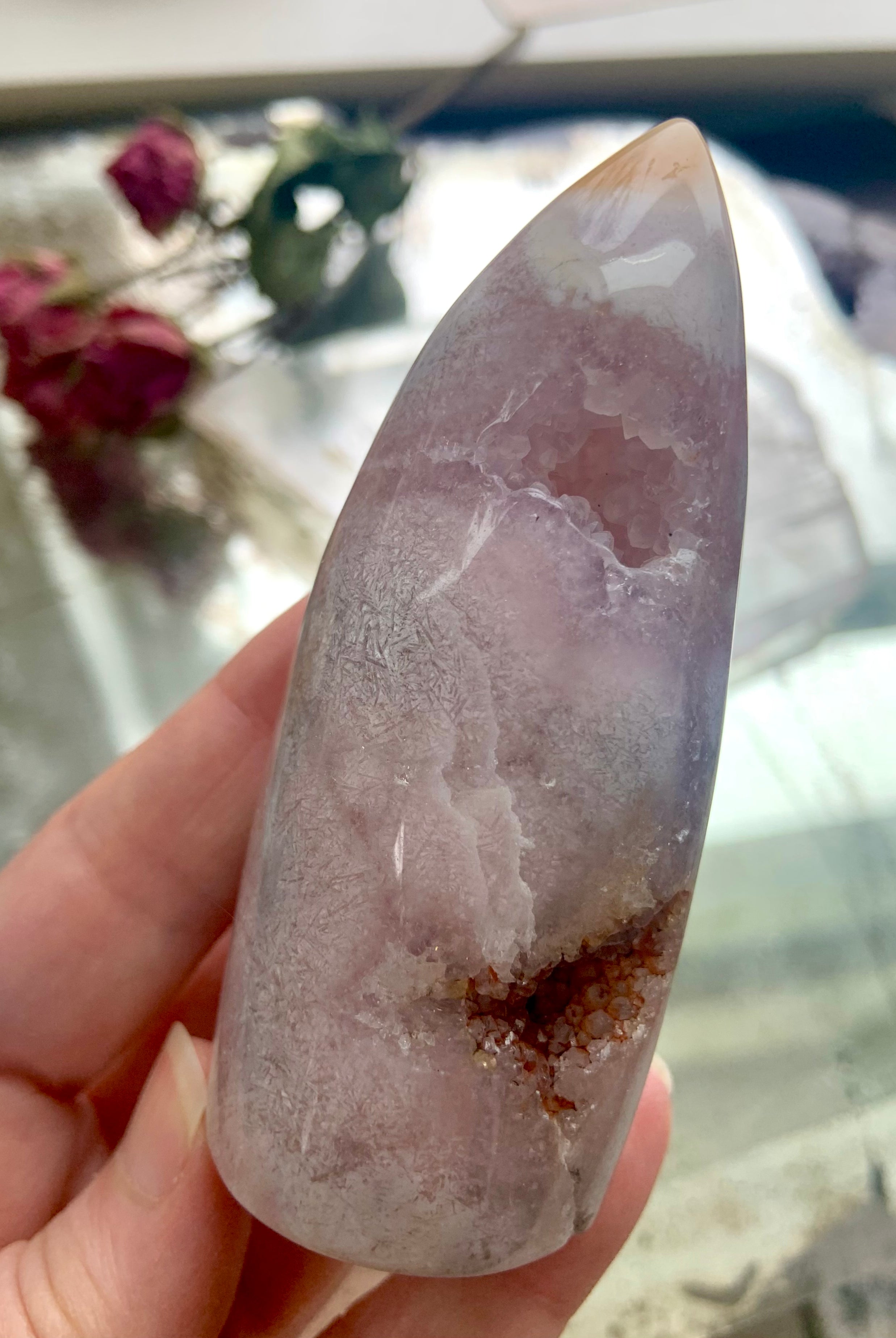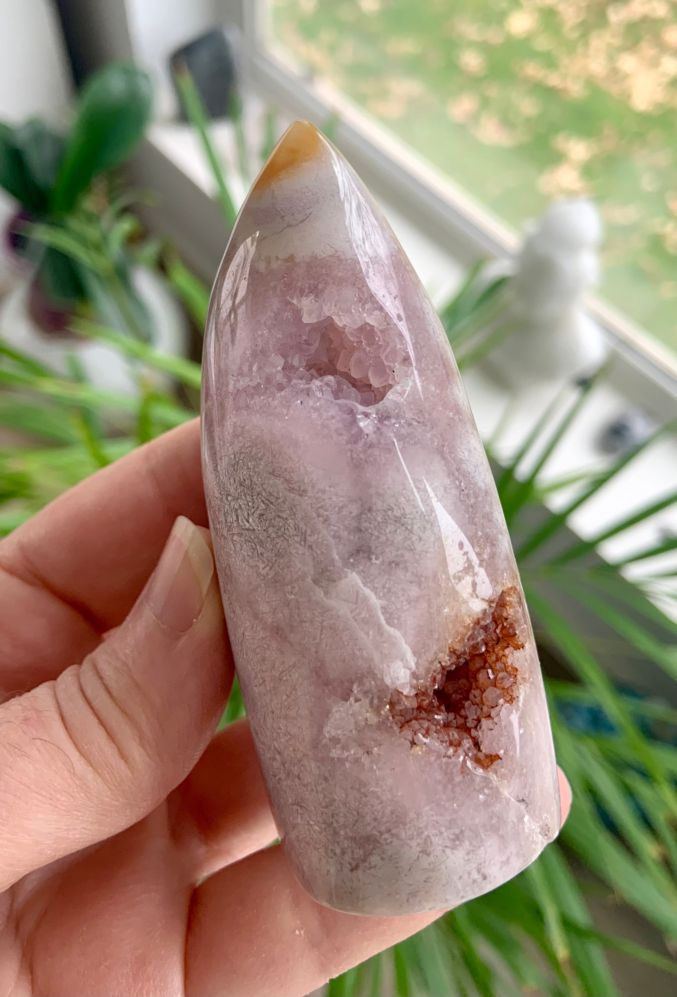 Crafted from high-vibrational crystals like Garden Quartz, Orca Agate, Rose Quartz, Ocean Jasper, Fire Quartz, and Labradorite, these one-of-a-kind, hand shaped pieces bring powerful presence and energy to any space. Freeforms capture the raw elegance of the Earth, while flame carvings symbolize transformation, passion, and the spark of inner power.