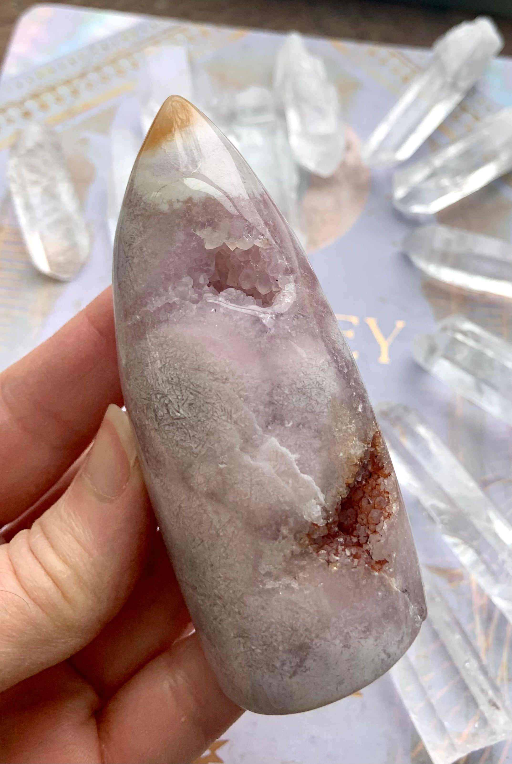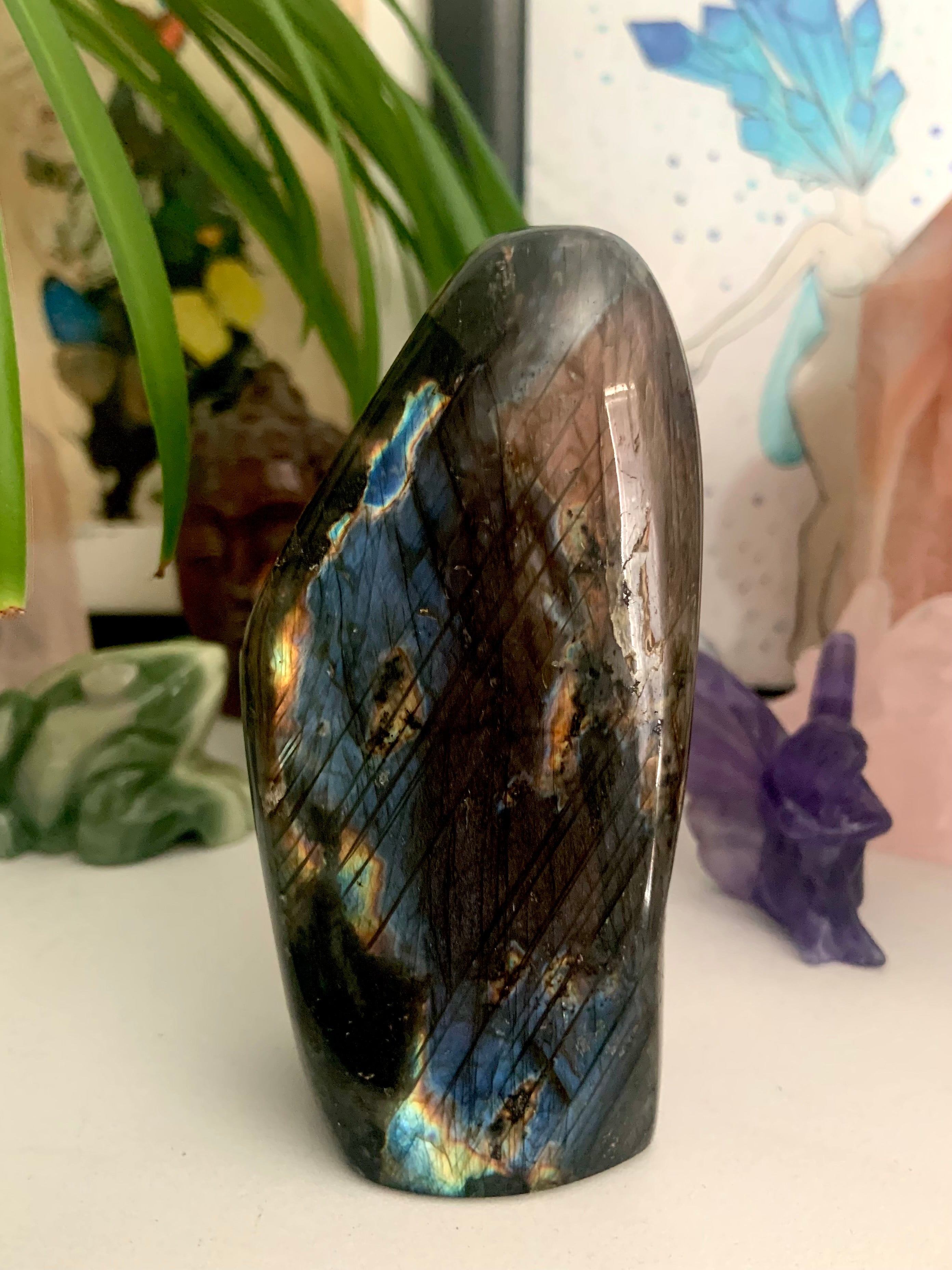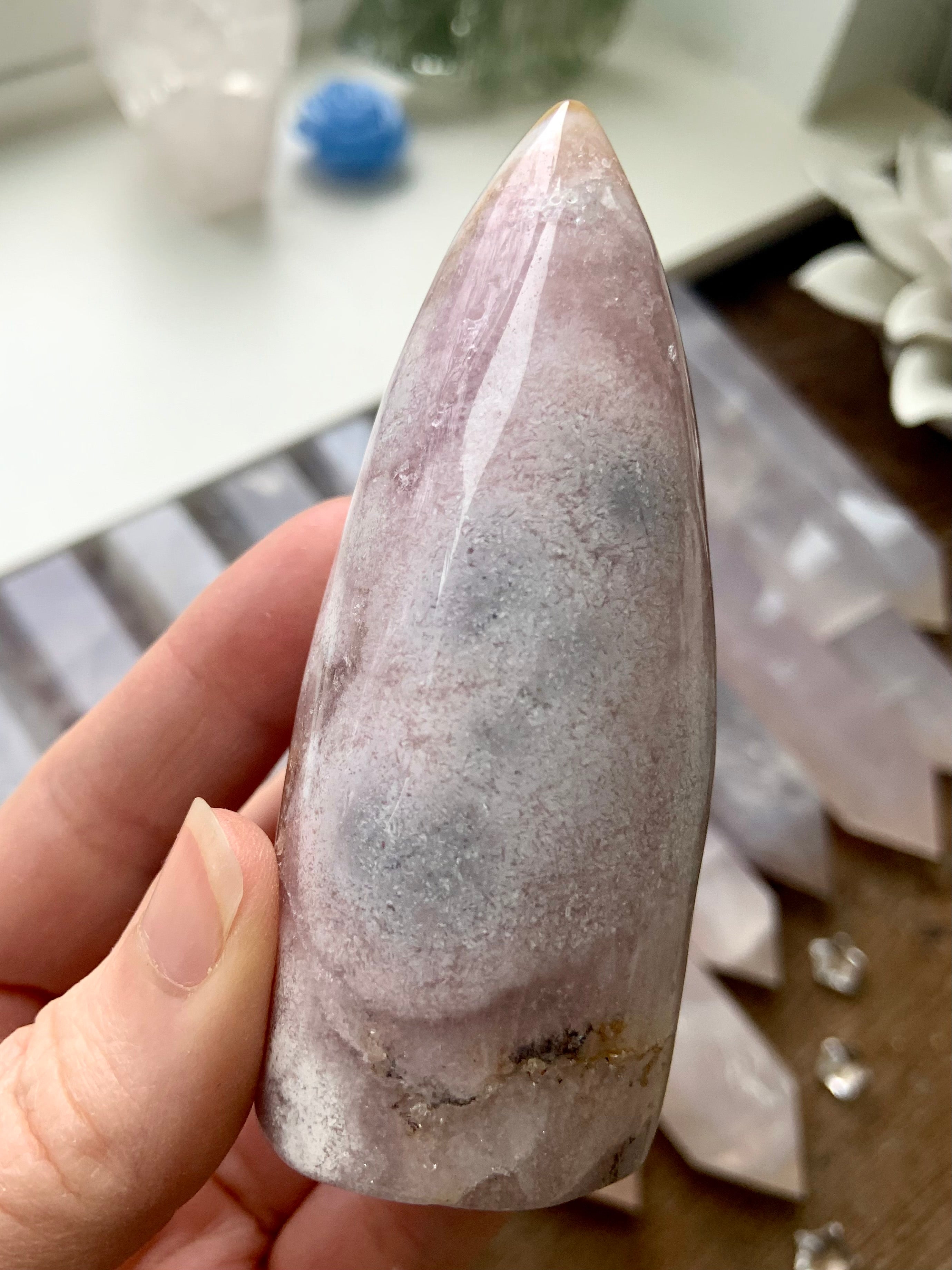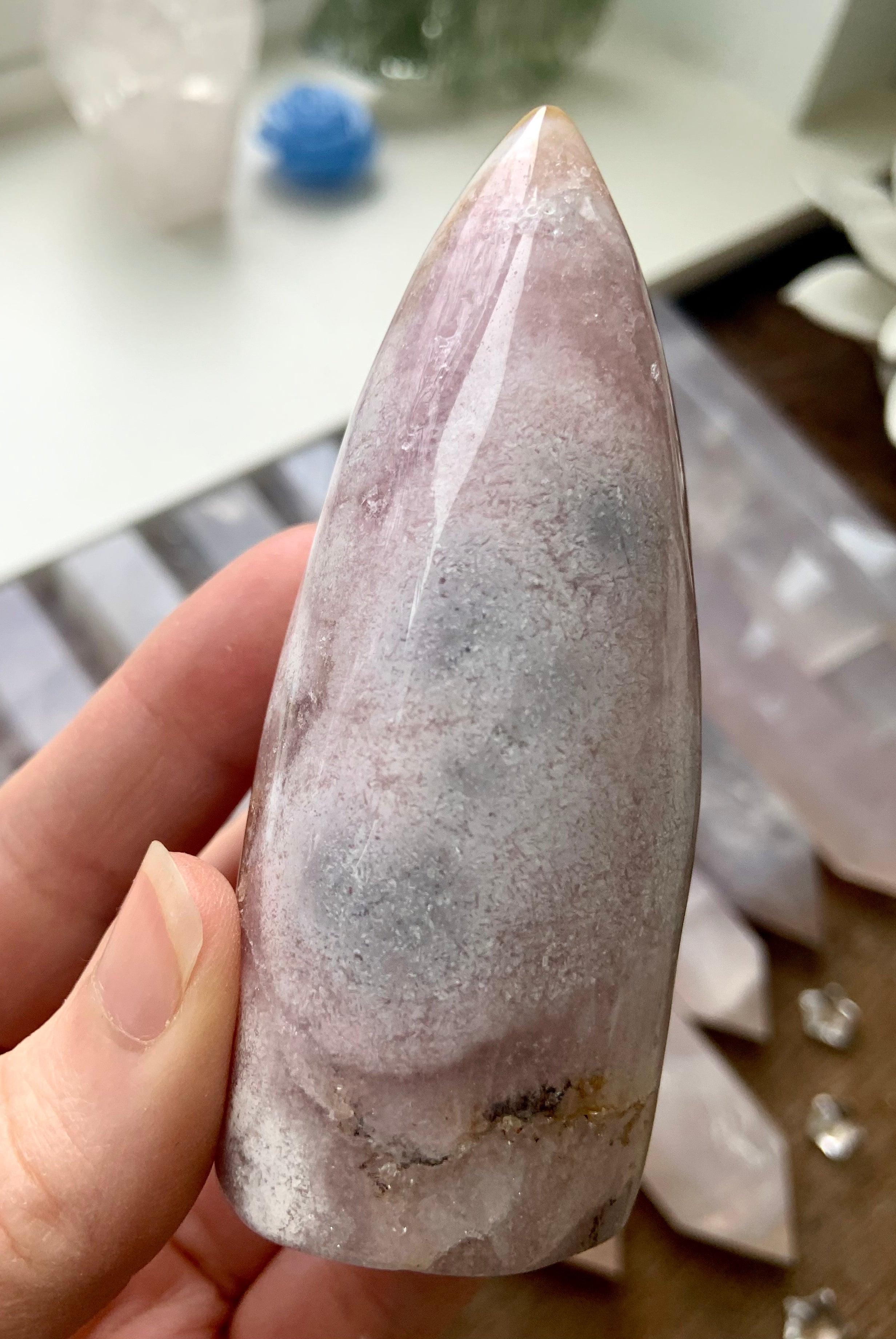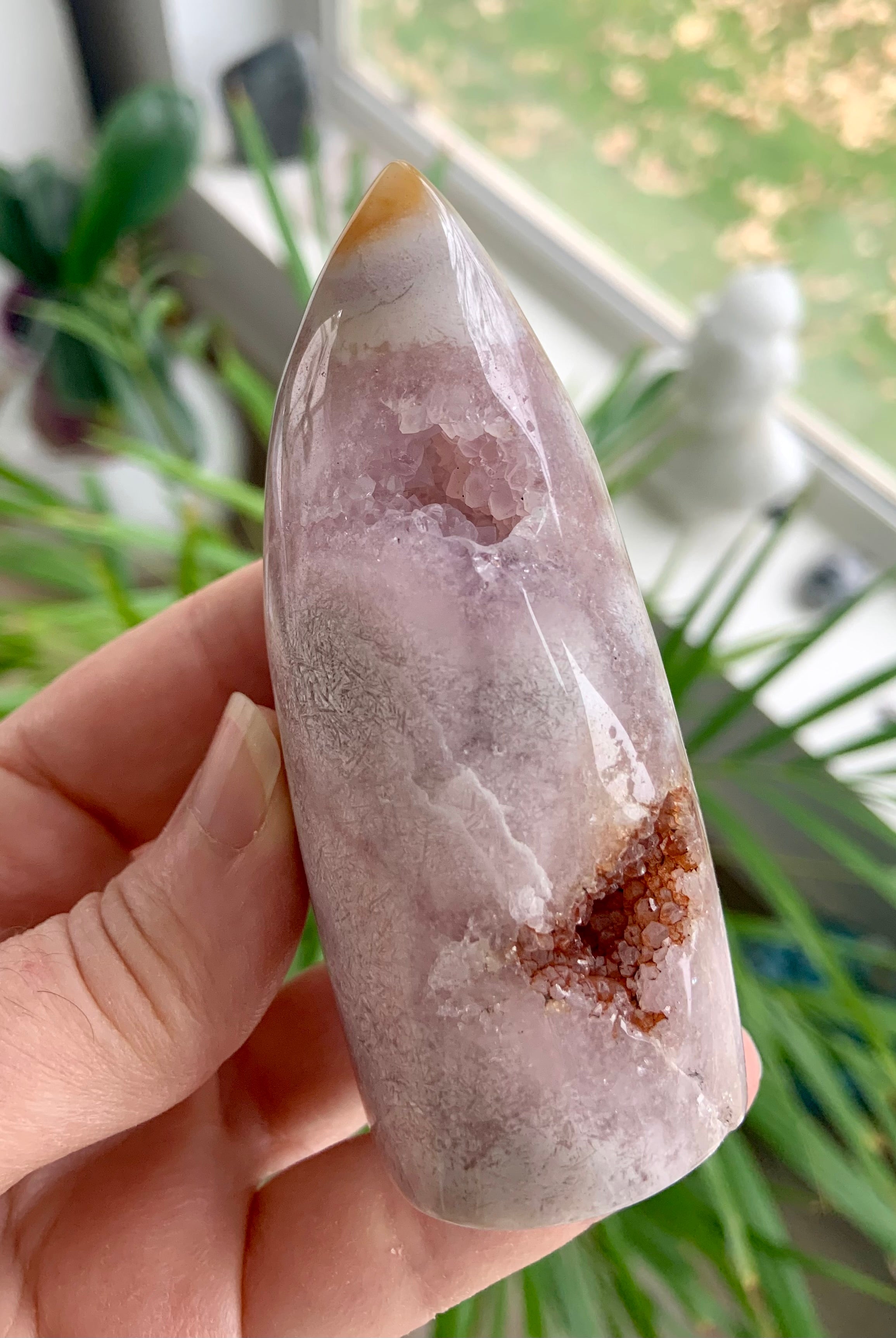 Crafted from high-vibrational crystals like Garden Quartz, Orca Agate, Rose Quartz, Ocean Jasper, Fire Quartz, and Labradorite, these one-of-a-kind, hand shaped pieces bring powerful presence and energy to any space. Freeforms capture the raw elegance of the Earth, while flame carvings symbolize transformation, passion, and the spark of inner power.