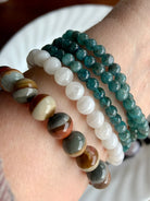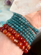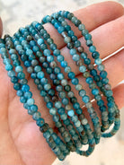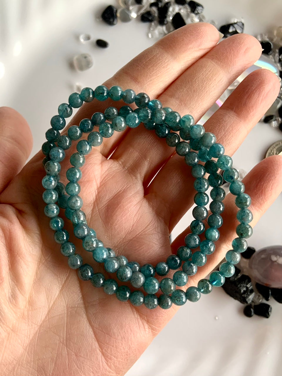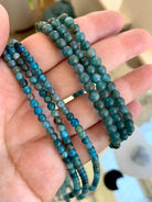 This Blue Apatite Bead Strand has been strung on stretchy cord + can be worn as a necklace or triple wrapped around the wrist as a 3-strand wrap bracelet.