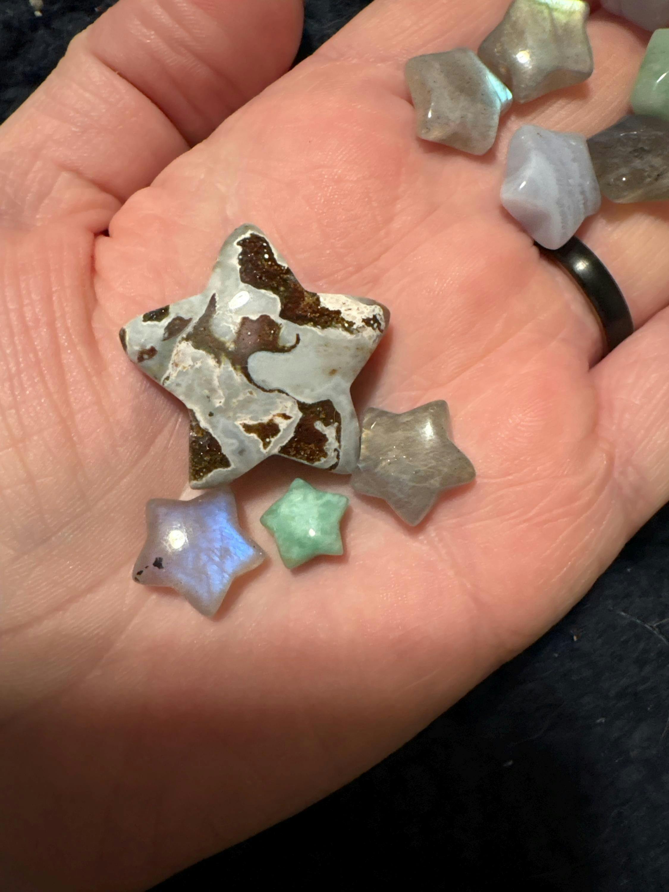 These little hand carved stars are intuitively chosen for you. Pictures show the sizes mixed together, in different lighting + some fun ways you can use these little minis in your crystal display + your crystal grids. These crystals are natural gifts from Gaia with unique variances in shape, size, color hue, saturation + flash.