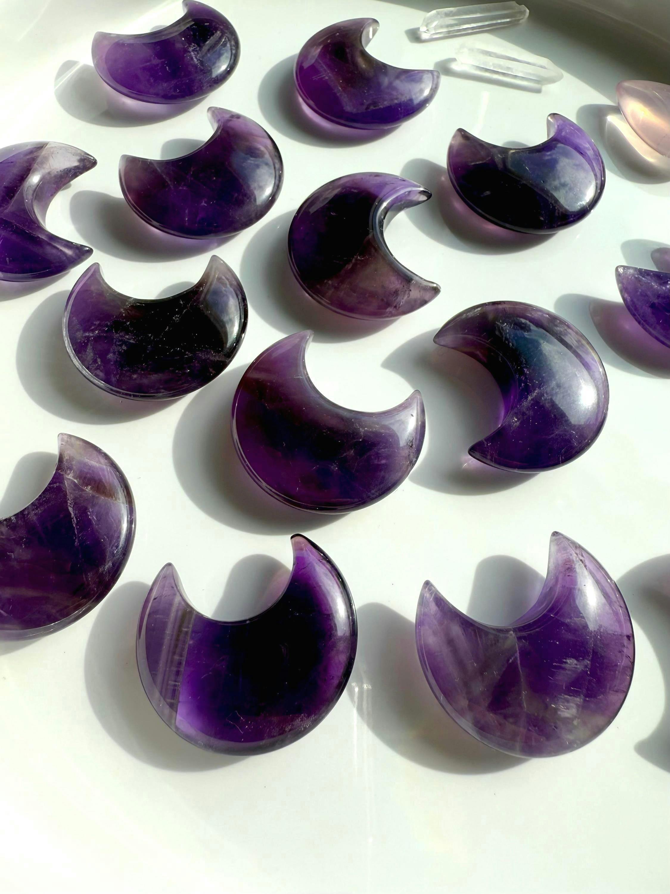 Bring one of these high quality deep purple Smokey Dream Amethyst Crescent Moons into your crystal collection for enhanced intuition + peaceful vibes that promote spiritual growth.