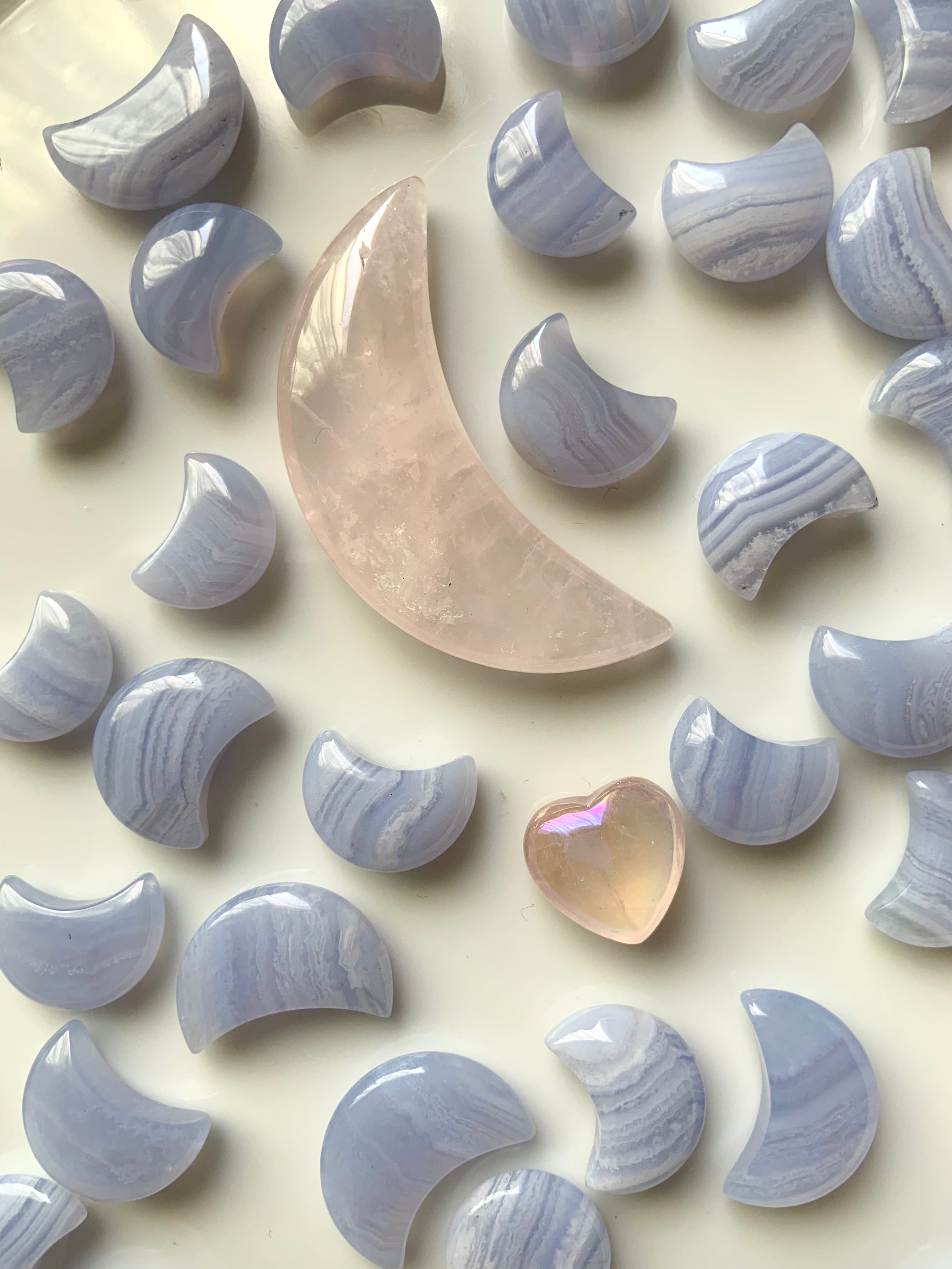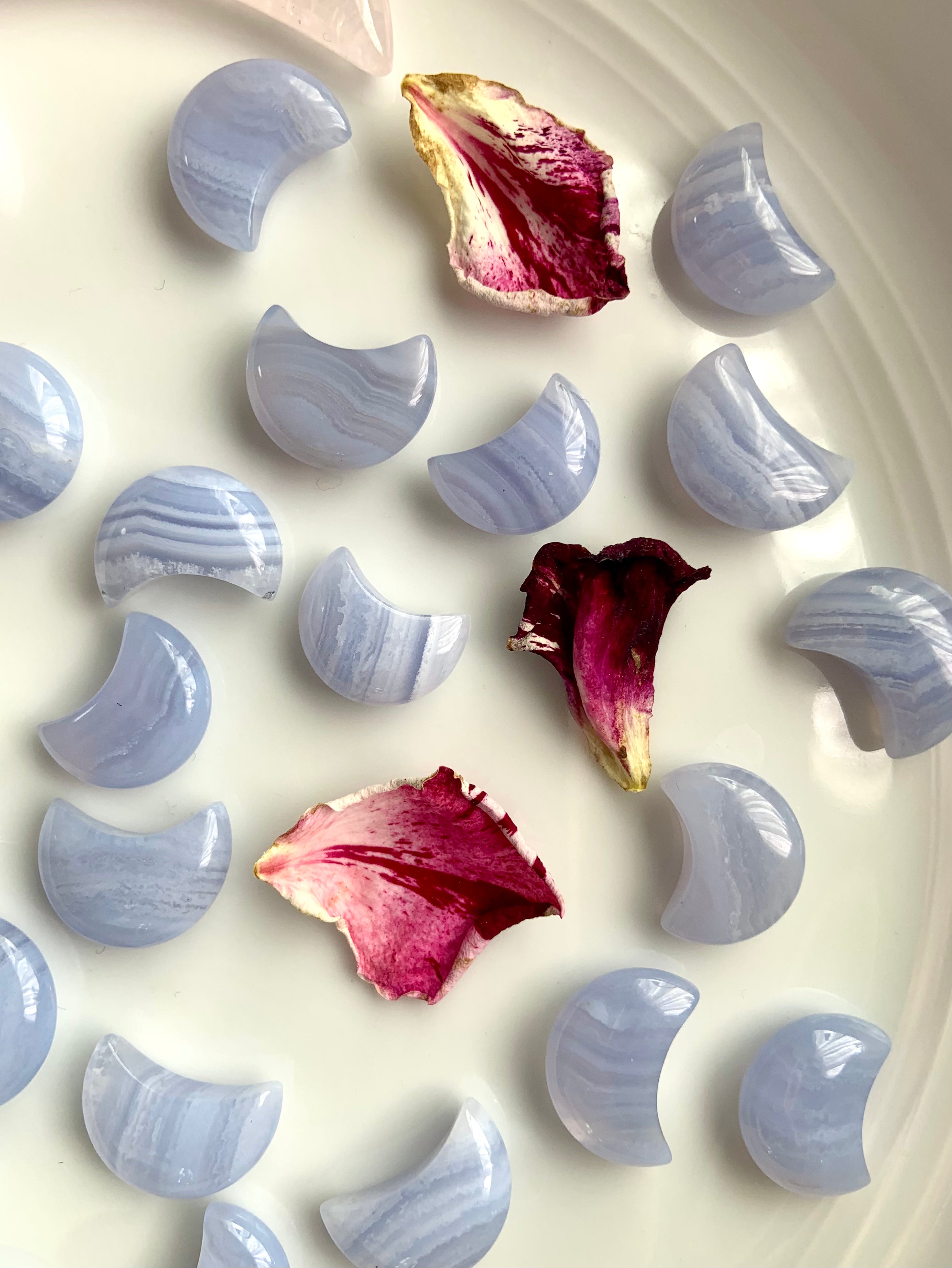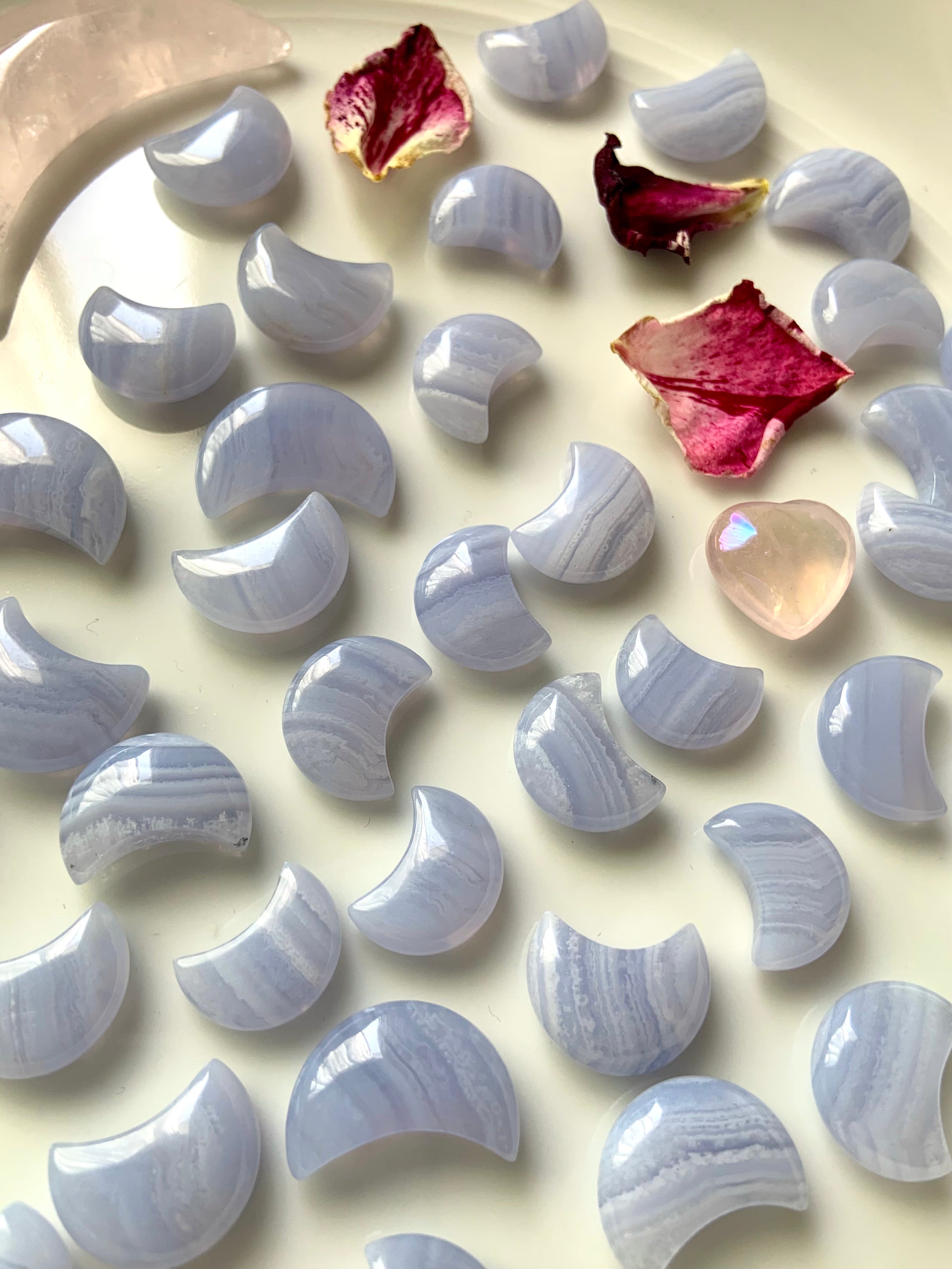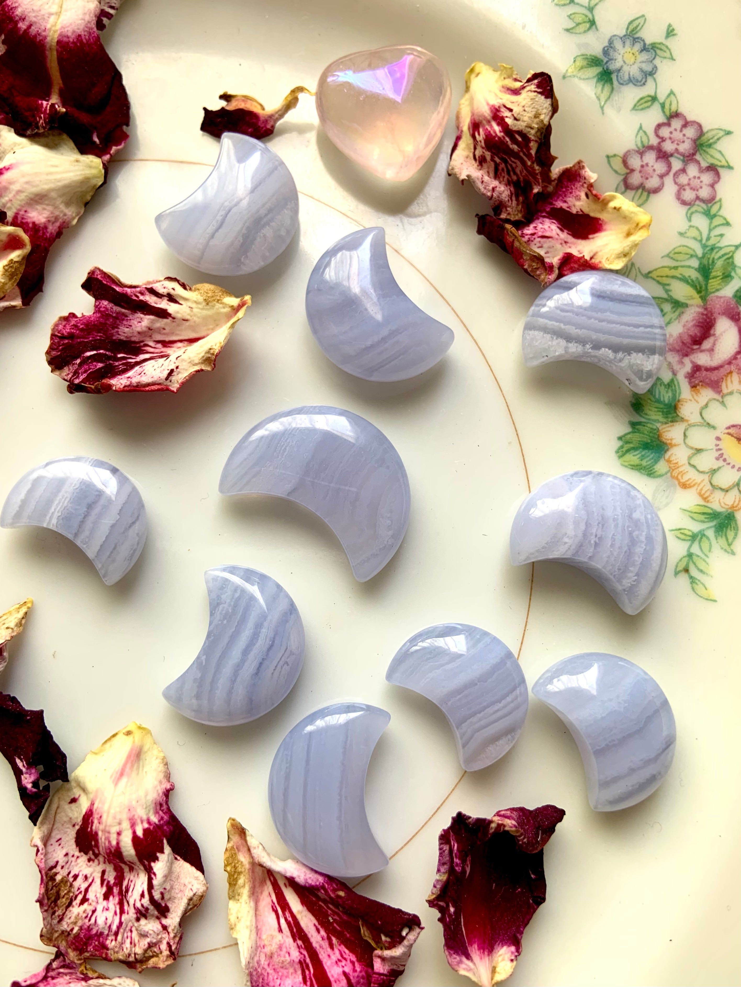 Use these beautiful pretty Blue Lace Agate Crystal Moons to decorate your sacred space! Feature in your crystal grids + crystal display or decorate your desk, inspire journaling or meditation, in moon rituals, to adorn your altar space, to accent your crystal collection, or floating in your jewelry box.