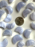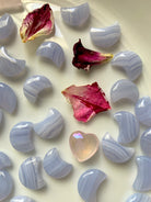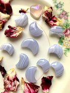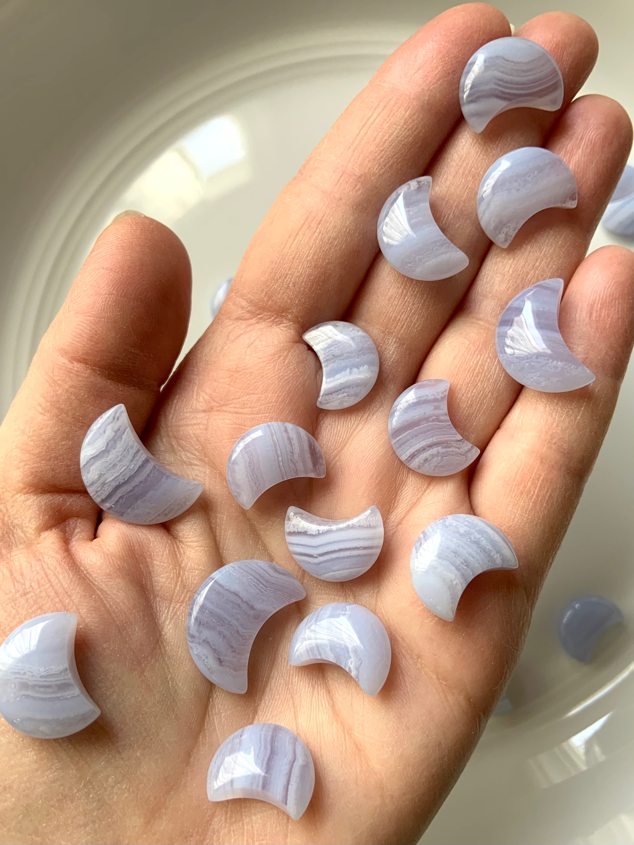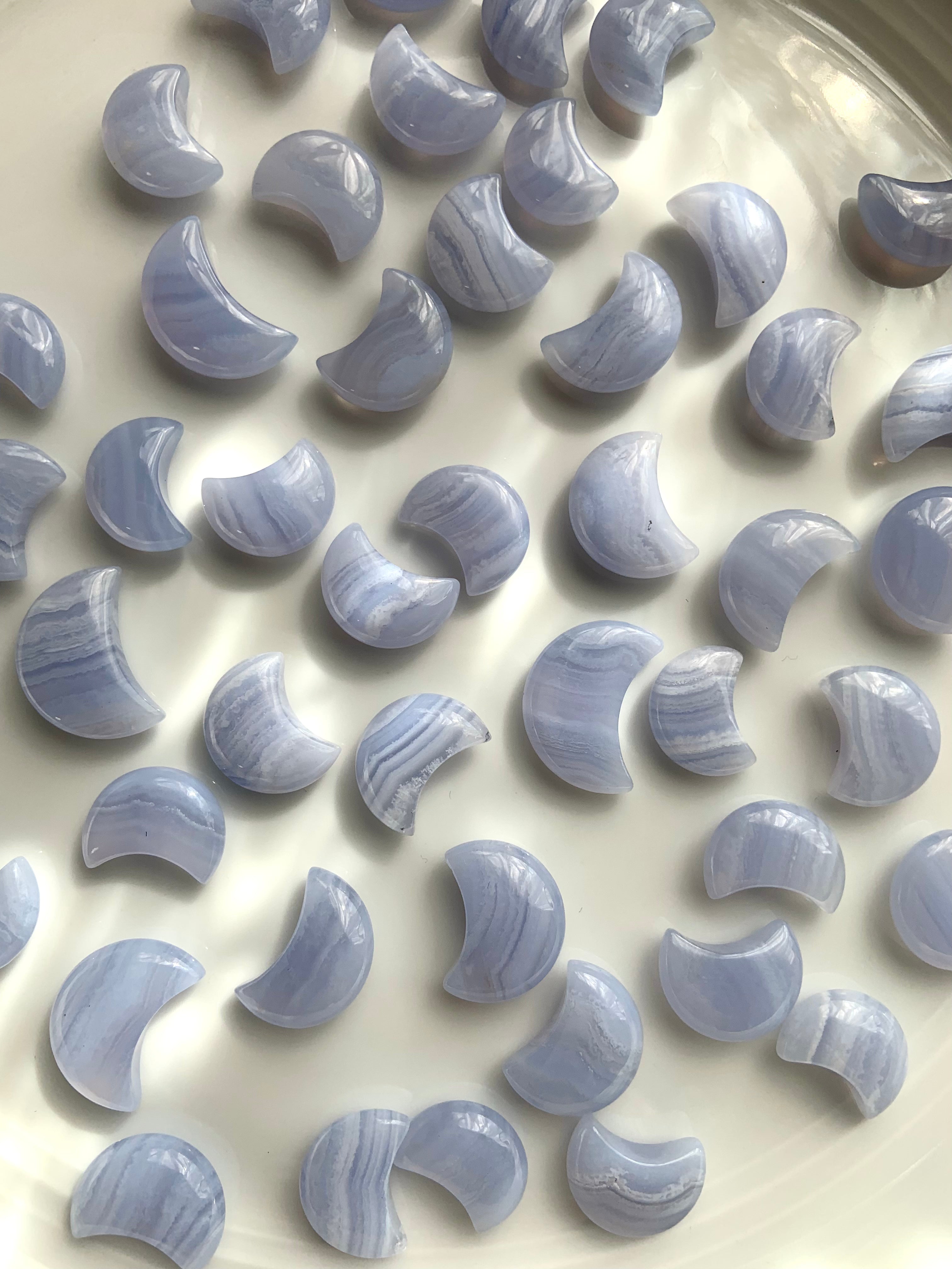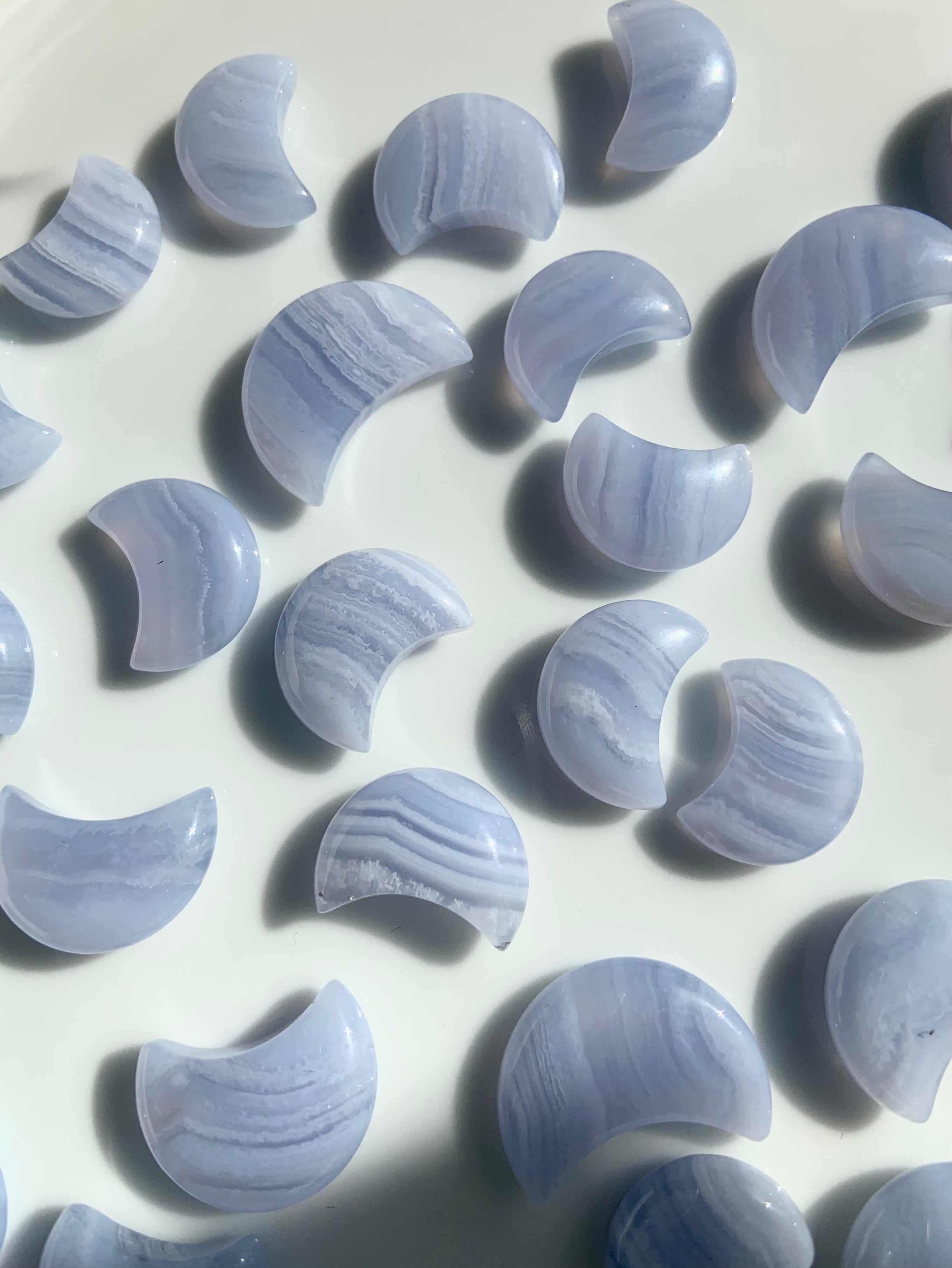 Use these beautiful pretty Blue Lace Agate Crystal Moons to decorate your sacred space! Feature in your crystal grids + crystal display or decorate your desk, inspire journaling or meditation, in moon rituals, to adorn your altar space, to accent your crystal collection, or floating in your jewelry box.