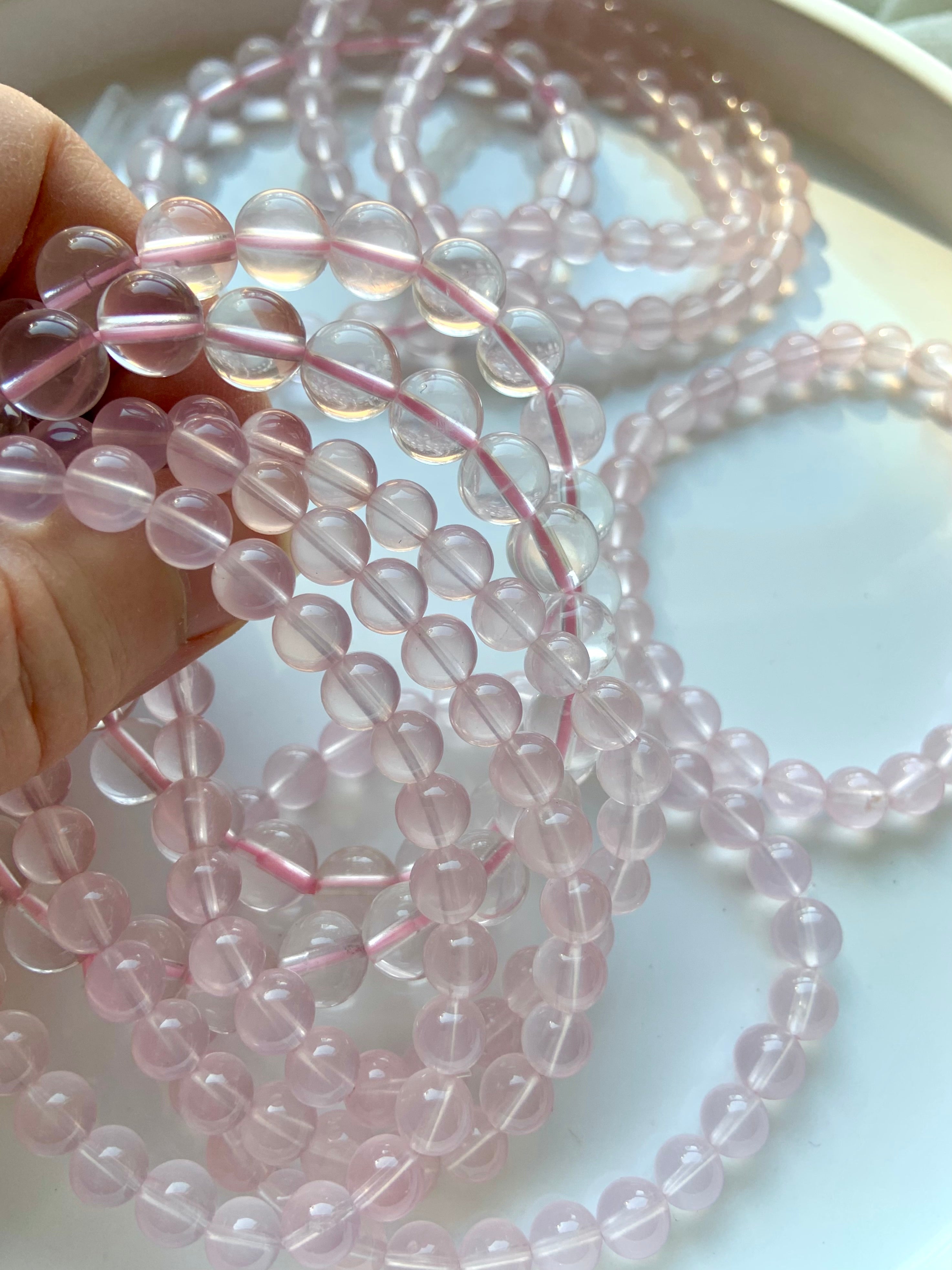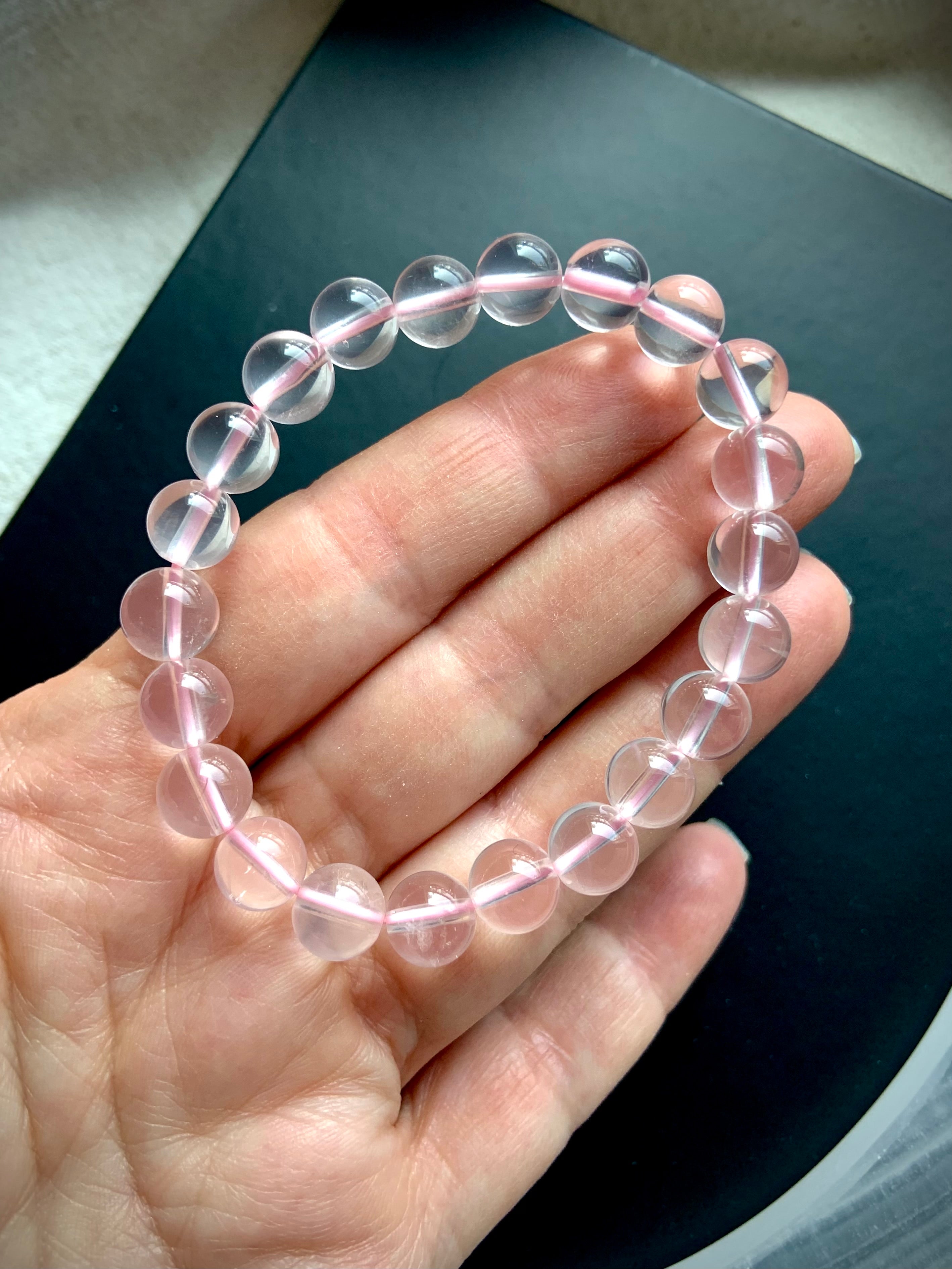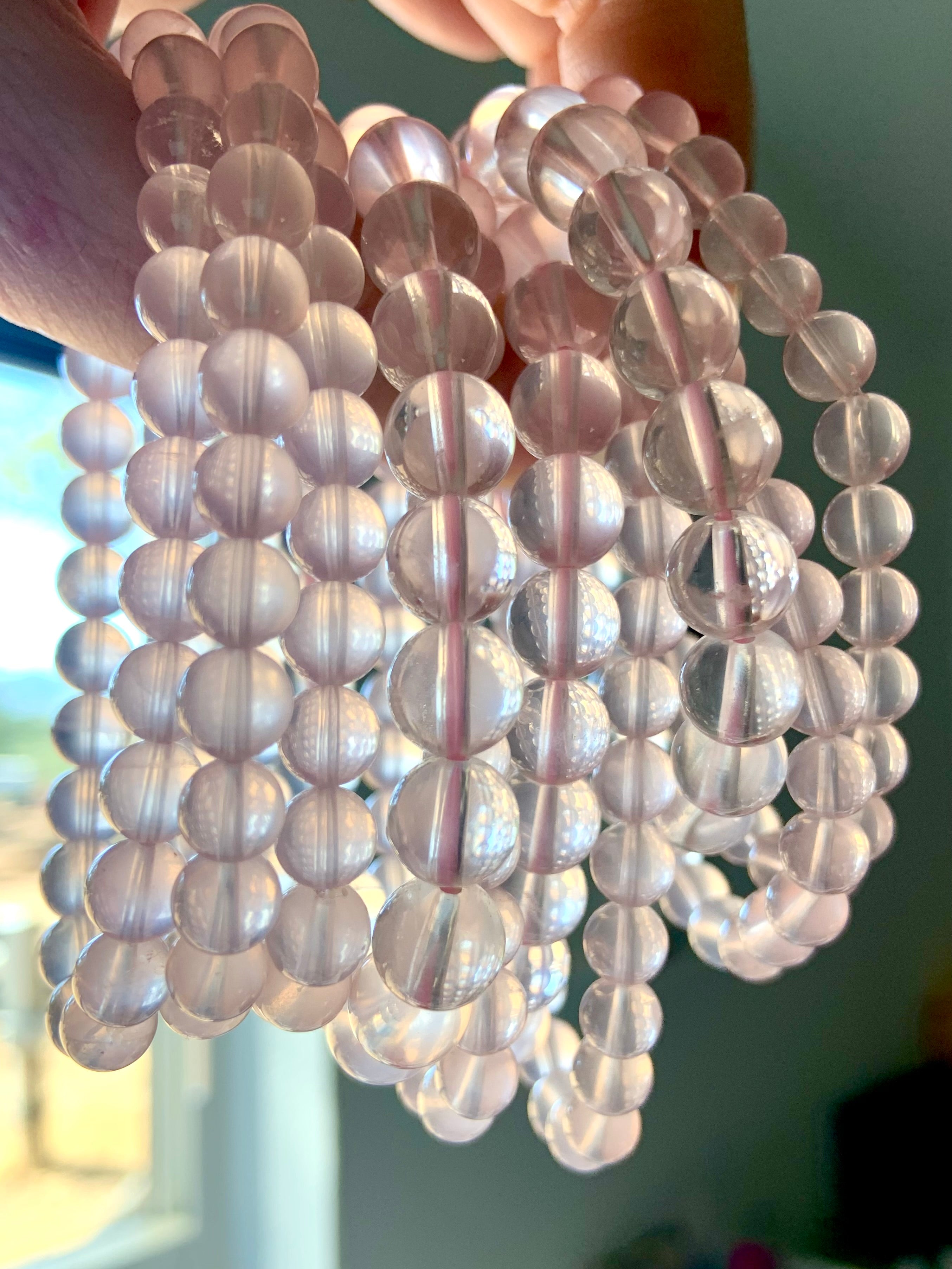 When your heart needs a hug, wear your luminous, gemmy Star Rose Quartz bracelet + be wrapped in it's soothing energy. These super high quality transparent pink Rose Quartz beads from Mozambique have the milky translucence of Girasol quartz + cats eye asterism when held to a strong light source.