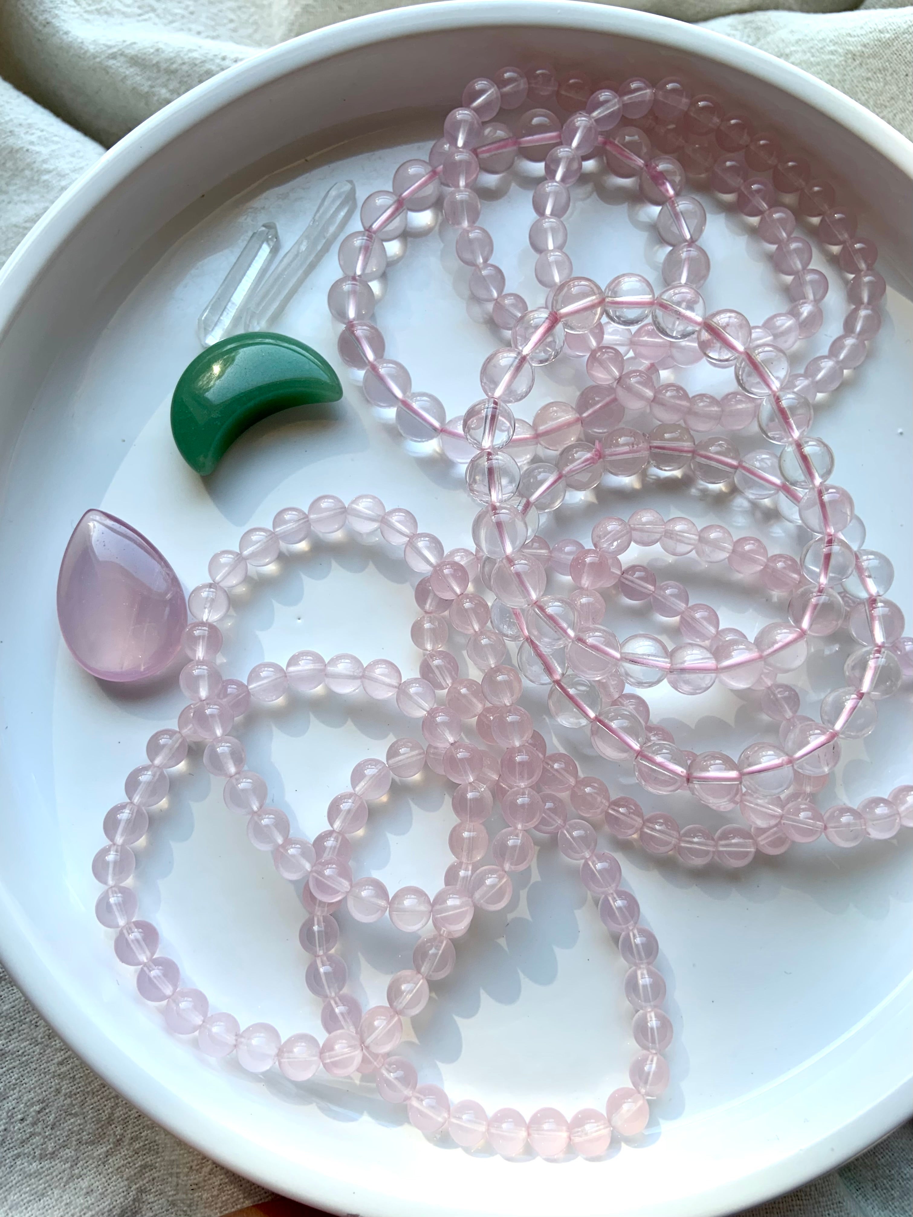 Wearing a Rose Quartz Bracelet can be helpful to calm anxiety + release your stresses. The energy of Rose Quartz is heart-warming, heart-centered + so gentle.
