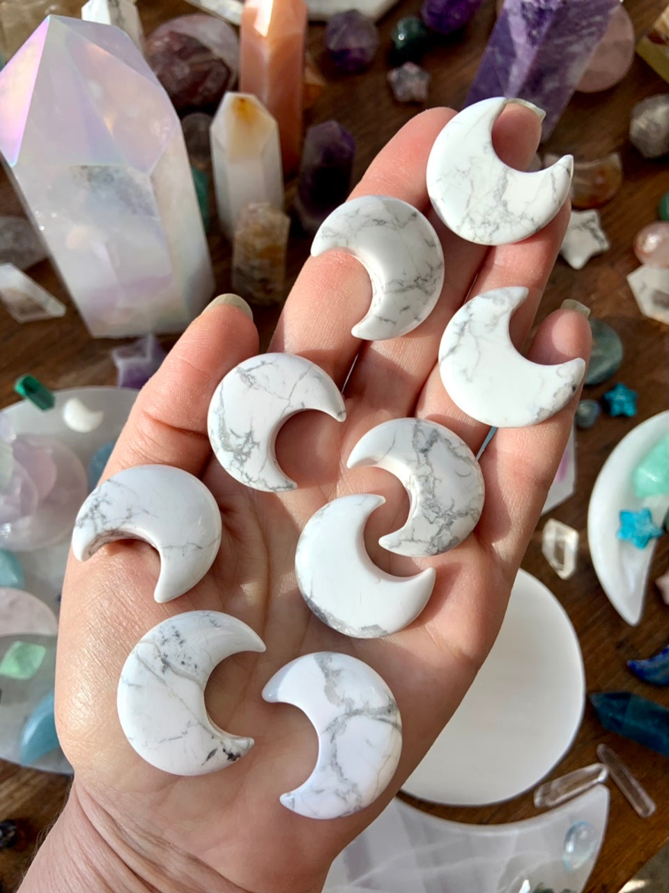 Add a soothing Howlite Crescent Moon to your crystal collection. Howlite has a peaceful energy that is calming + expansive. Howlite is an excellent crystal to meditate with when you're feeling anxious or stressed out.