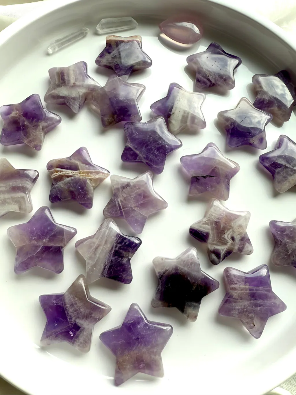 Crystal Stars are symbolic of divine guidance + protection, as well as imagination, wonder, dreams + magic. These dream amethyst crystal stars make a unique addition to your crystal collection. Use them in your crystal grids, moon rituals, or just floating in your jewelry box.