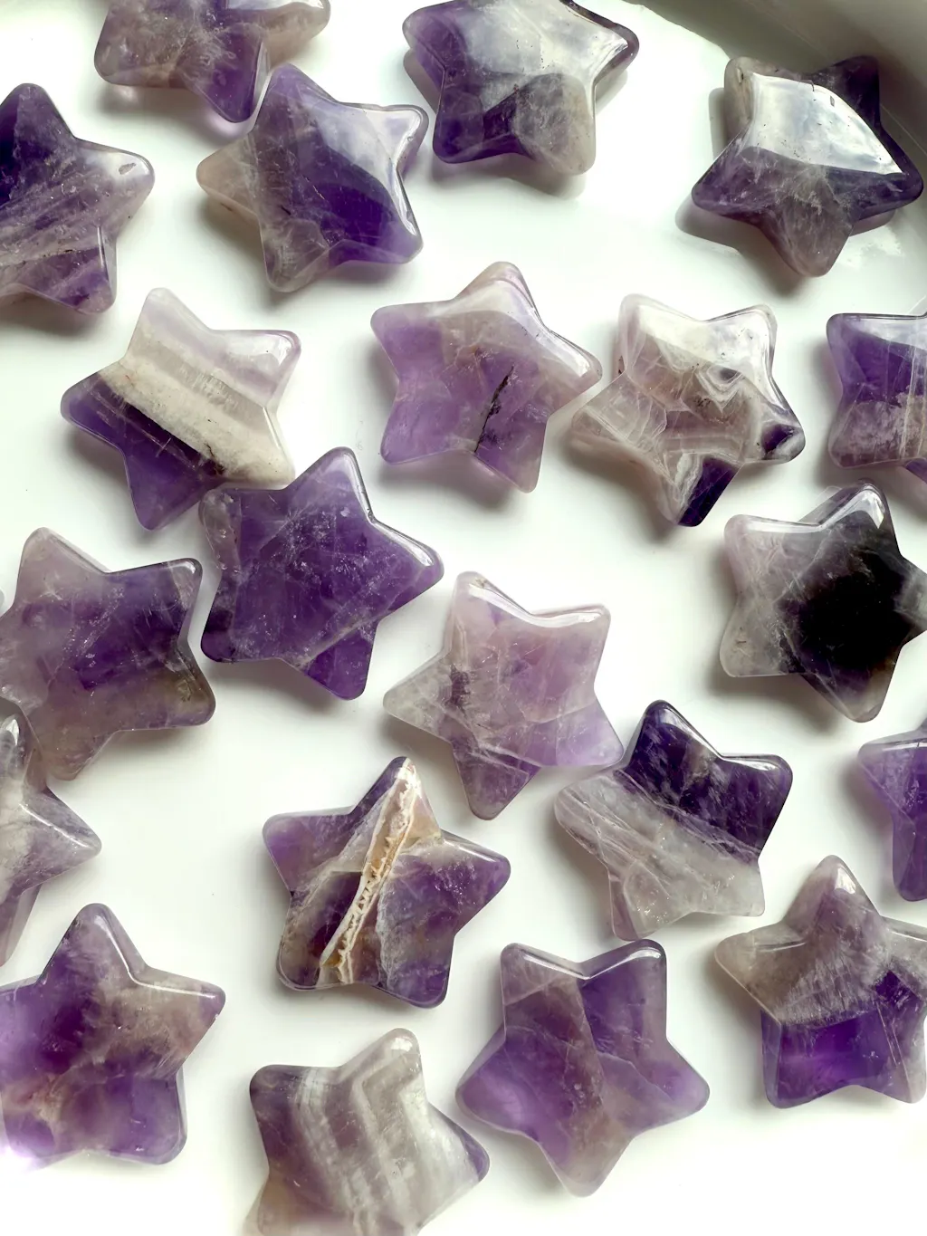 These stars vary in shape, pattering, color saturation + clarity as shown in pics. Each stone is uniquely beautiful + powerful + will be intuitively chosen for you.