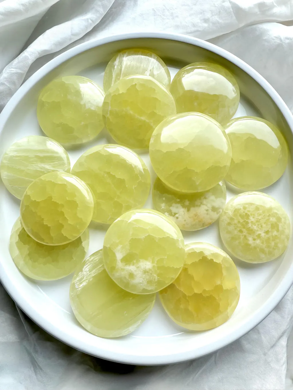 - Polished Lemon Calcite meditation discs with soft lemon-lime yellow coloring