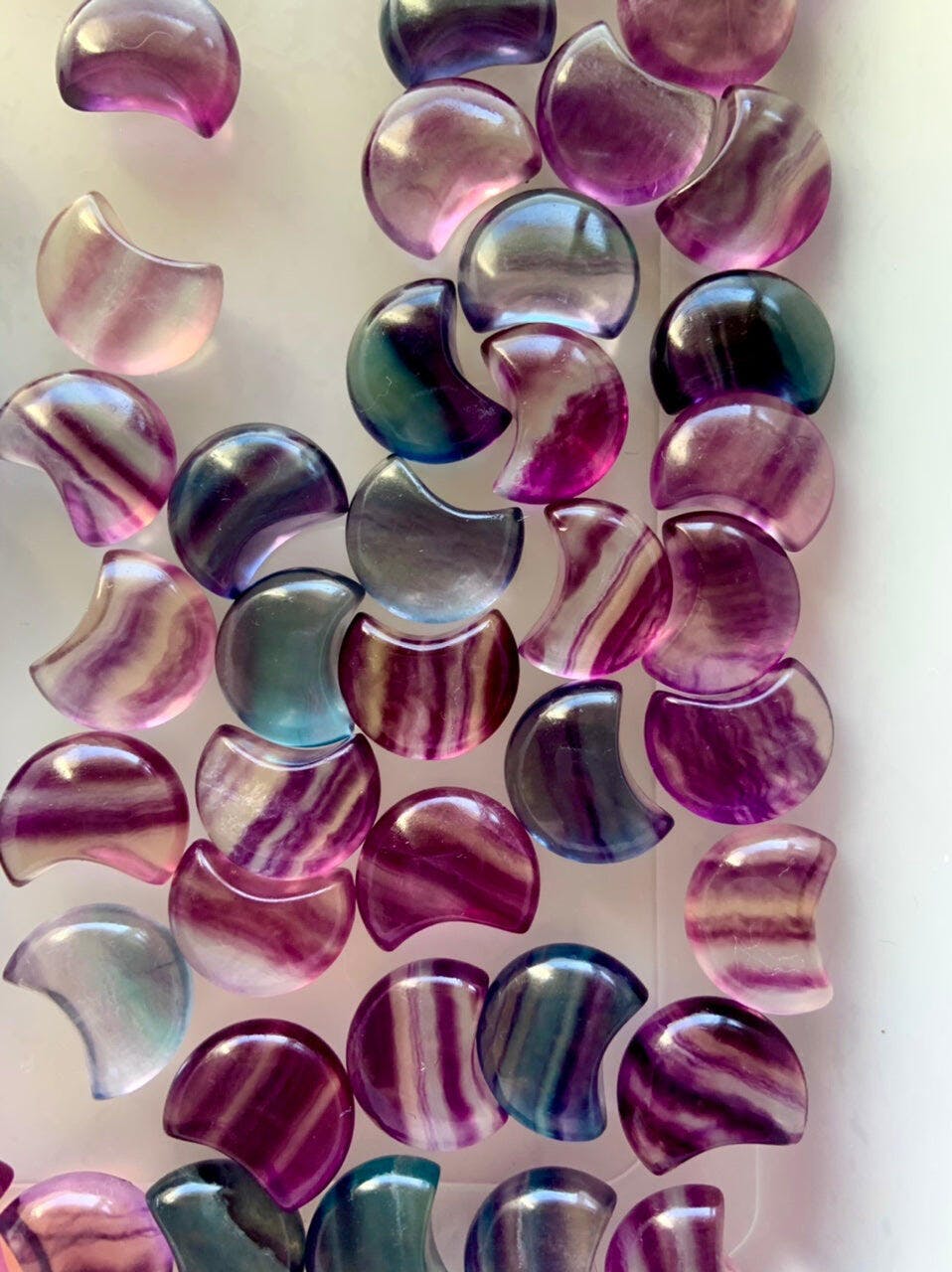Fluorite crystals have a grounding + harmonizing spiritual energy coming through in the clear, blue, teal, magenta, purple colors + undulating patterns in the natural stone. Sprinkle a little celestial magic into your world with these beautiful multicolored gemstone moons.