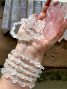 These bracelets are made from clear quartz carved flower beads with a flat shape about 10mm diameter, 5-7mm thick. The clear quartz spacer beads in between the flowers are 6mm. The quartz crystal has a lot of variation between the beads ranging from water clear to milky + everywhere in between. The bracelet is made with stretchy cord, wrist sizes are in the dropdown menu.